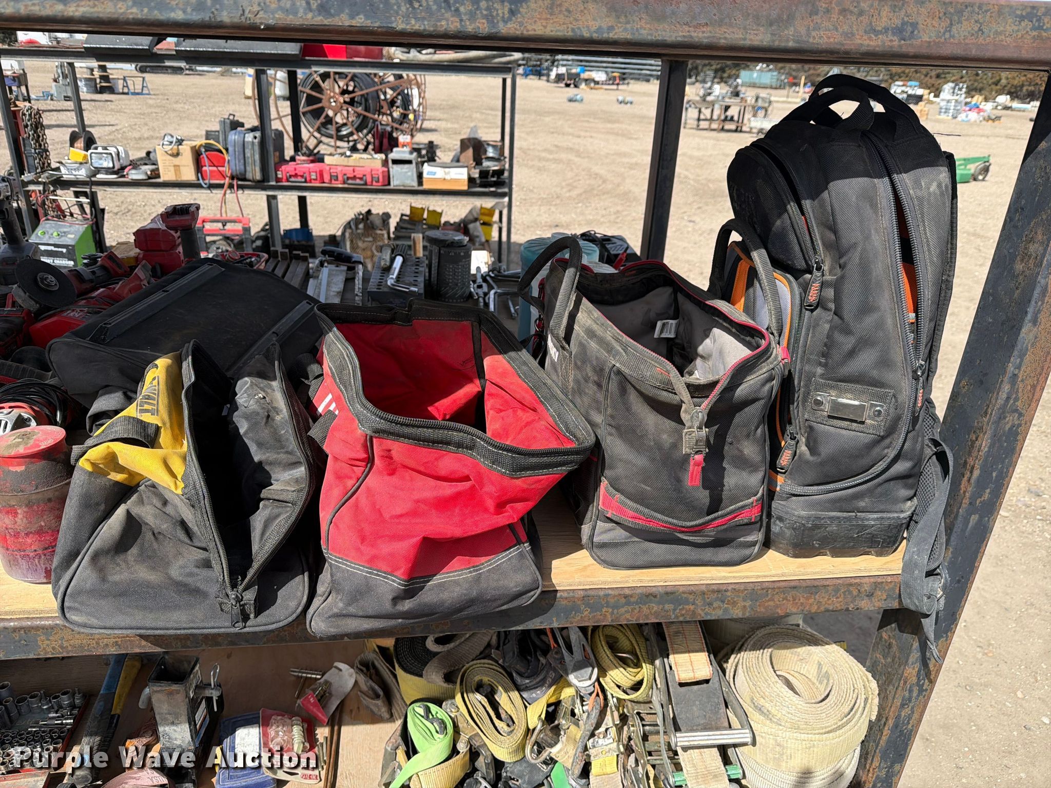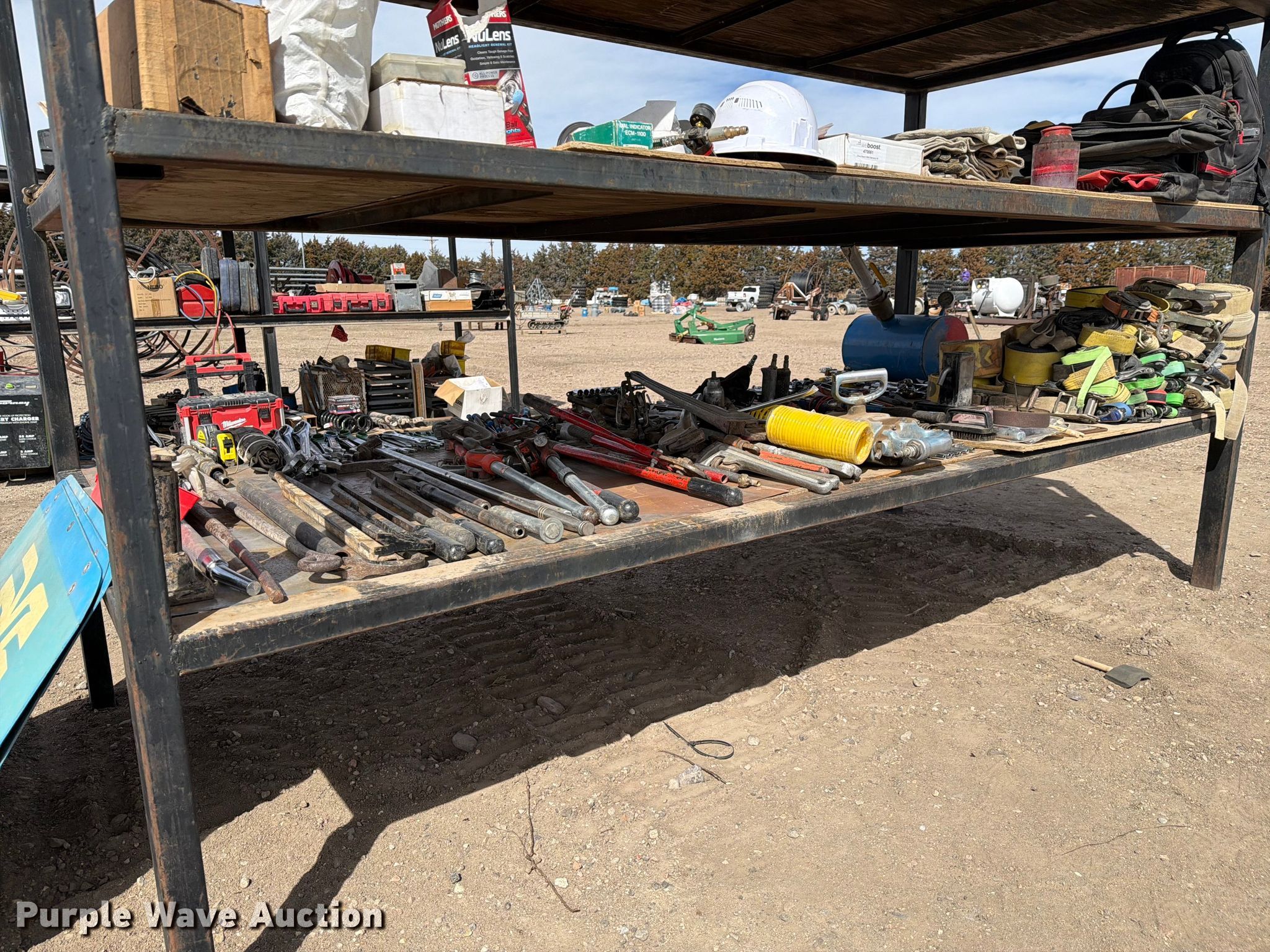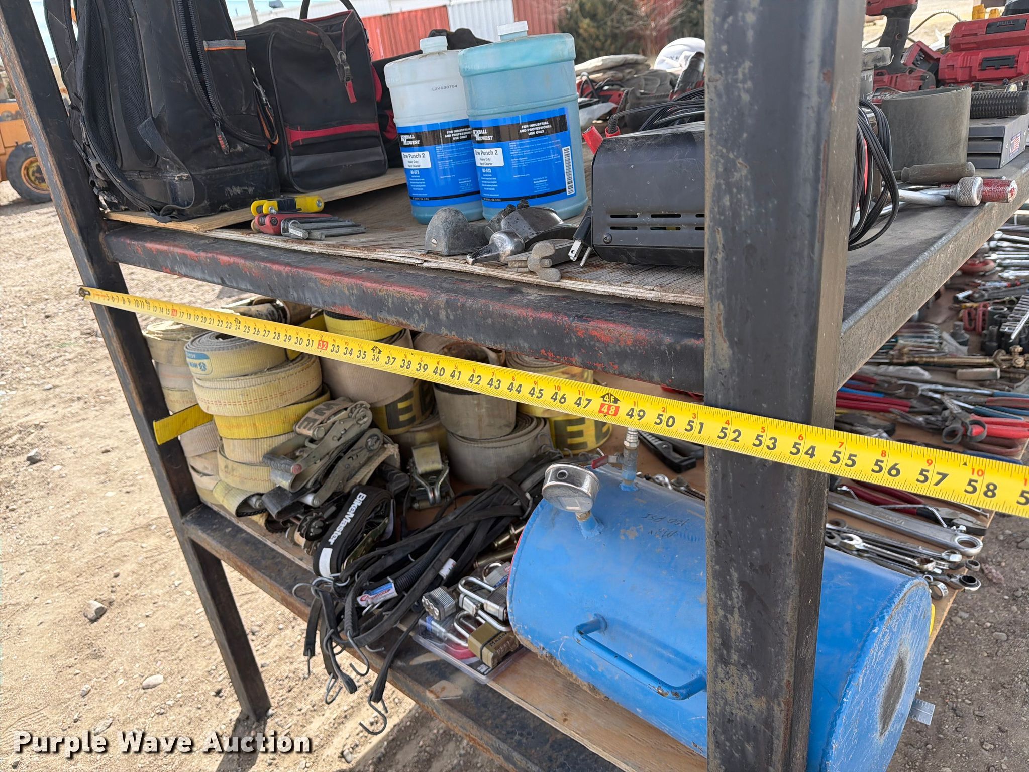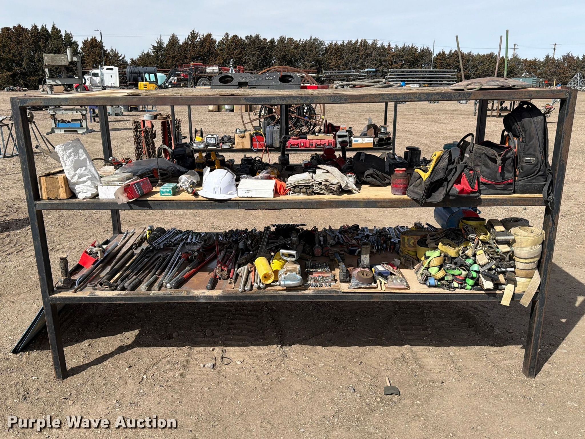 Tools. Power Tools, Drill bits, Hand saws, Battery chargers, Hand cleaner, Tool bags, Welding gloves, Wrenches, Bolt cutters, Ratchet straps, Air tank, Signs, Shelf size: 124" L x 54" W x 71" H. Notes Unknown operating condition. Western Kansas Ag. Sharon Springs, KS 67758