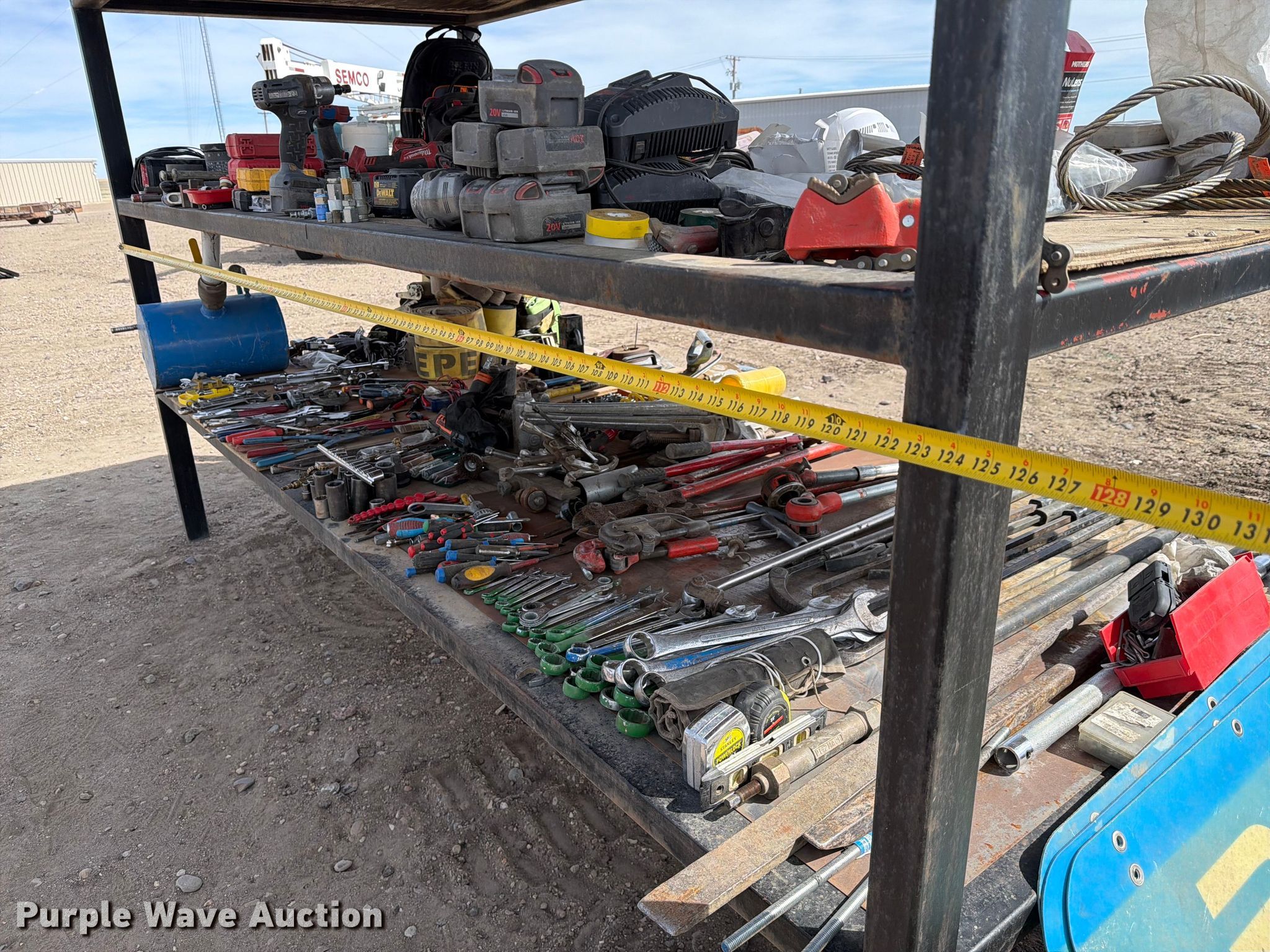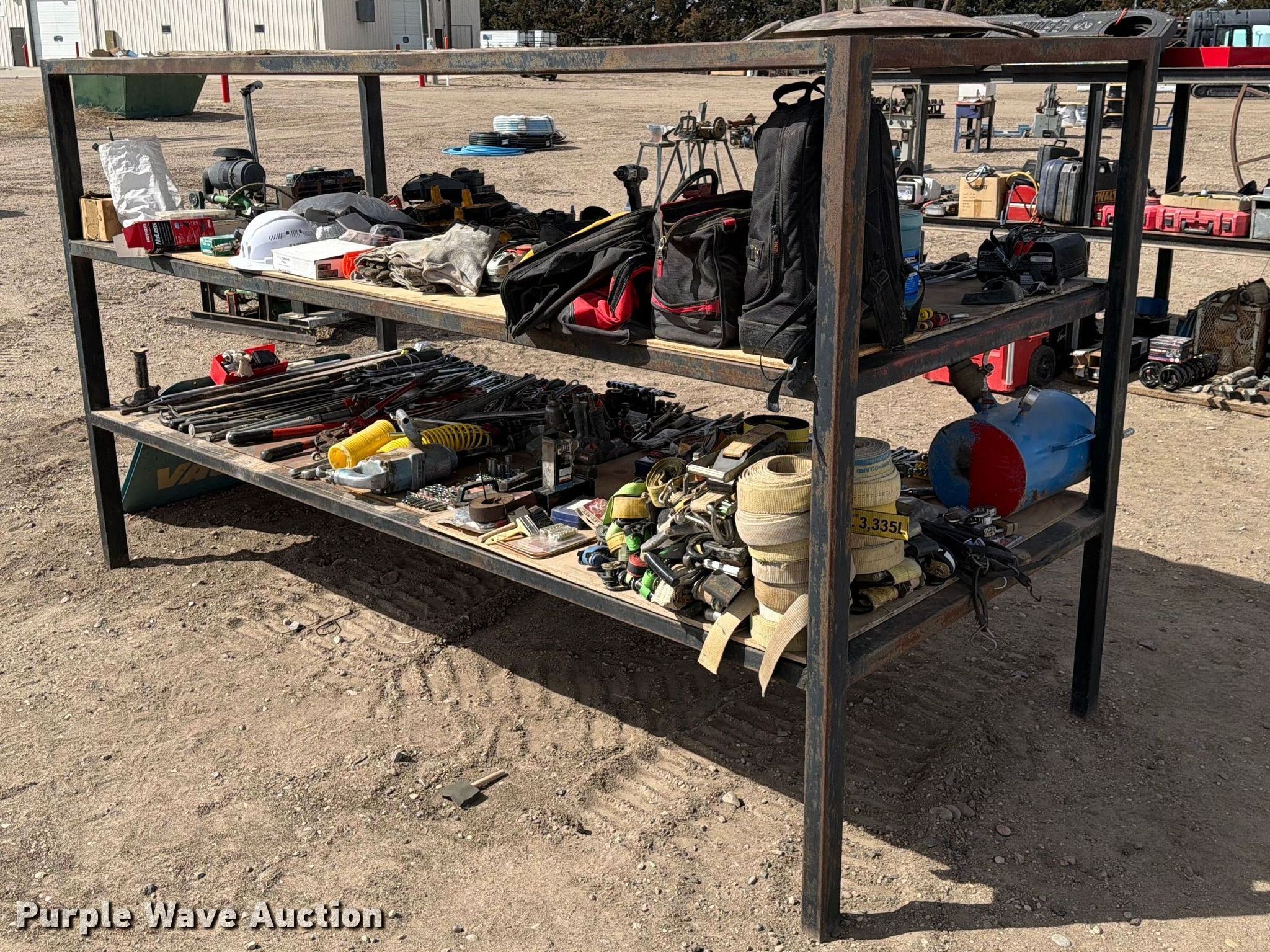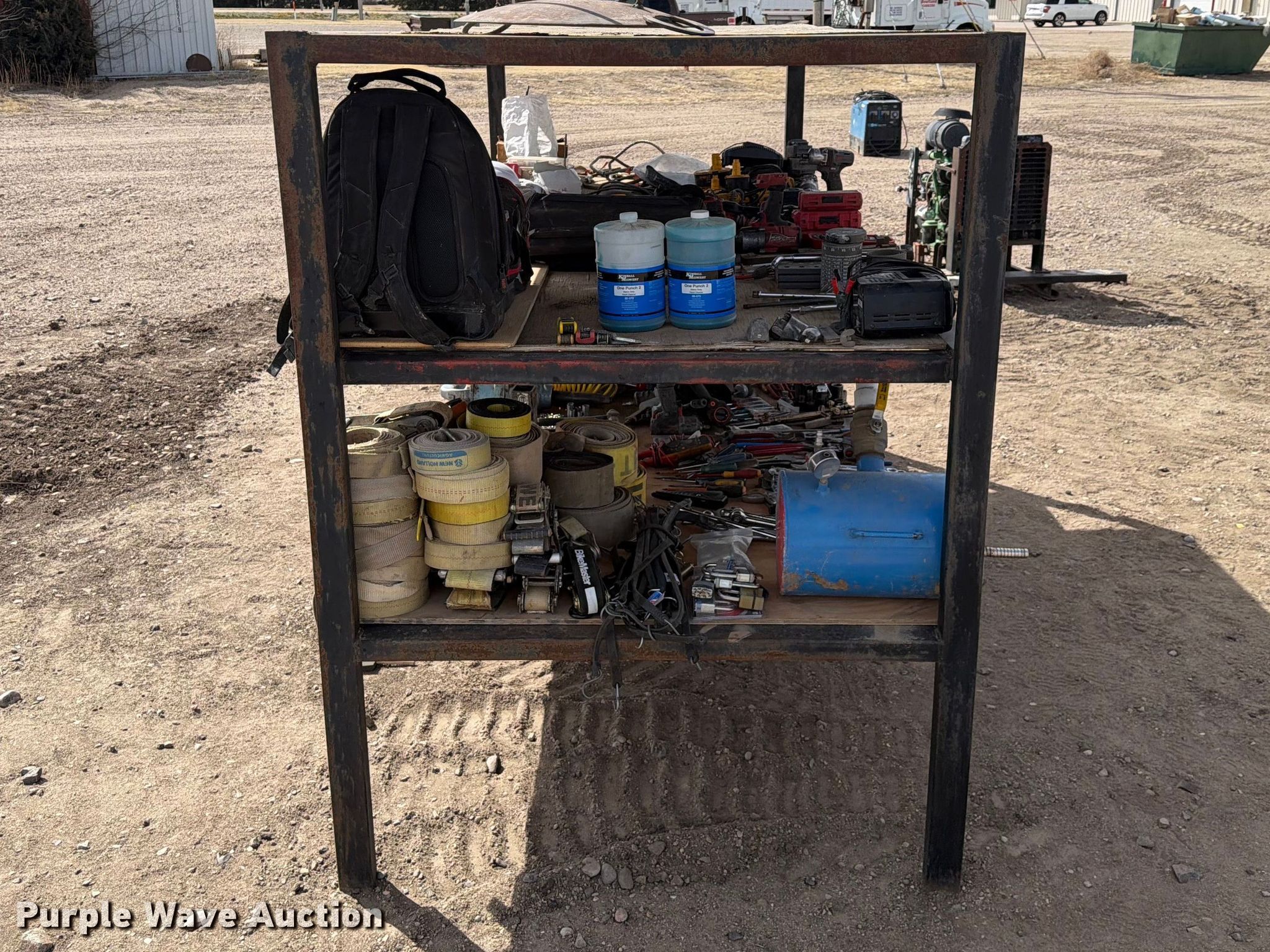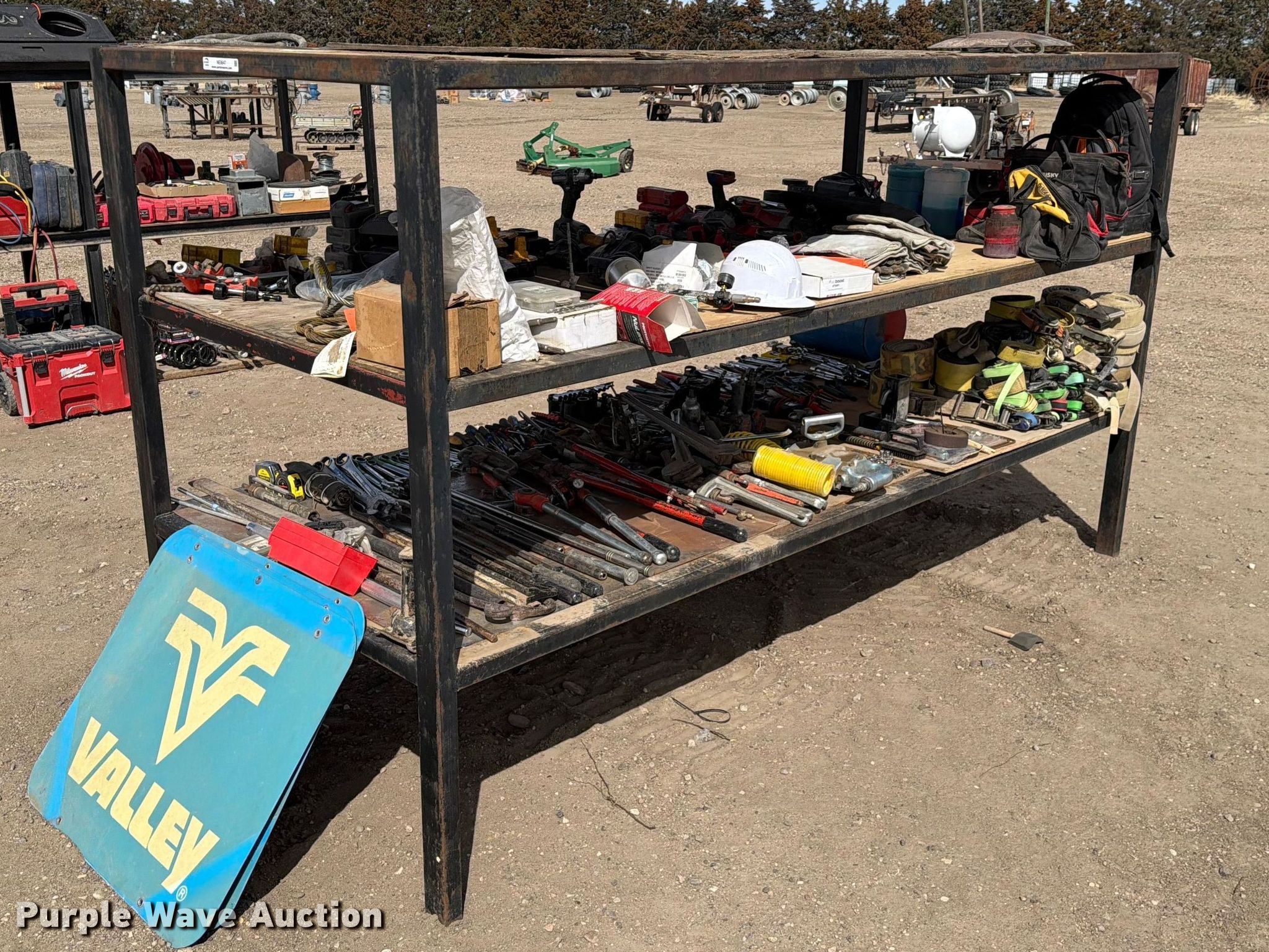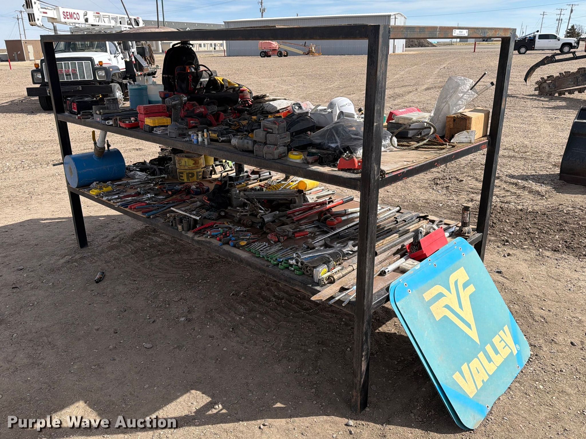 Tools. Power Tools, Drill bits, Hand saws, Battery chargers, Hand cleaner, Tool bags, Welding gloves, Wrenches, Bolt cutters, Ratchet straps, Air tank, Signs, Shelf size: 124" L x 54" W x 71" H. Notes Unknown operating condition. Western Kansas Ag. Sharon Springs, KS 67758