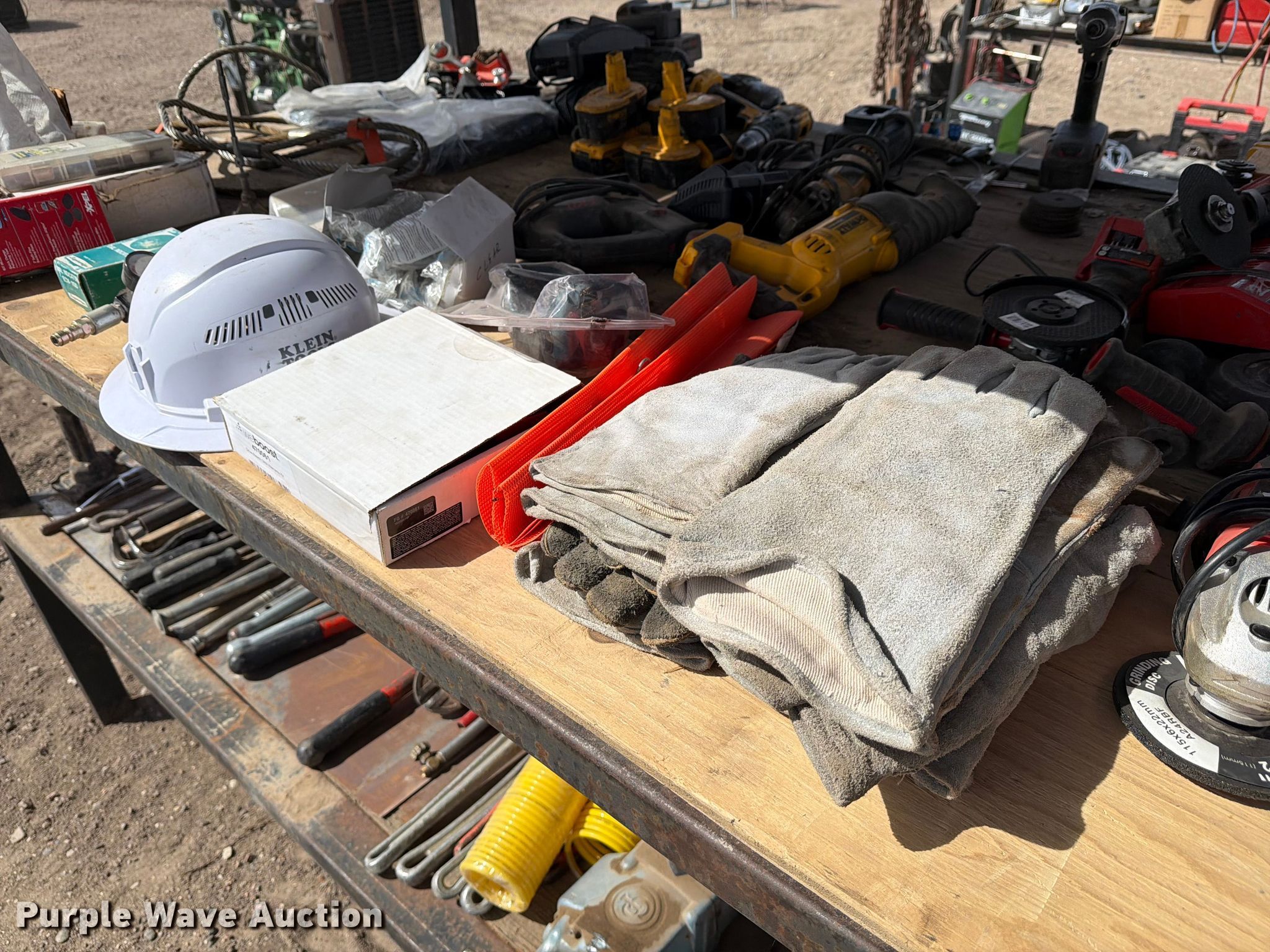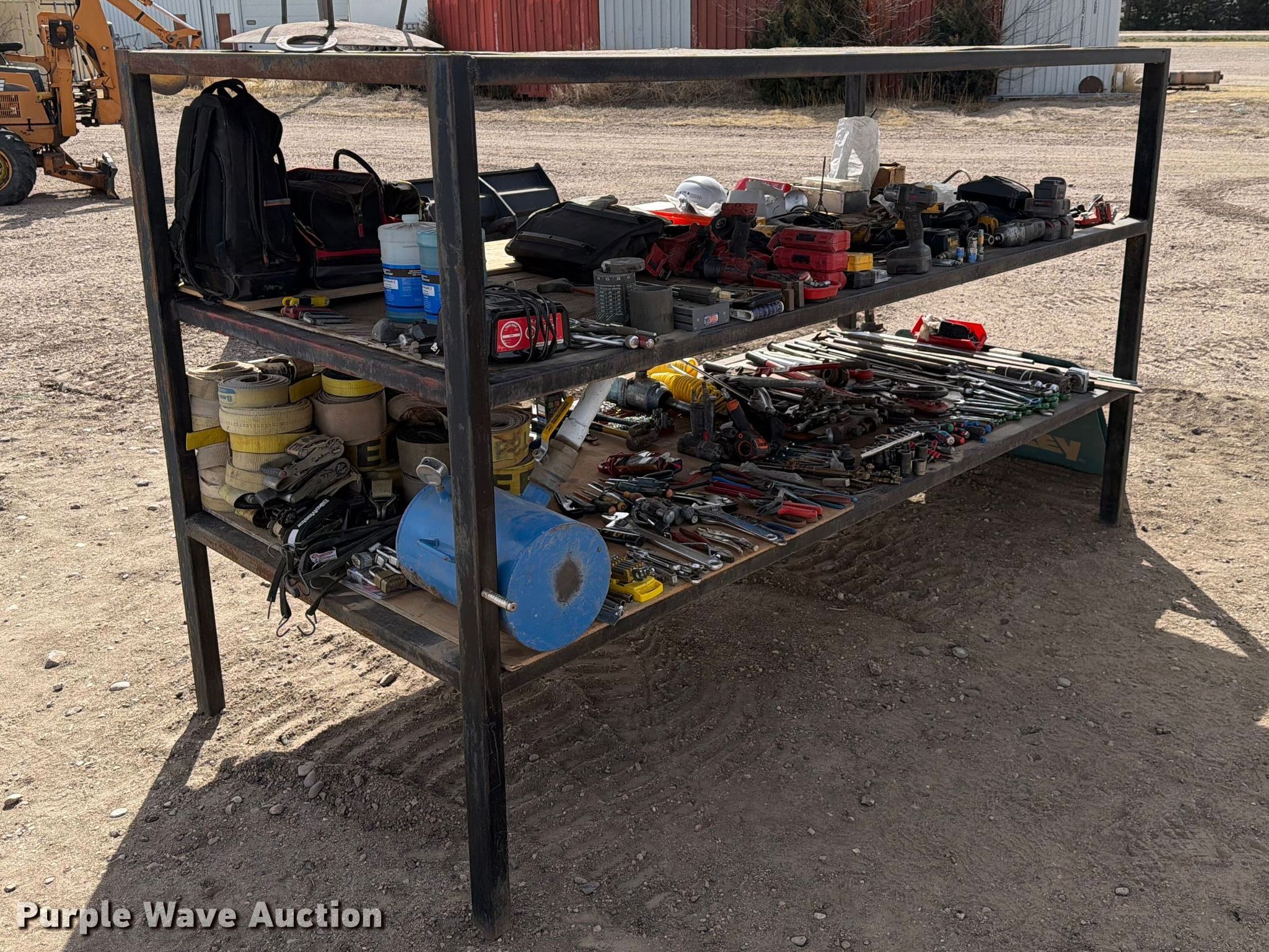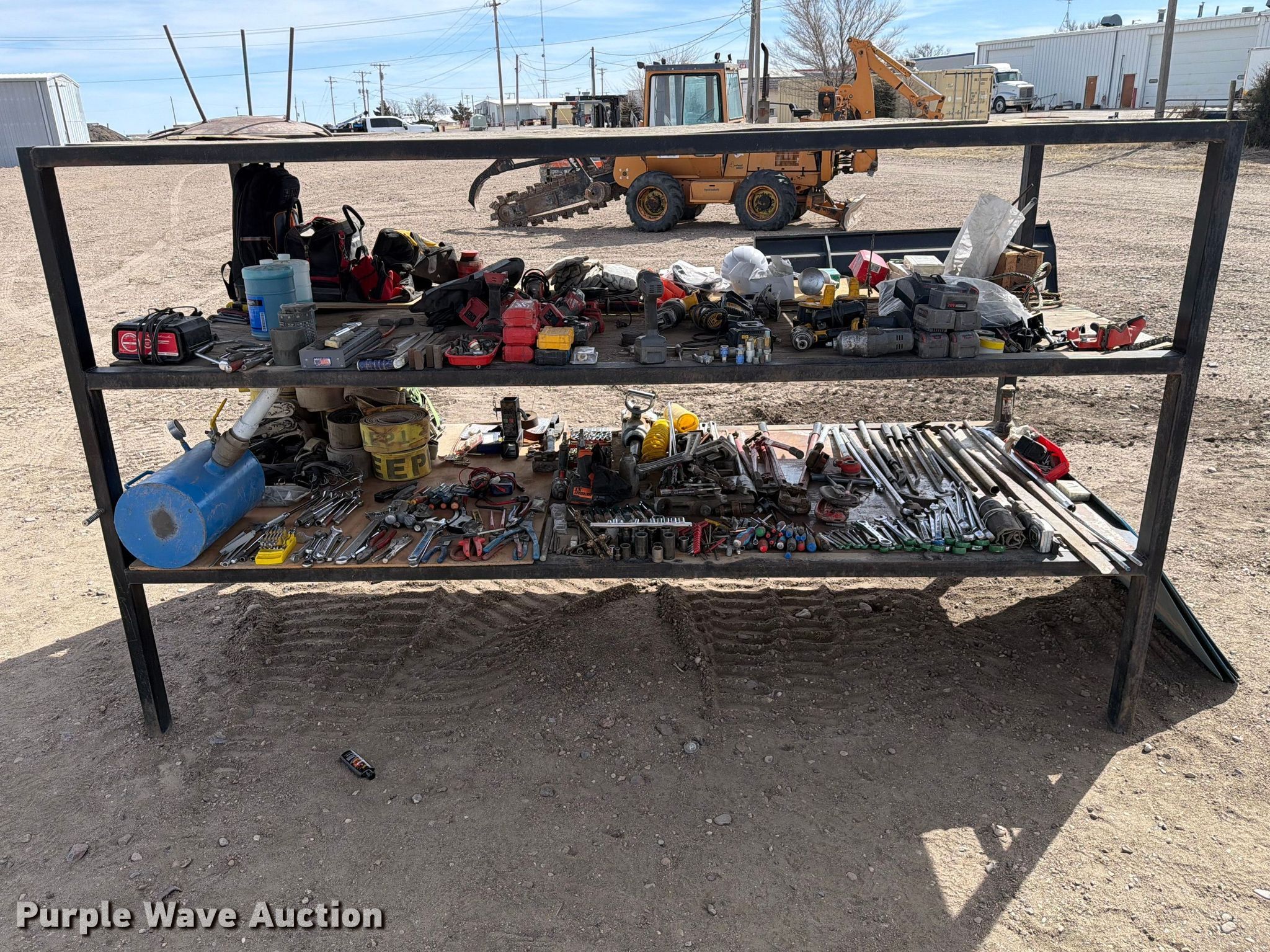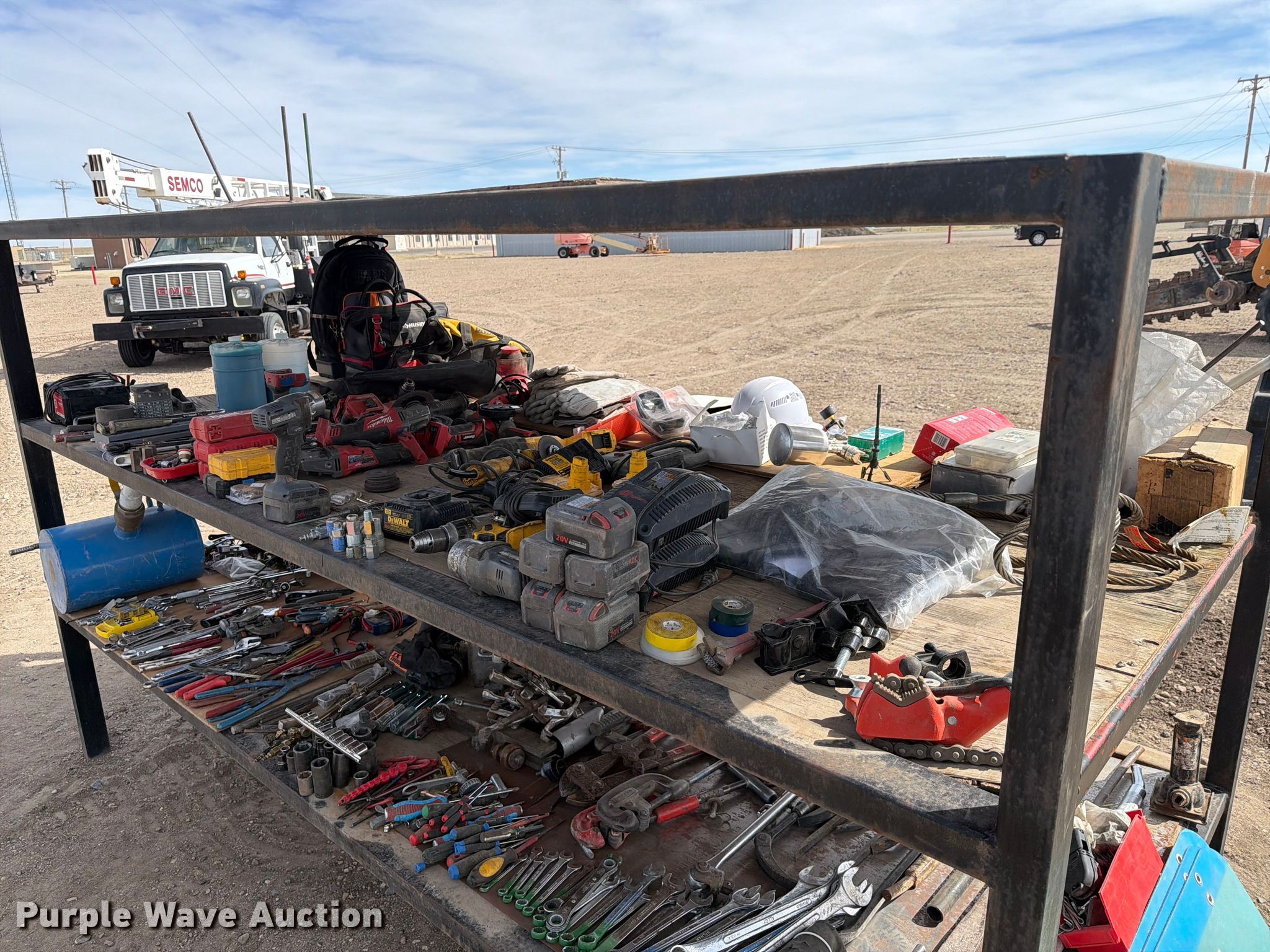 Tools. Power Tools, Drill bits, Hand saws, Battery chargers, Hand cleaner, Tool bags, Welding gloves, Wrenches, Bolt cutters, Ratchet straps, Air tank, Signs, Shelf size: 124" L x 54" W x 71" H. Notes Unknown operating condition. Western Kansas Ag. Sharon Springs, KS 67758