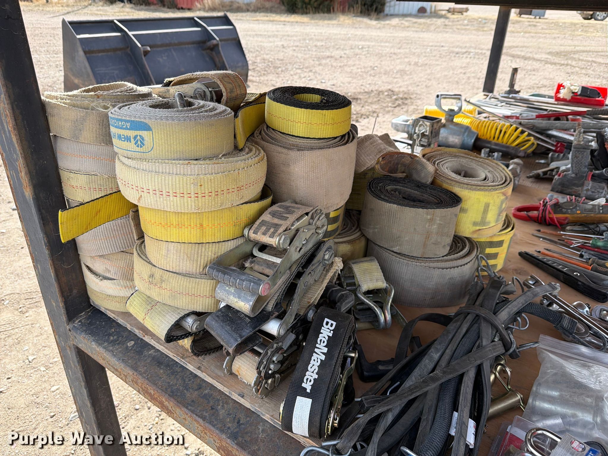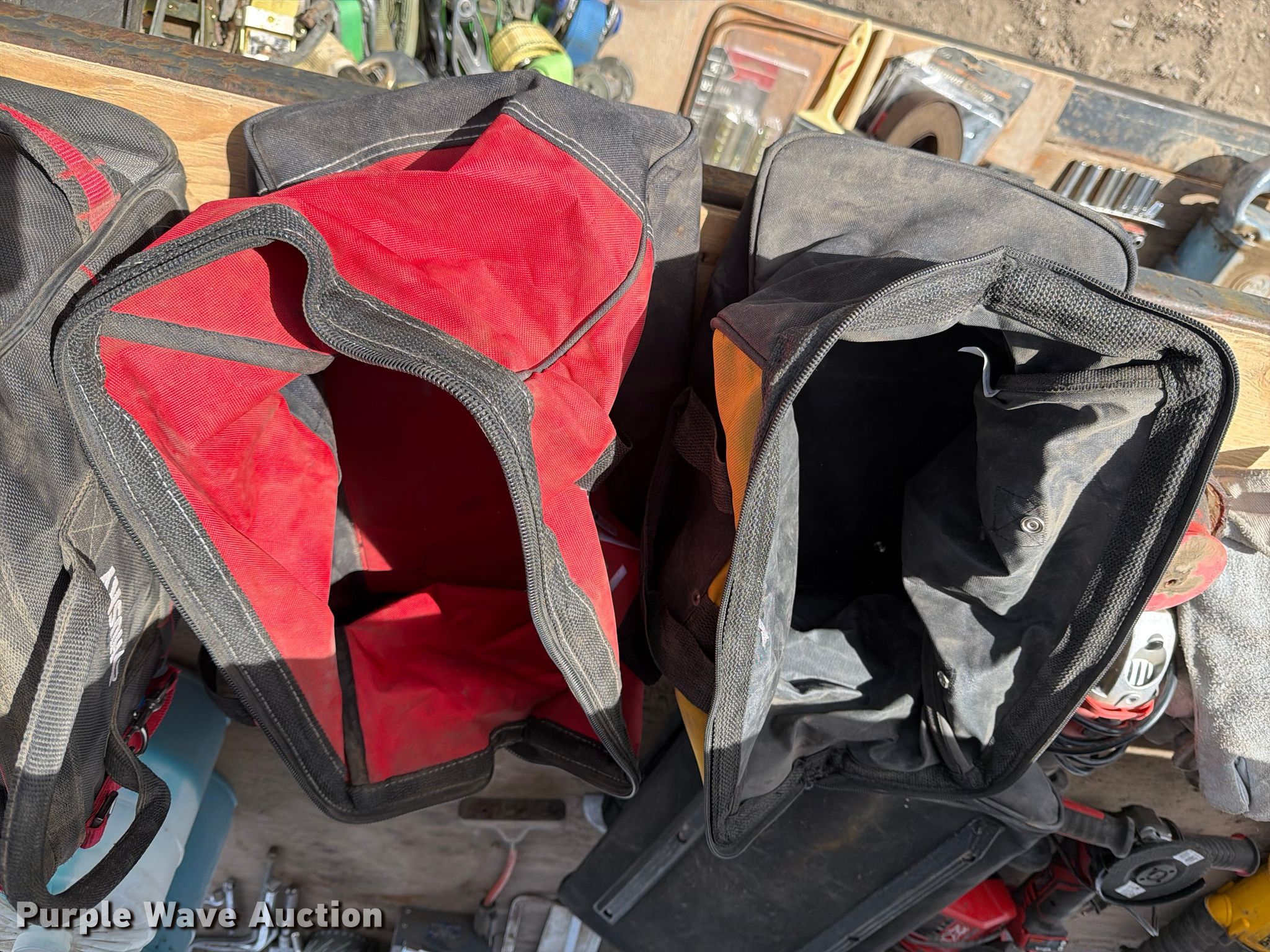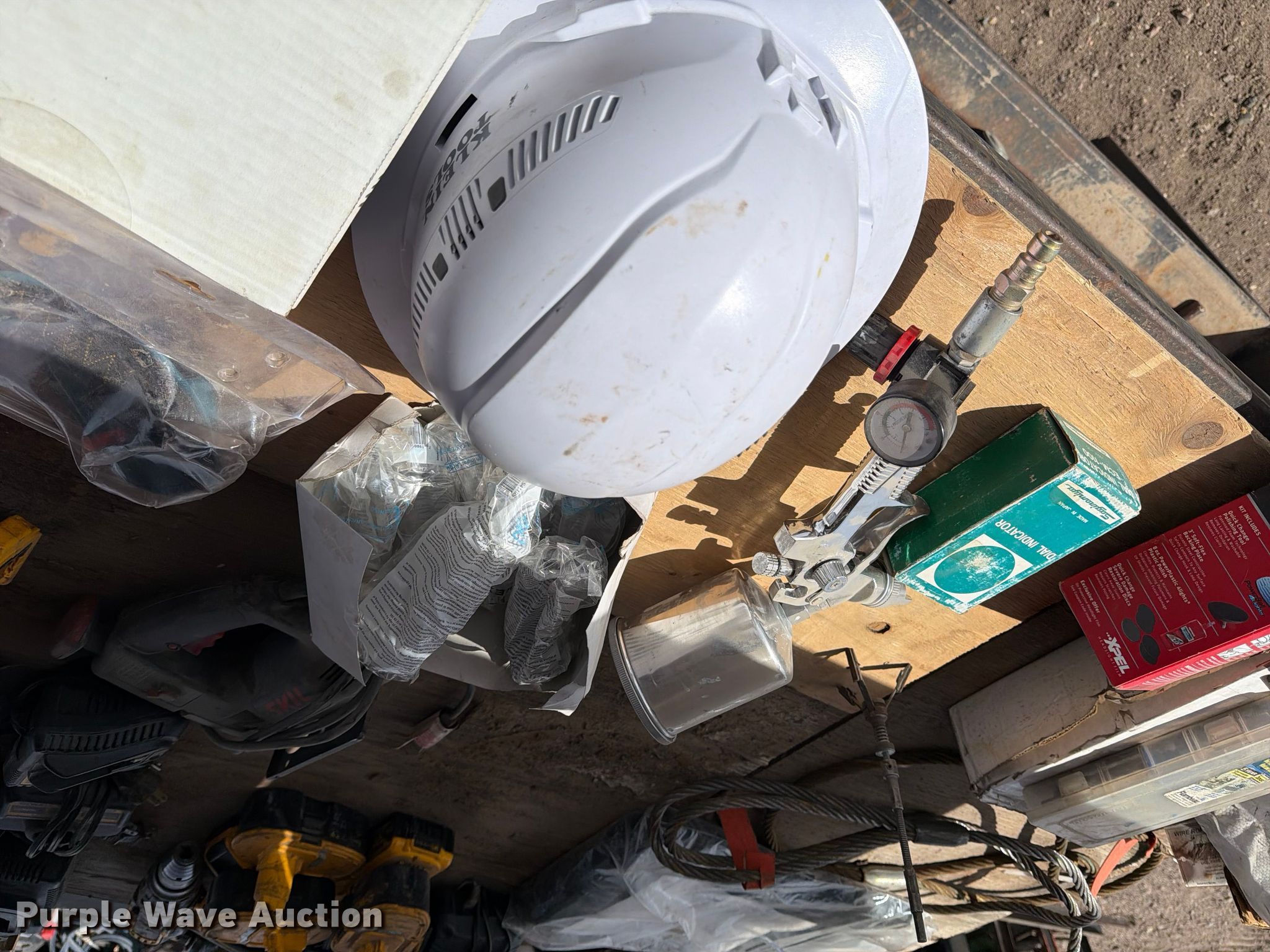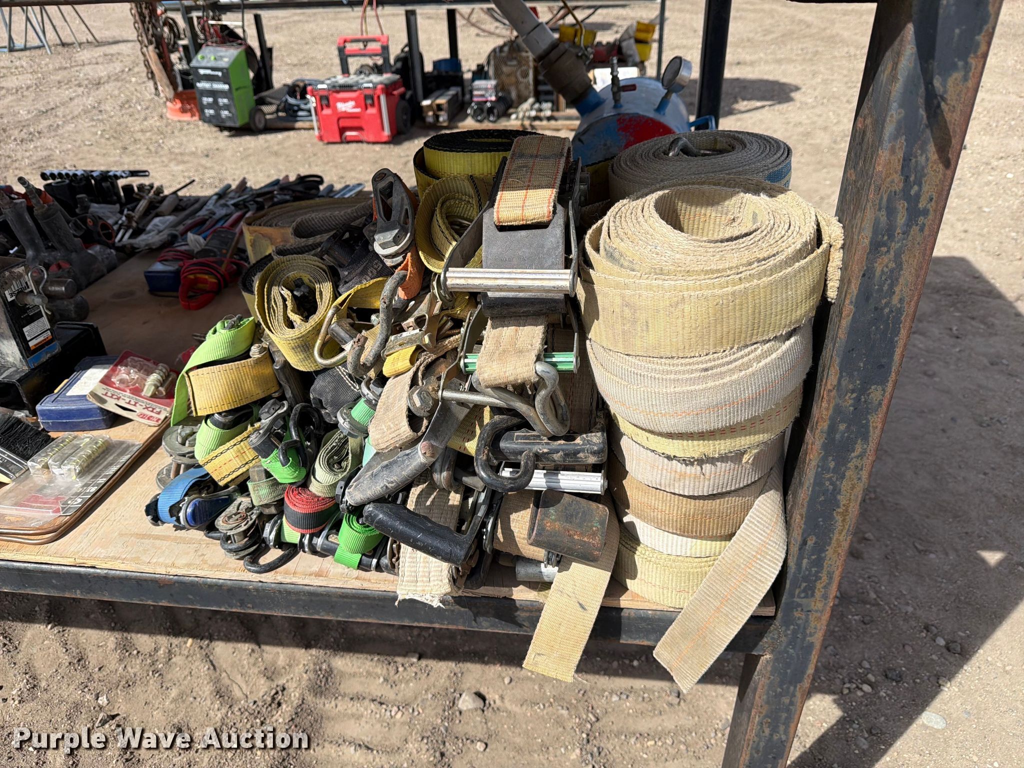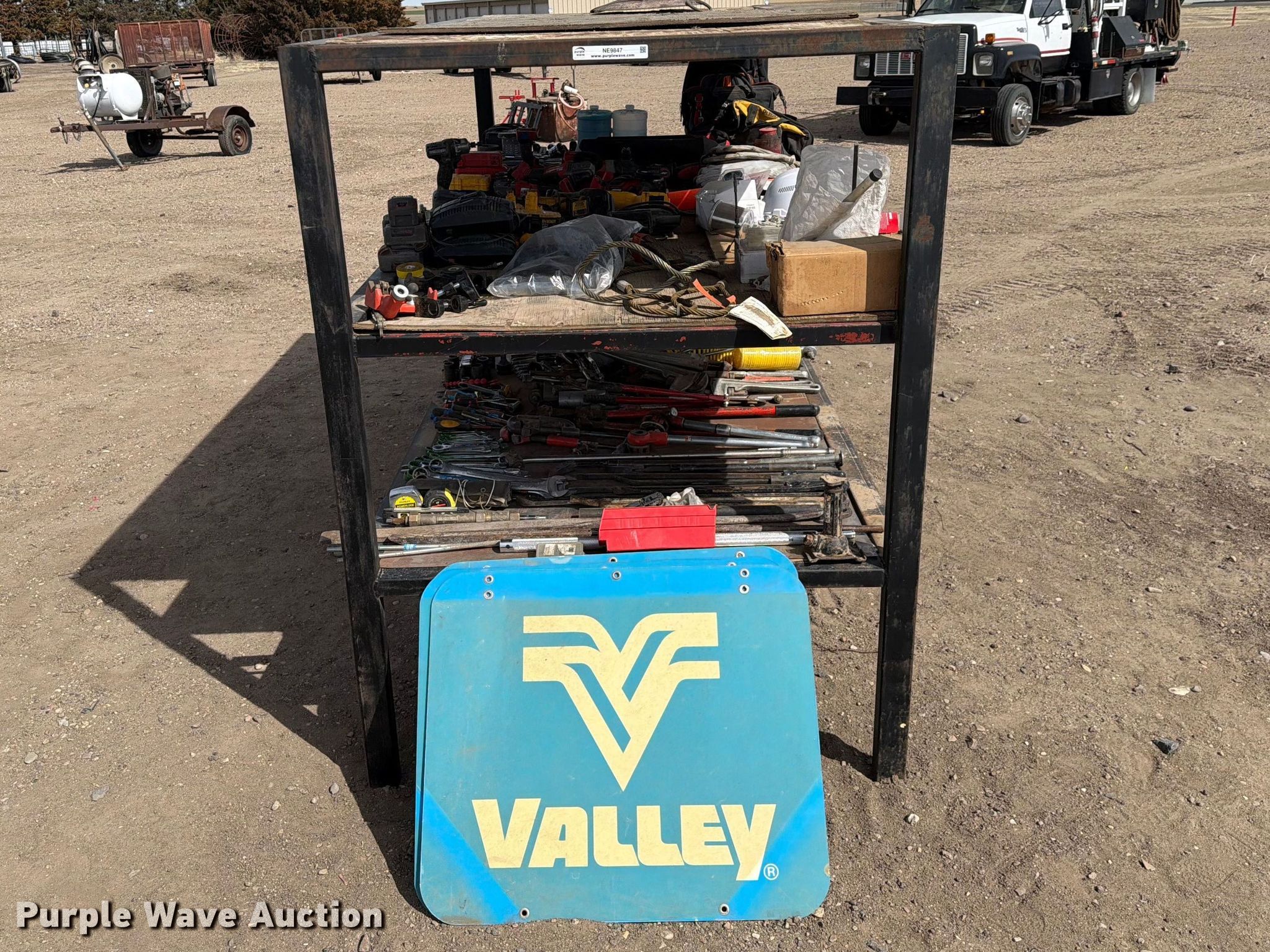 Tools. Power Tools, Drill bits, Hand saws, Battery chargers, Hand cleaner, Tool bags, Welding gloves, Wrenches, Bolt cutters, Ratchet straps, Air tank, Signs, Shelf size: 124" L x 54" W x 71" H. Notes Unknown operating condition. Western Kansas Ag. Sharon Springs, KS 67758