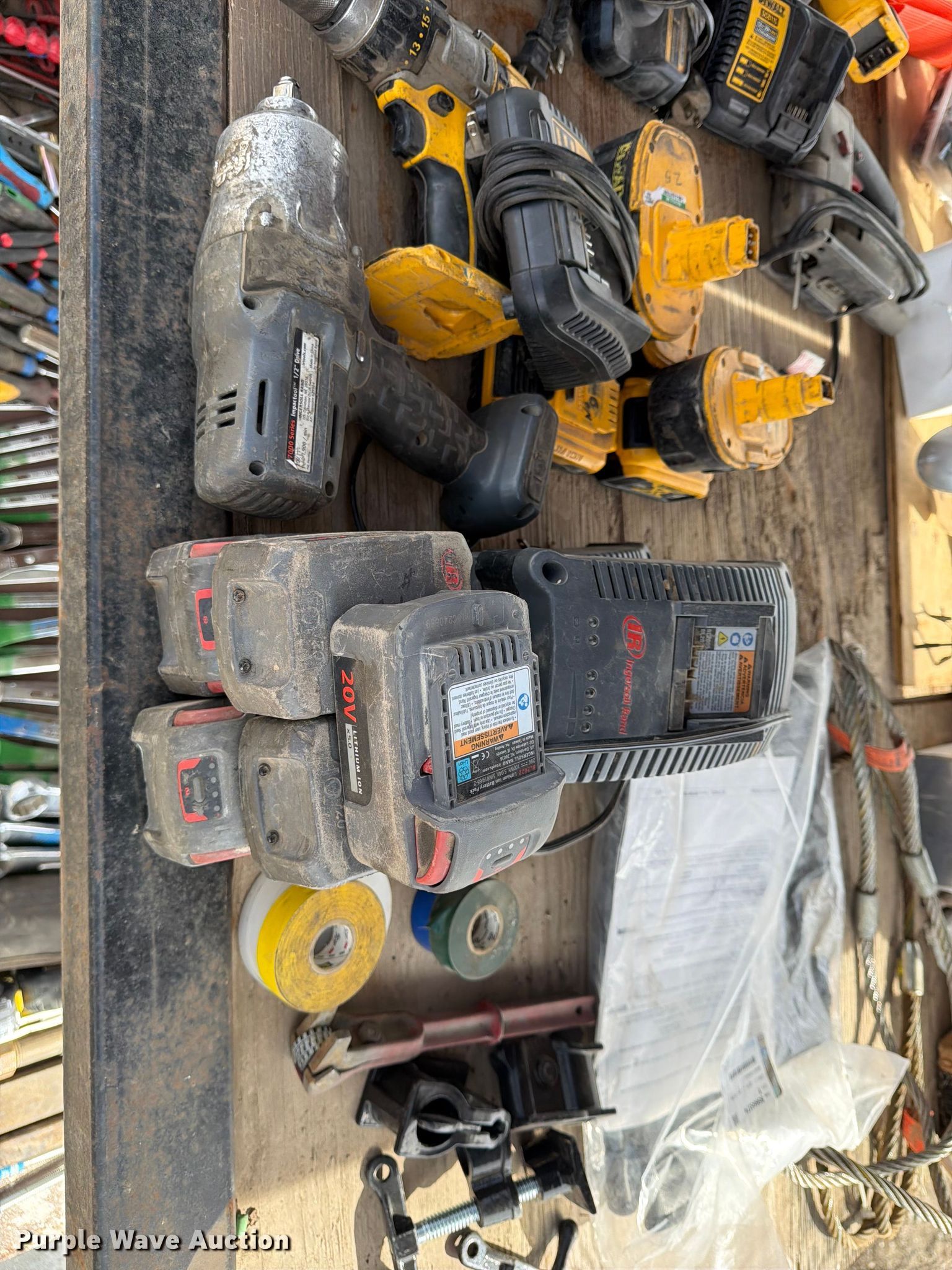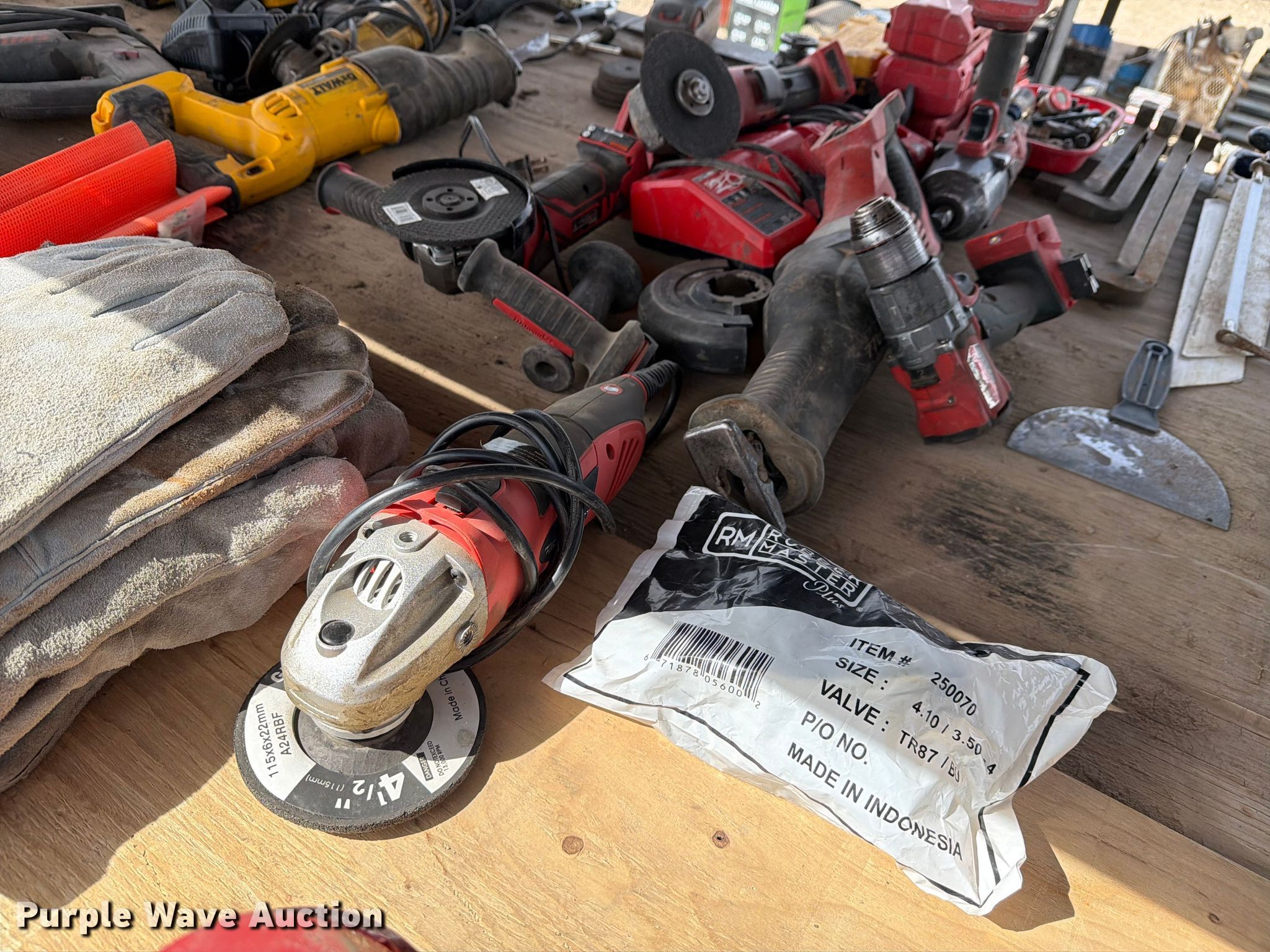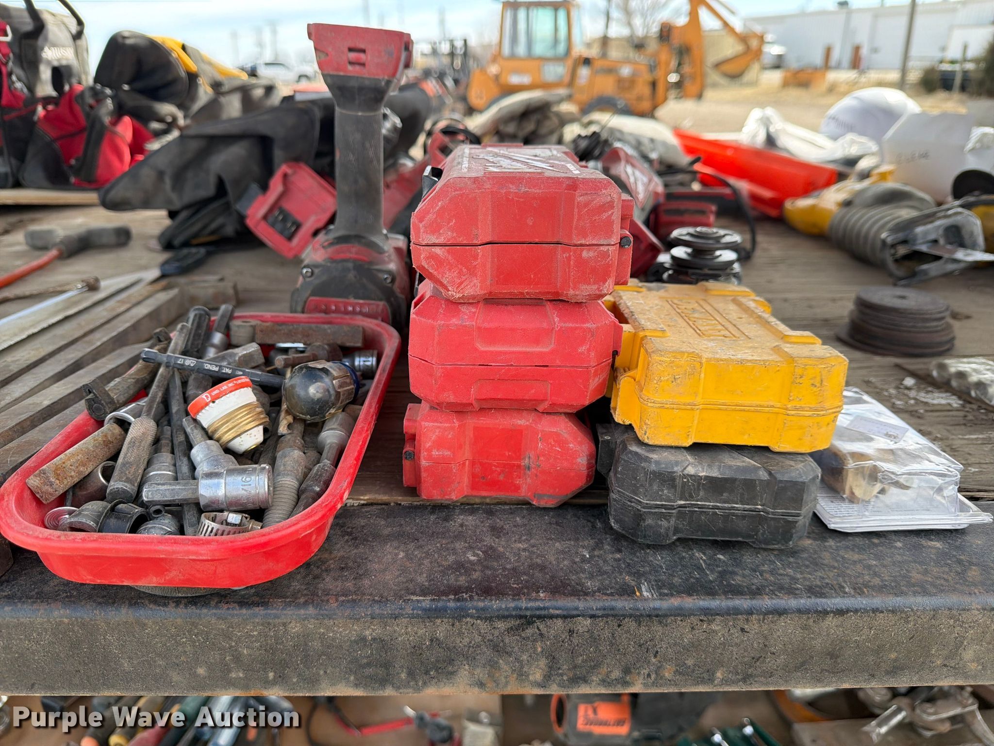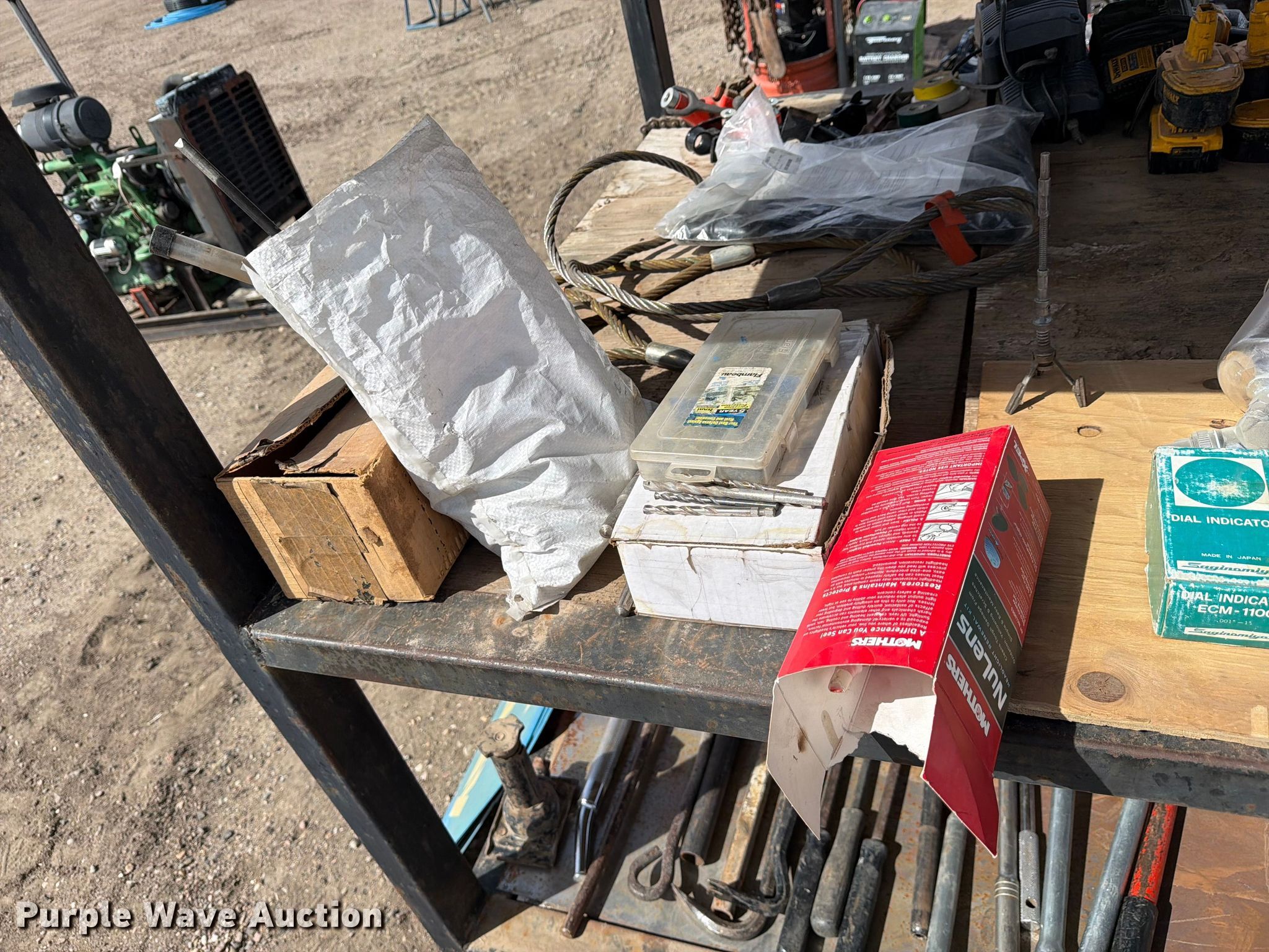 Tools. Power Tools, Drill bits, Hand saws, Battery chargers, Hand cleaner, Tool bags, Welding gloves, Wrenches, Bolt cutters, Ratchet straps, Air tank, Signs, Shelf size: 124" L x 54" W x 71" H. Notes Unknown operating condition. Western Kansas Ag. Sharon Springs, KS 67758