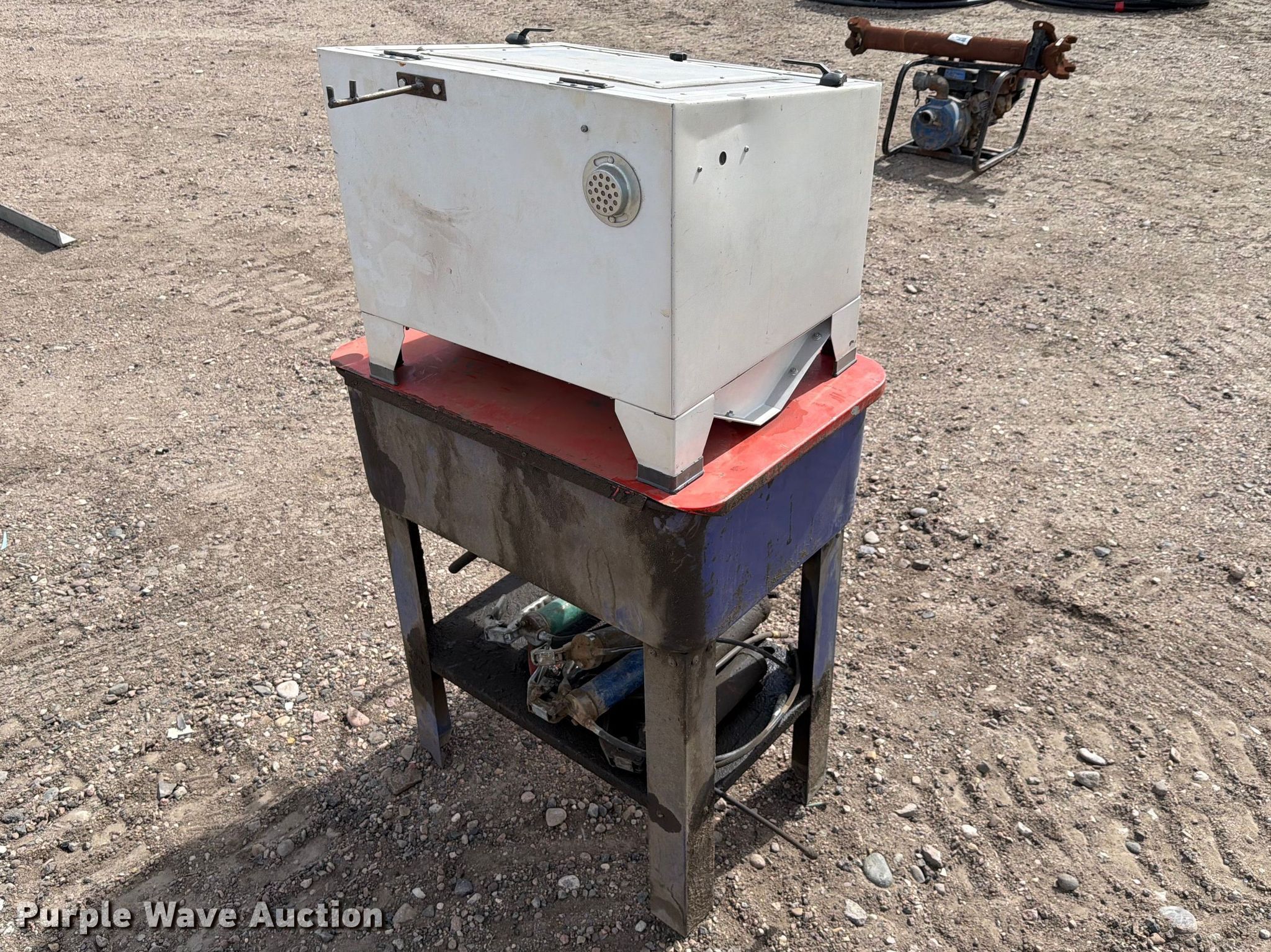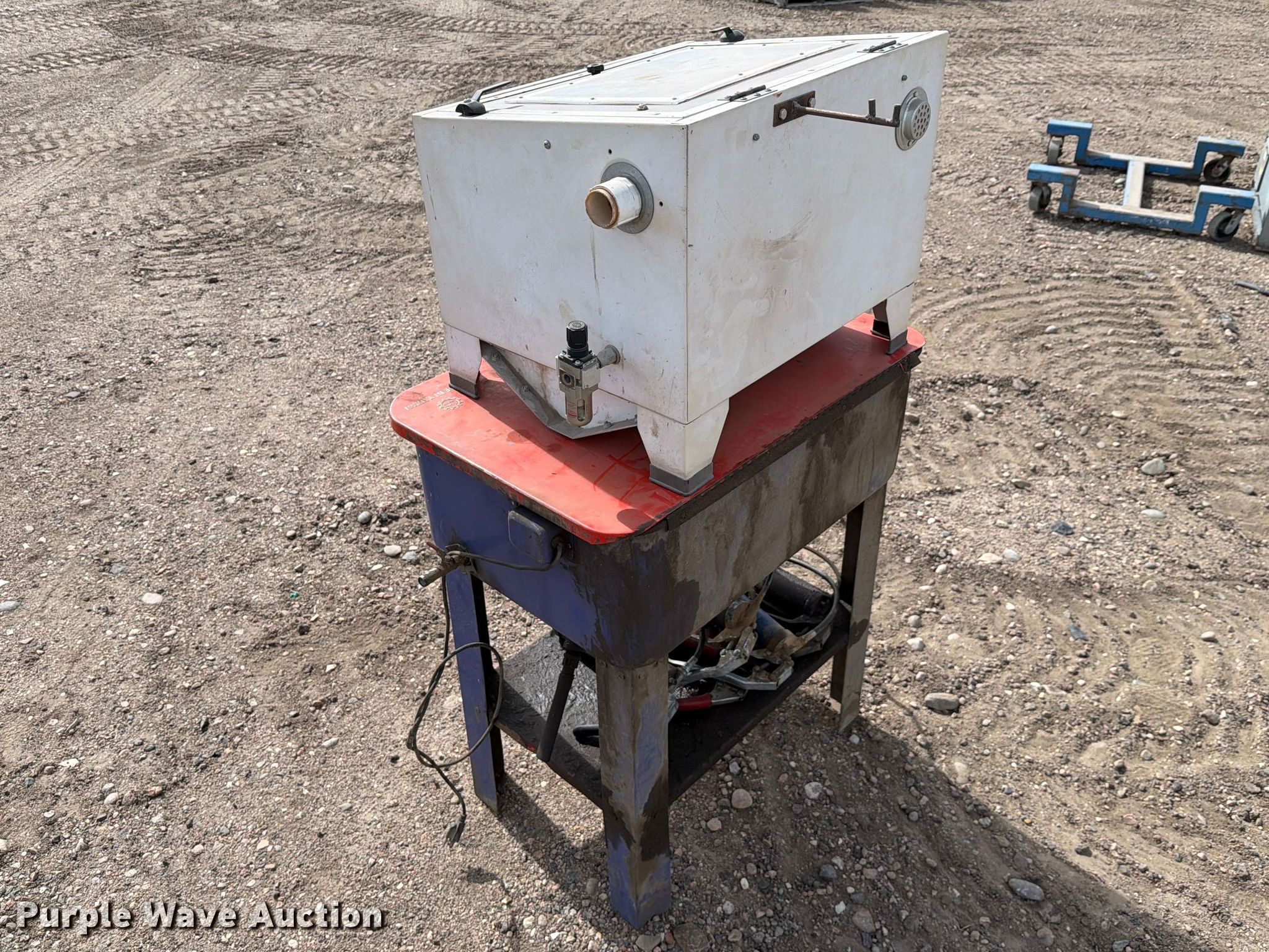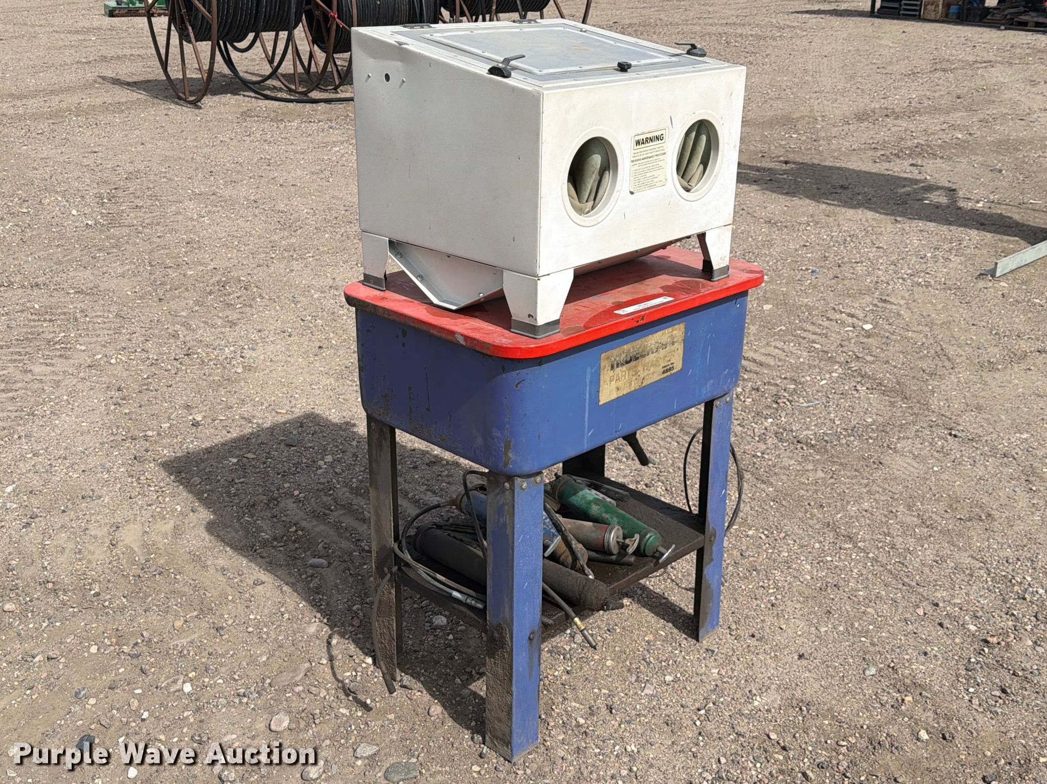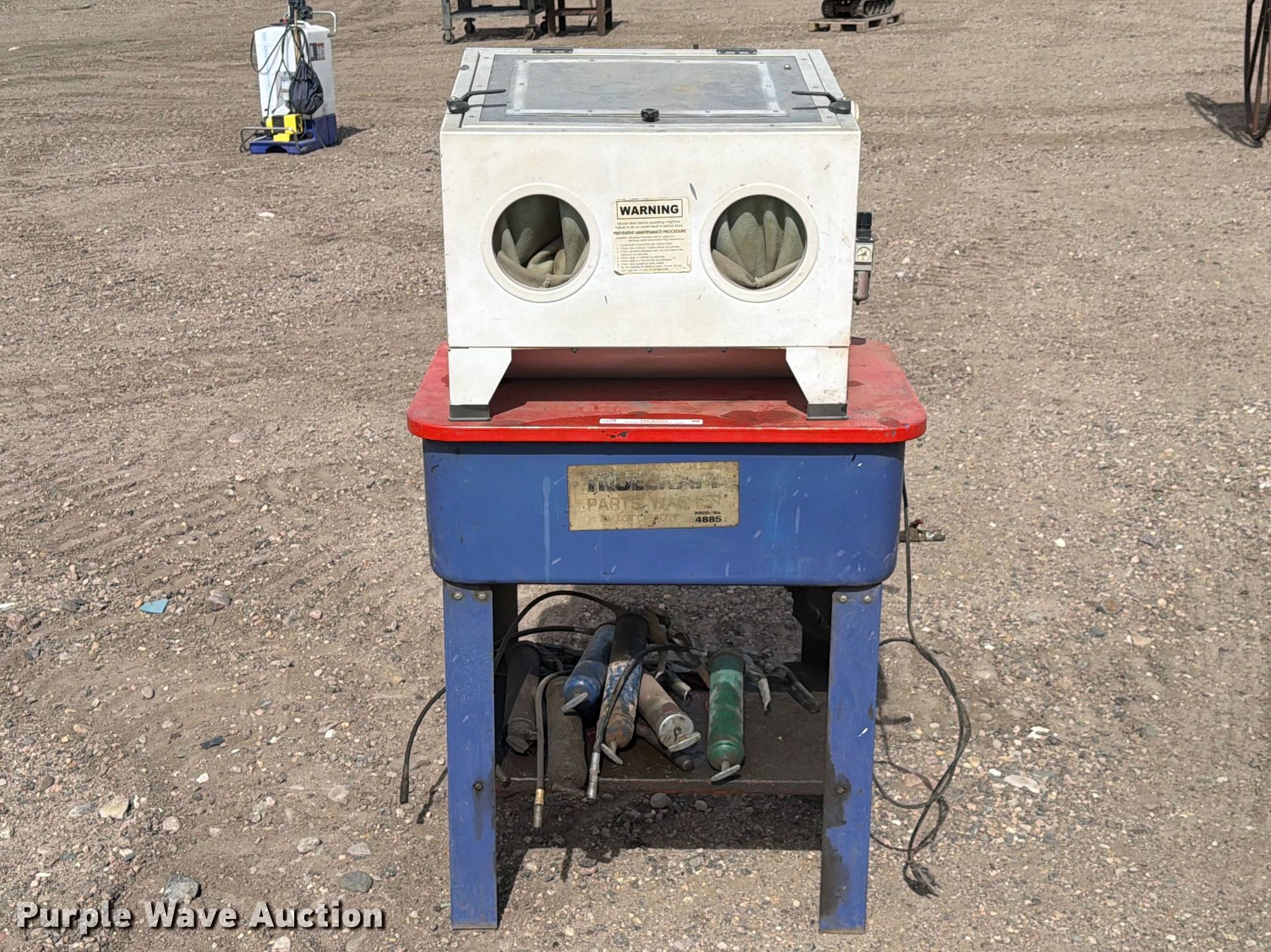 Purple Wave is selling a used Tools in Kansas. This item is a Truecraft parts washer with the following: Serial: 4885, Grease guns included, Unknown operating condition