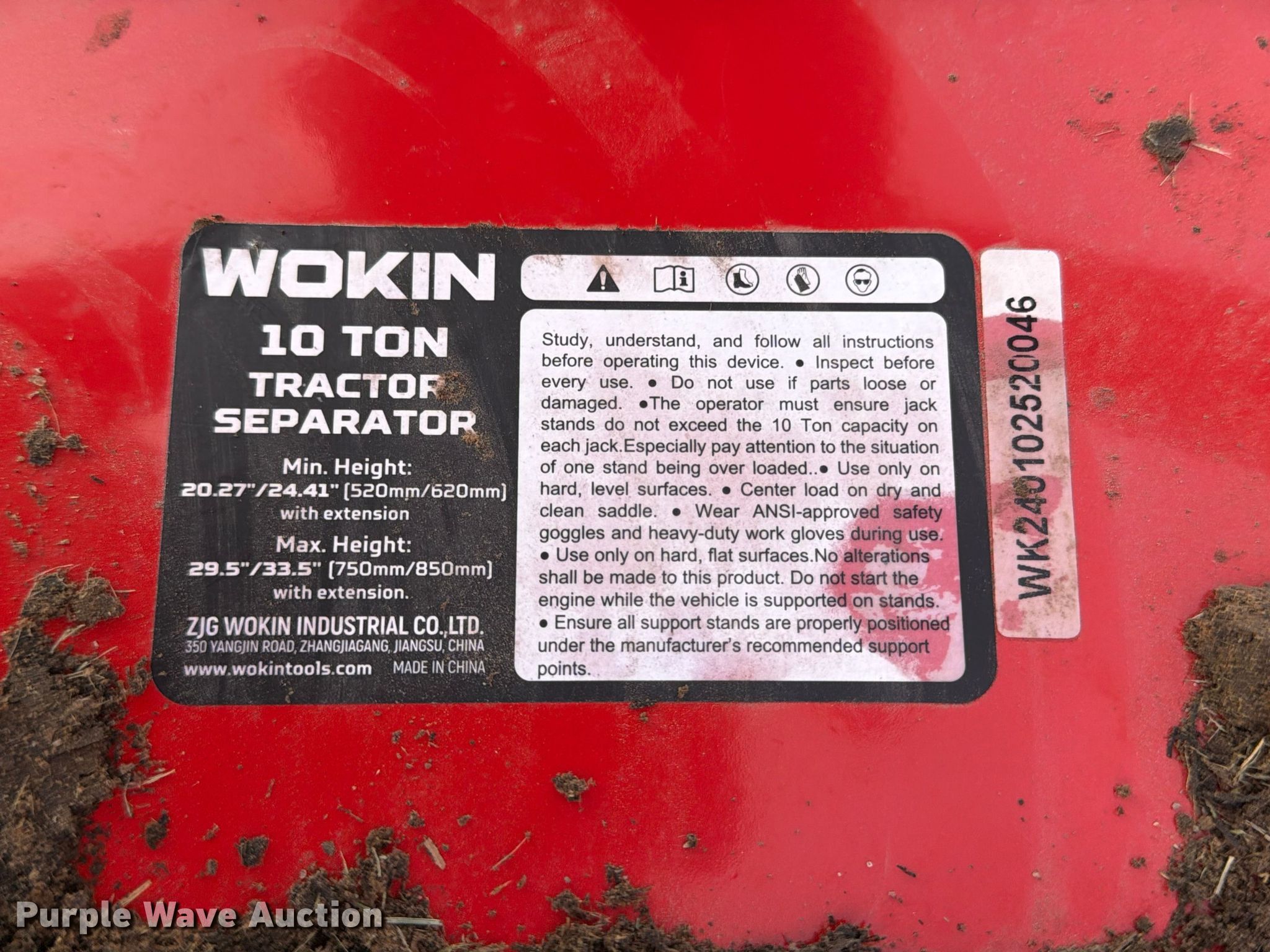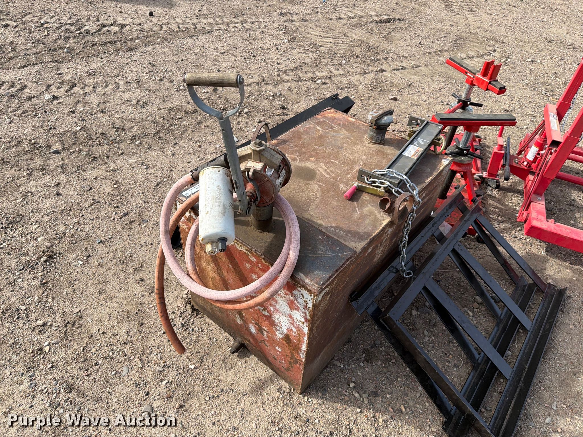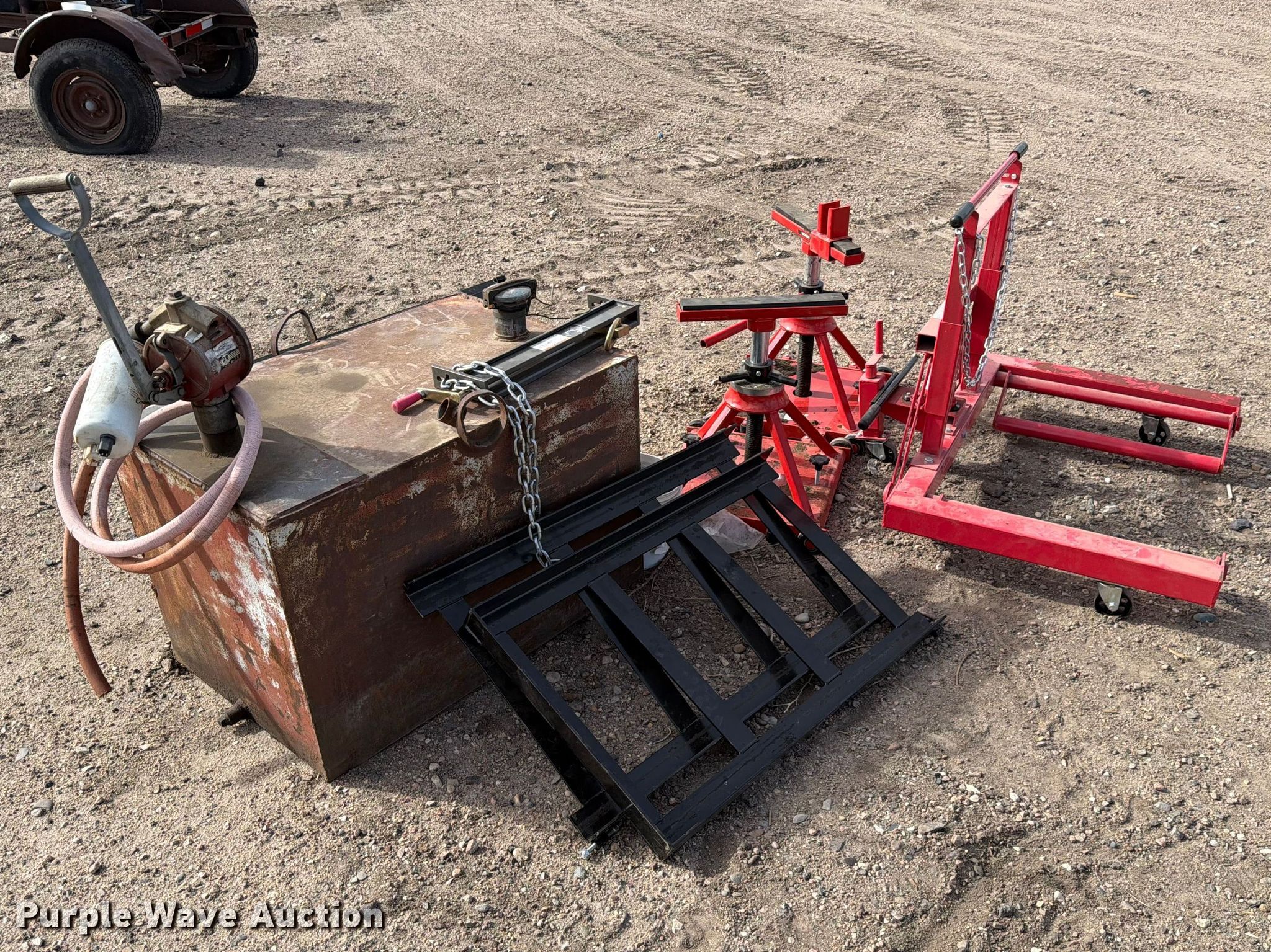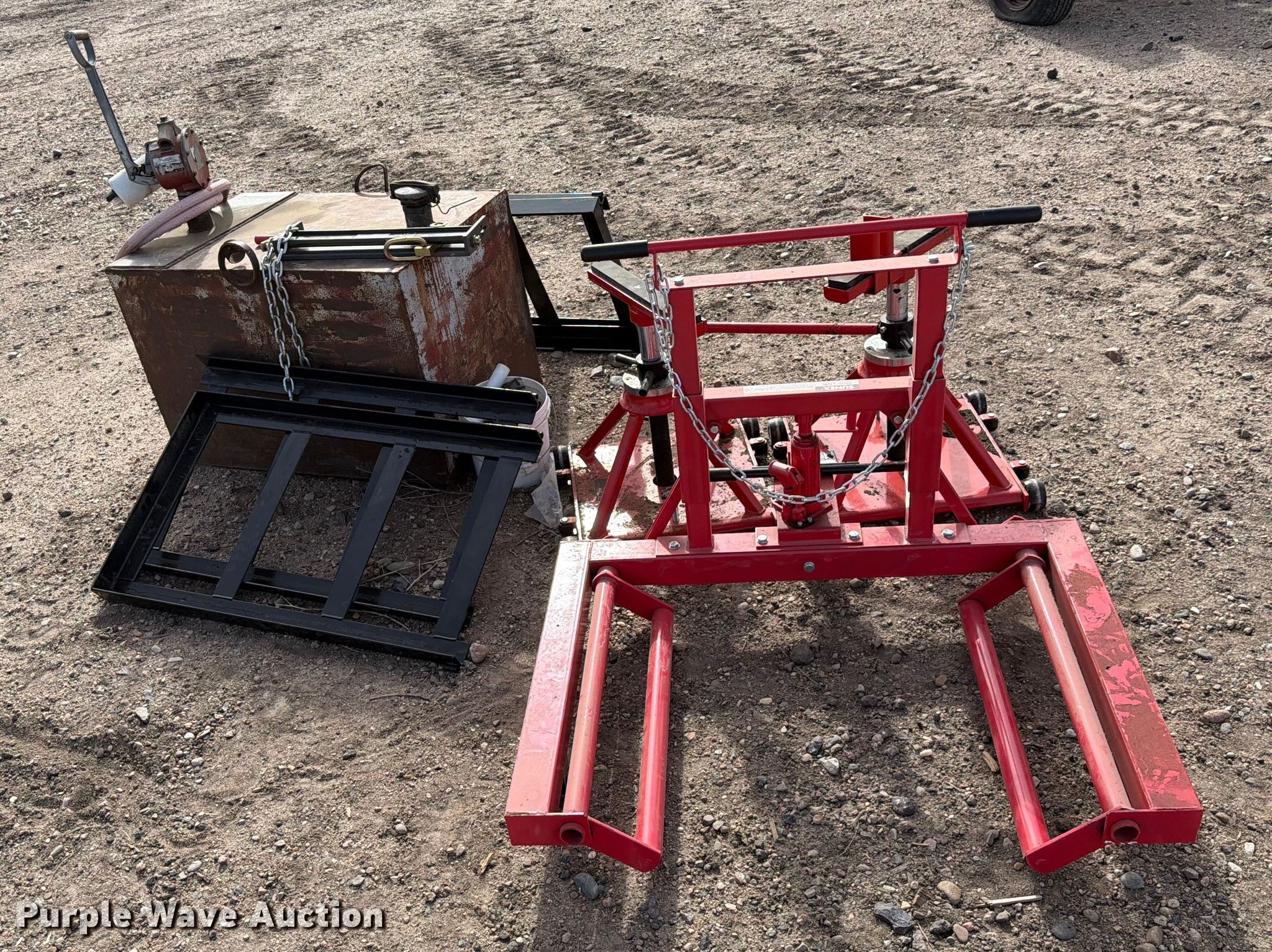 Tools. Sunex hydraulic dolly Capacity: 1,500 lbs, (2) Wokin tractor separators Capacity: 10 tons, (4) brackets 39" L x 23" W, Fuel tank 36" L x 25" W x 24" H, Additional parts included. Western Kansas Ag. Sharon Springs, KS 67758