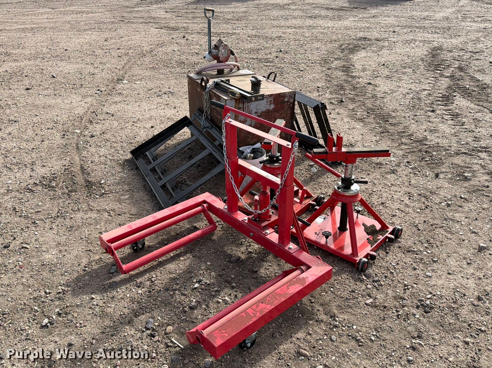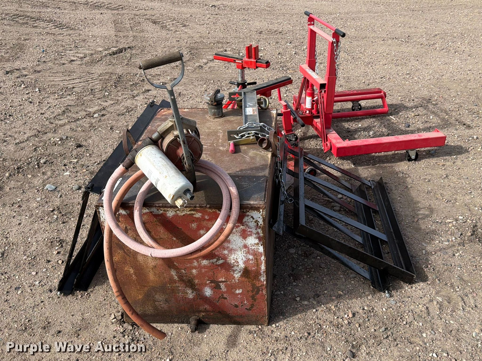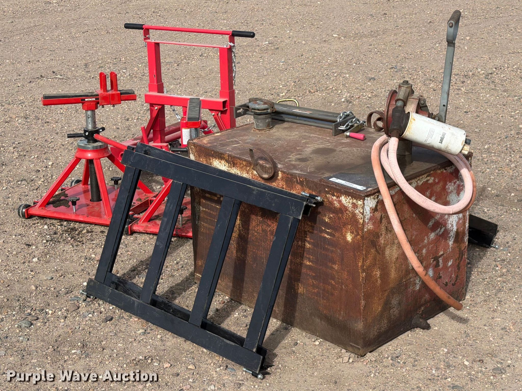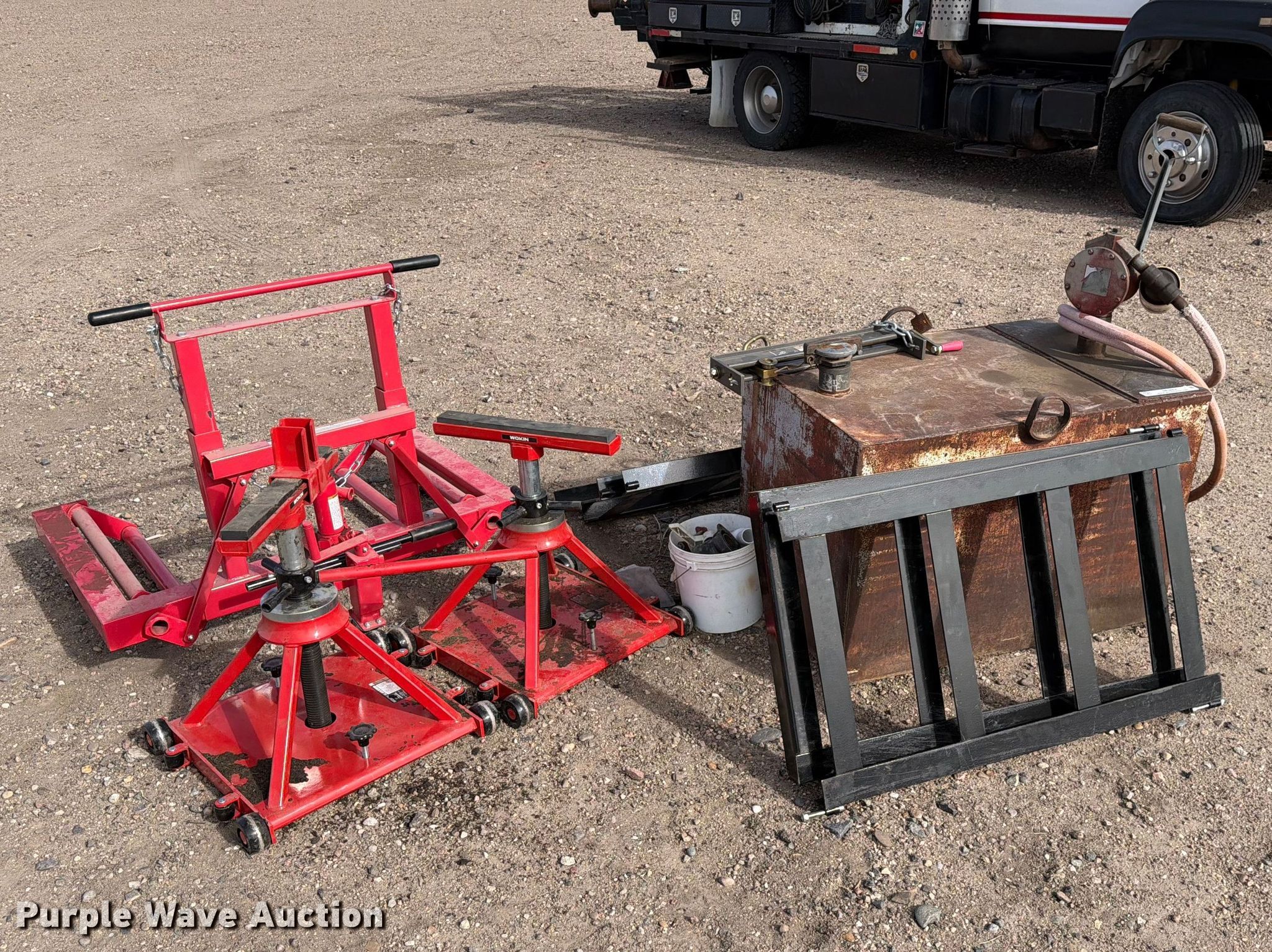 Purple Wave is selling a used Tools in Kansas. This item is a Tools with the following: Sunex hydraulic dolly, Capacity: 1,500 lbs, (2) Wokin tractor separators, Capacity: 10 tons, (4) brackets, 39" L x 23" W, Fuel tank, 36" L x 25" W x 24" H, Additional parts included
