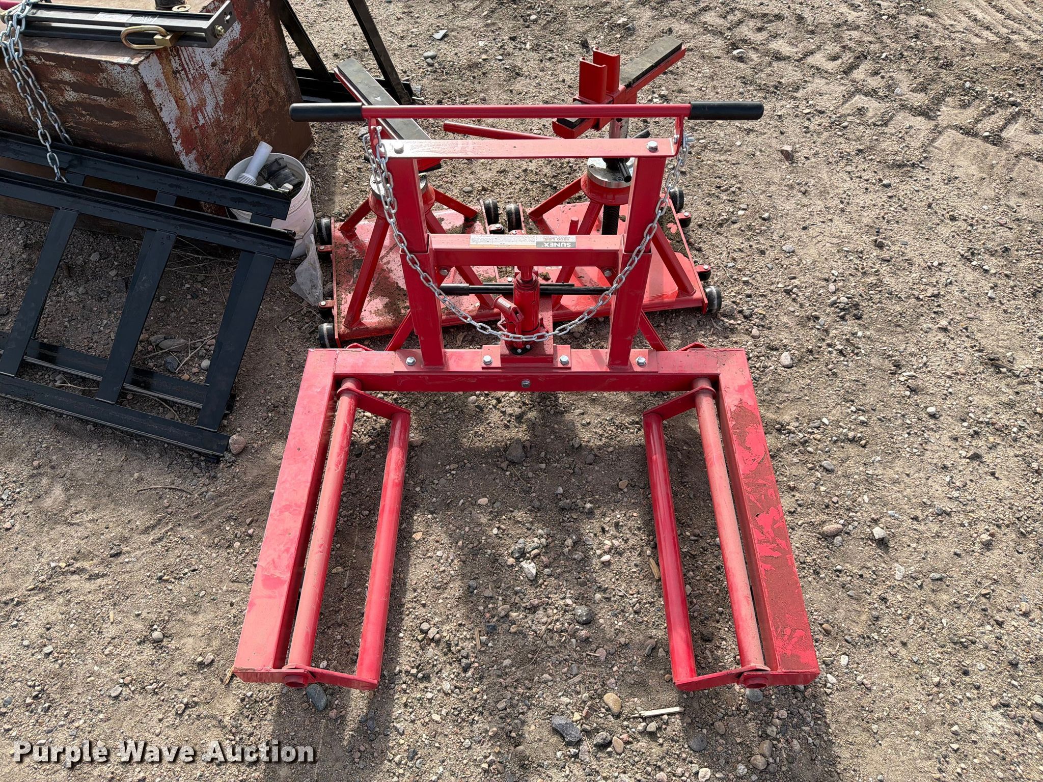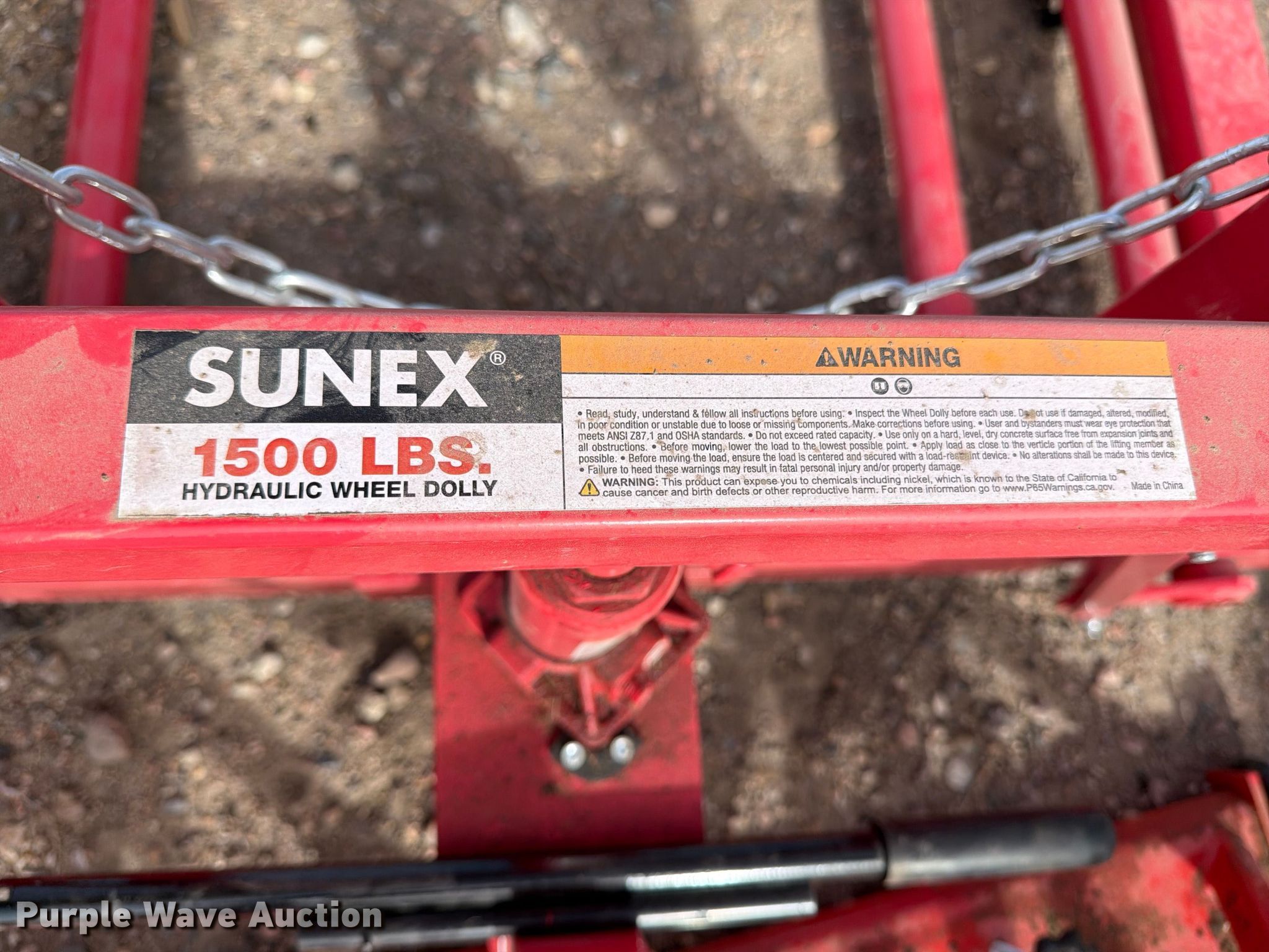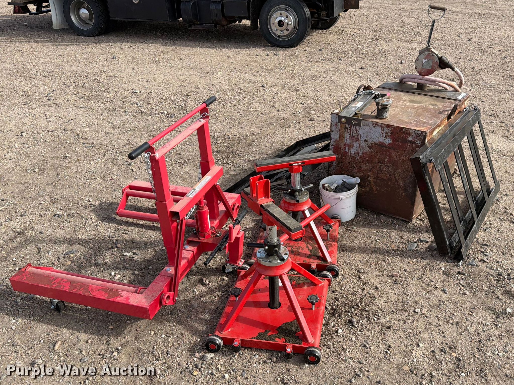 Purple Wave is selling a used Tools in Kansas. This item is a Tools with the following: Sunex hydraulic dolly, Capacity: 1,500 lbs, (2) Wokin tractor separators, Capacity: 10 tons, (4) brackets, 39" L x 23" W, Fuel tank, 36" L x 25" W x 24" H, Additional parts included