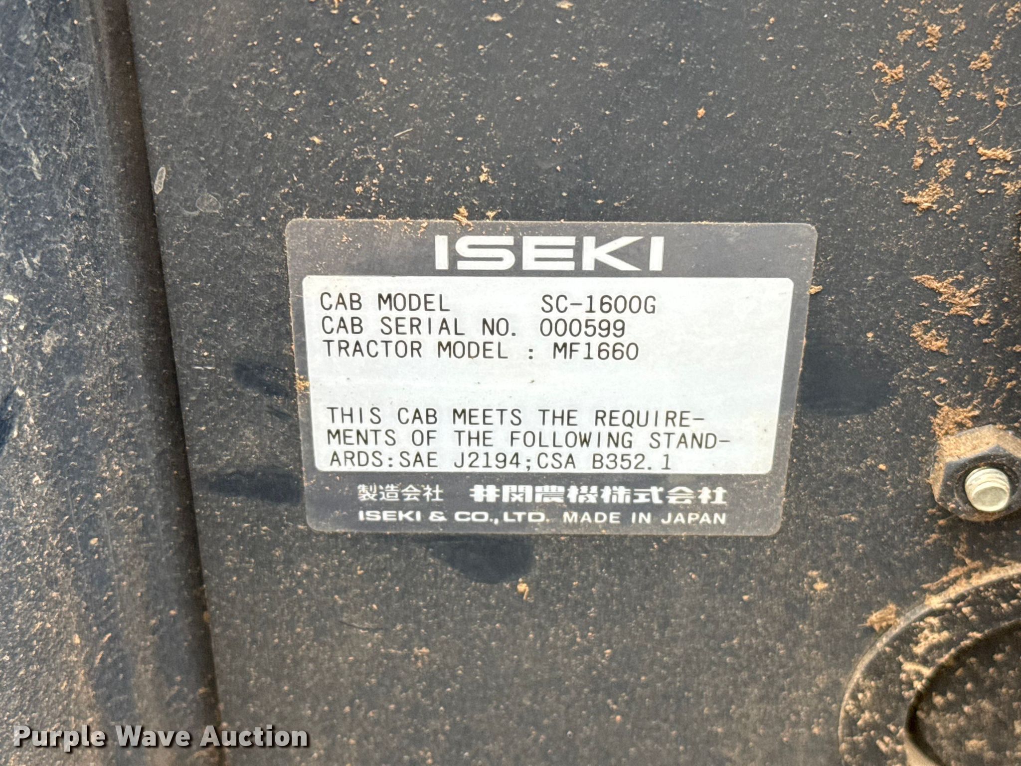 2012 Massey Ferguson MF1660 MFWD tractor. Hours: Unknown, Serial: JXF93802, Unit #: 79158975. Engine Iseki, Displacement: 2.955L, Cylinders: 4, Fuel type: Diesel. Transmission Powershift, 12F - 12R, Differential lock. Operators station AC, Heat. Features PTO: 540, Three point Top link, Hydraulic remote sets Rear: 1, Loader Massey Ferguson DL130, Quick attach, Controls: Joystick. Tires Front: 9.5-16, Rear: 16.9-26. Notes Collision damage, Loader arm lift cylinder broke, Possible electrical issues, Glass missing, Unknown operating condition. Buyer responsible for all aspects of loadout and removal. Insurance salvage, stored at a secured facility. Please review REQUIRED REMOVAL INSTRUCTIONS. Insurance Salvage. 2408 West 21st Street South. Tulsa, OK 74107