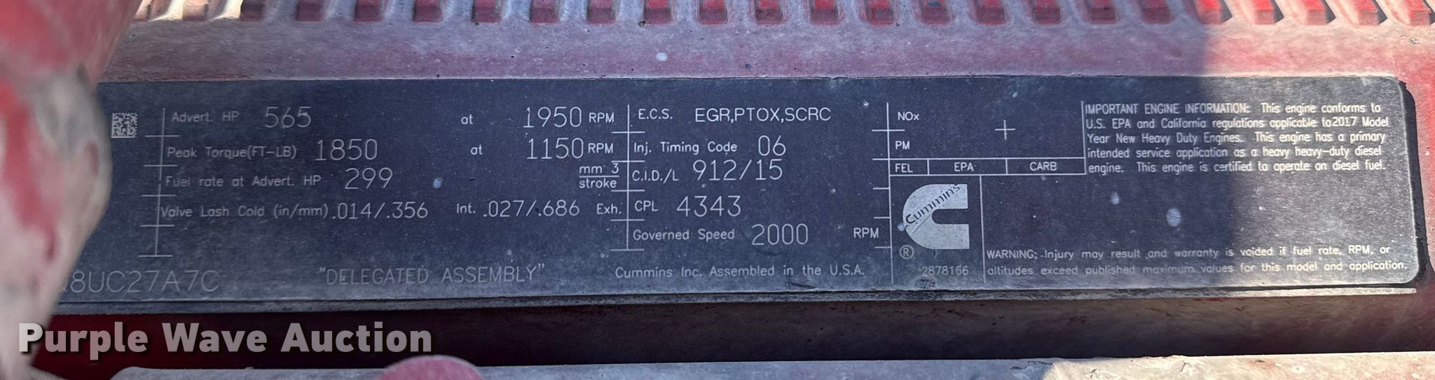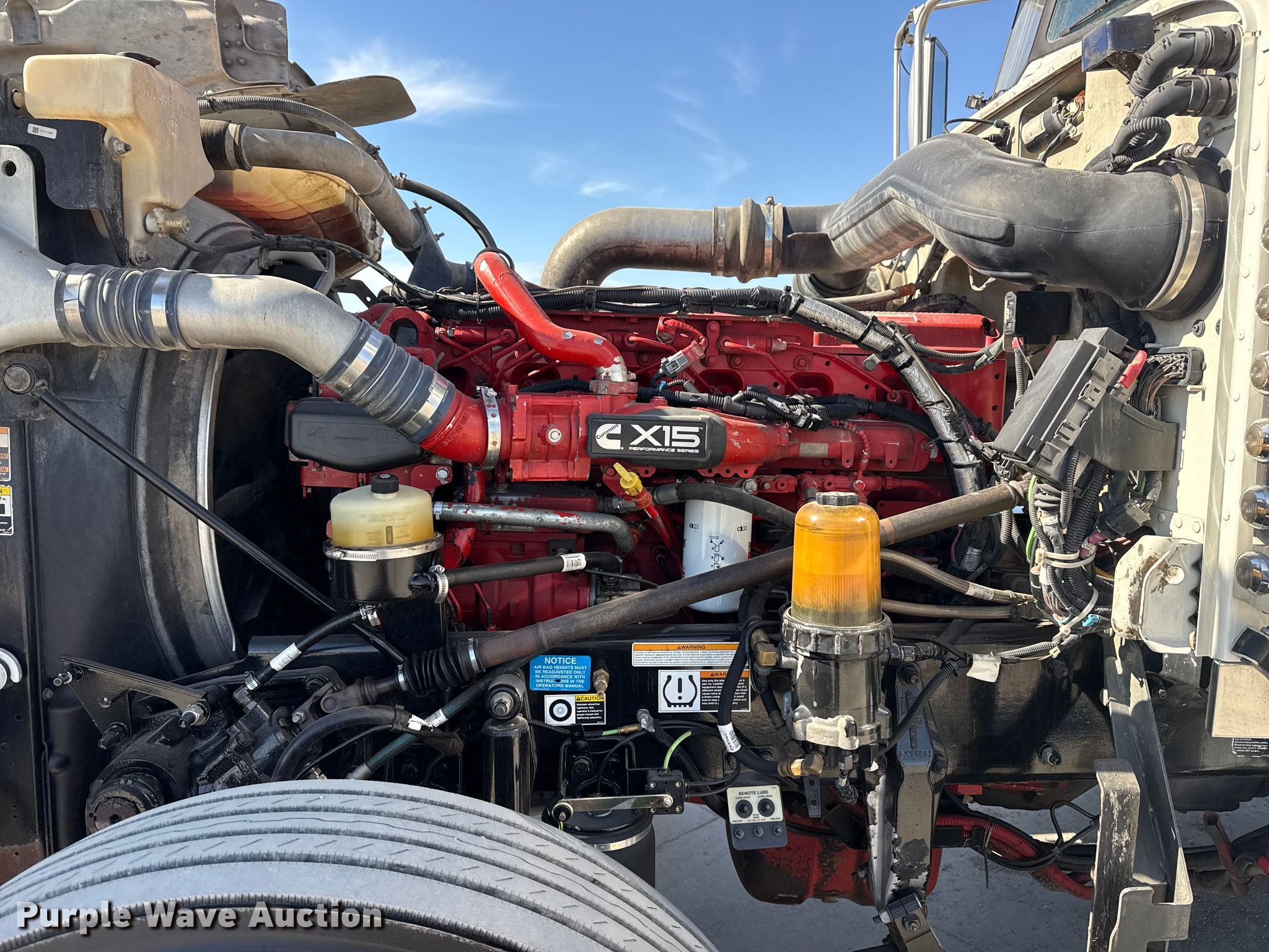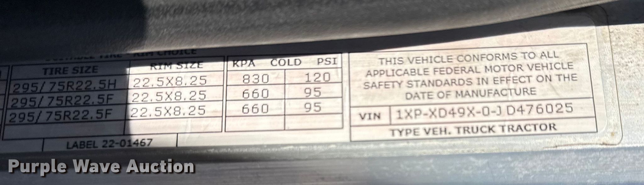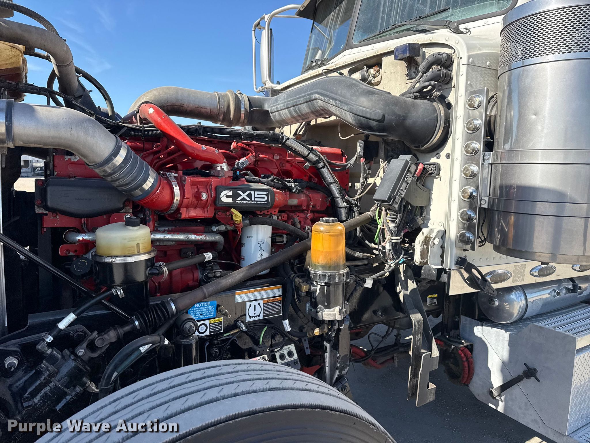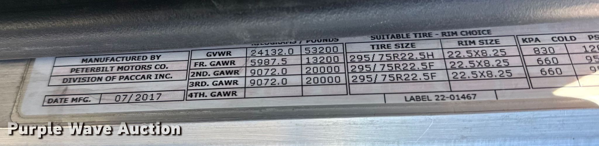 2018 Peterbilt 389 semi truck. Miles: 884,398 on odometer, Hours: 40,501 on meter, VIN: 1XPXD49XOJD476025, Unit #: 110. Engine Cummins X15, Serial: 799994533, Displacement: 15.0L, Cylinders: 6, Fuel type: Diesel. Transmission Eaton Fuller, Manual, Speed: 18. Chassis Axles: Tandem, Differential lock: Inter-axle, Suspension: Air Dump valves, Brakes: Air, GVWR: 53,200 lbs FAWR: 13,200 lbs, IAWR: 20,000 lbs, RAWR: 20,000 lbs. Interior AC, Heat, Heated mirrors, Power windows, Power locks, Cruise control, Air ride cab, Auxiliary controls, Sleeper Sleeper length: 60", Beds: Single, Refrigerator, Rear climate control. Features Fifth wheel type: Air operated, Sliding, Fuel tank: Dual. Tires Front: 285/75R24.5, Rear: 295/75R22.5. Notes Operator's manual, Dash warning indicator: Check engine, Windshield chipped or cracked, Emissions system modified, DPF deleted. Oklahoma title. Title distribution may be delayed up to 14 days from verification of funds. Security Specialized. 3529 West 151st Street South. Kiefer, OK 74041