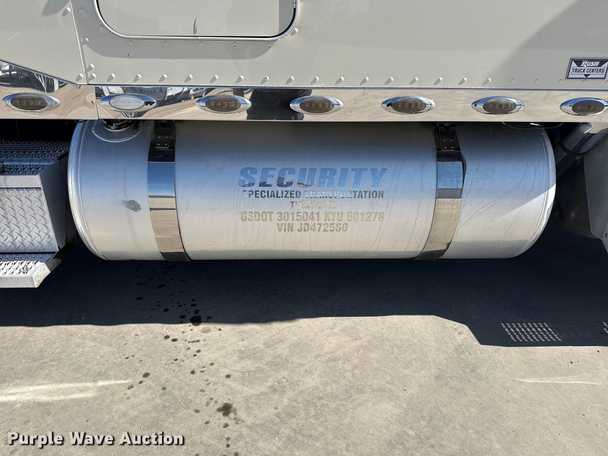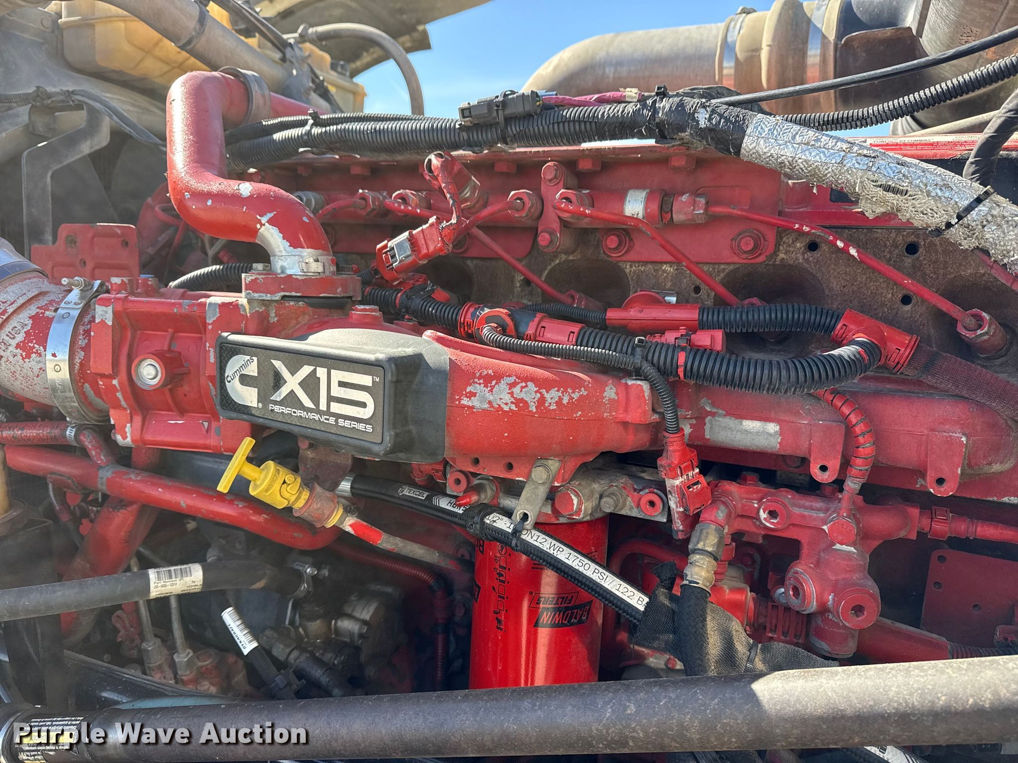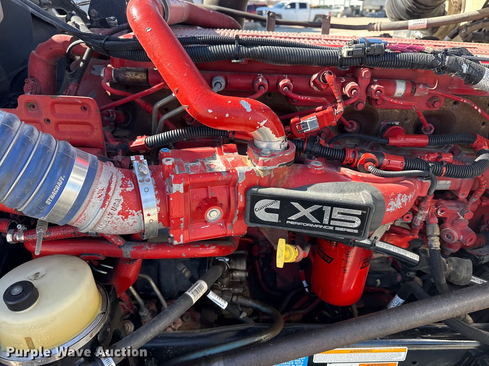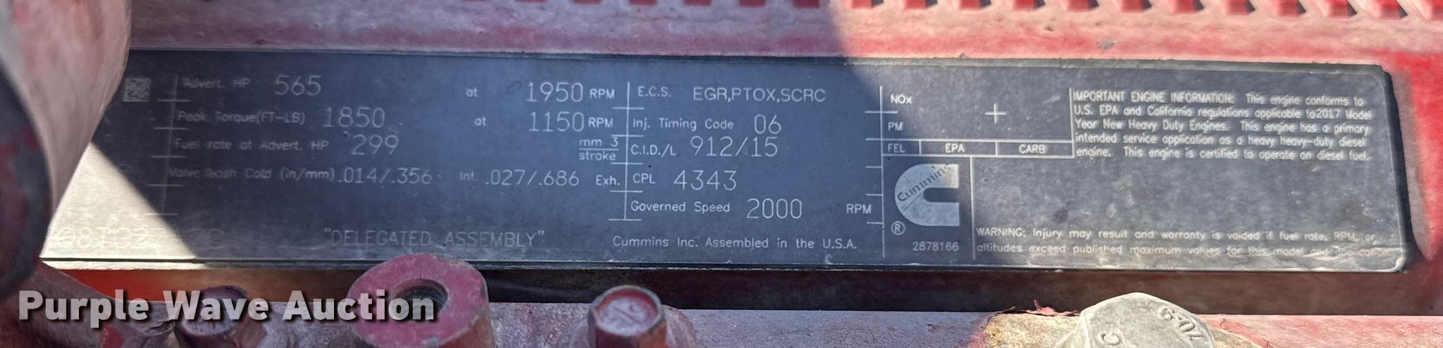 2018 Peterbilt 389 semi truck. Miles: 854,272 on odometer, Hours: 33,017 on meter, VIN: 1XPXD49X2JD472560, Unit #: 104. Engine Cummins X15, Serial: 79989499, Displacement: 15.0L, Cylinders: 6, Fuel type: Diesel. Transmission Eaton Fuller, Manual, Speed: 18. Chassis Axles: Tandem, Differential lock: Inter-axle, Suspension: Air Dump valves, Brakes: Air, GVWR: 53,200 lbs FAWR: 13,200 lbs, IAWR: 20,000 lbs, RAWR: 20,000 lbs. Interior AC, Heat, Heated mirrors, Power windows, Power locks, Cruise control, Air ride cab, Auxiliary controls, Brake controller Beds: Single, Refrigerator, Rear climate control. Features Fifth wheel type: Air operated, Sliding, Fuel tank: Dual. Tires Size: 285/75R24.5. Notes Owner's manual, Dash warning indicator: Check engine, Windshield chipped or cracked, Emissions system modified, DPF deleted. Oklahoma title. Title distribution may be delayed up to 14 days from verification of funds. Security Specialized. 3529 West 151st Street South. Kiefer, OK 74041