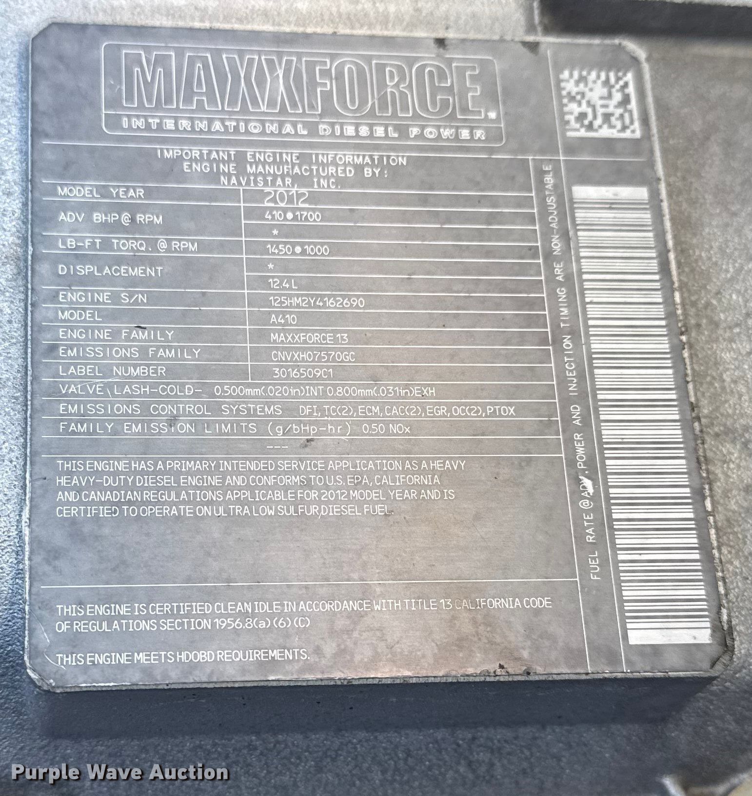 2013 International 8600 semi truck. Miles: 655,622 on odometer, Hours: 16,279 on meter, VIN: 1HSHWSJN9DJ338236. Engine International Maxxforce 13, Displacement: 12.4L, Cylinders: 6, Fuel type: Diesel. Transmission Eaton Fuller, Manual, Speed: 10. Chassis Axles: Single, Suspension: Air, Brakes: Air, GVWR: 32,000 lbs FAWR: 12,000 lbs, RAWR: 20,000 lbs. Interior AC, Heat, Heated mirrors, Power windows, Power locks, Cruise control, Air ride cab. Features Fifth wheel type: Fixed, Fuel tank: Dual. Tires Front: 295/75R22.5, Rear: 11R22.5. Oklahoma title. Seller is an Oklahoma licensed motor vehicle dealer. Buyers may be required to provide identification to the licensed dealer to comply with state laws. Title will be assigned and distributed by the dealer. Please contact the seller for distribution questions. Title distribution may be delayed up to 30 days from verification of funds. Collinsville, OK 74021