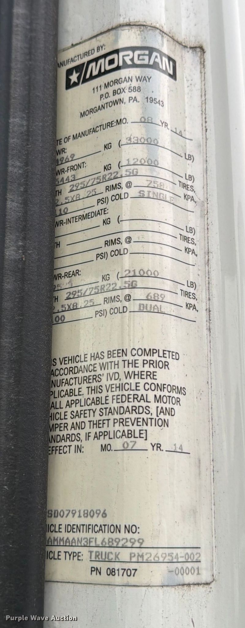 2015 International 4300 box truck. Miles: 228,395 on odometer, Hours: 11,563 on meter, VIN: 3HAMMAAN3FL689299, Unit #: 15802. Engine International Maxxforce DT466, Displacement: 7.6L, Cylinders: 6, Fuel type: Diesel. Transmission Automatic. Chassis Axles: Single, Suspension: Air, Brakes: Air, GVWR: 33,000 lbs. Interior AC, Heat, Heated mirrors, Power windows, Power locks, Cruise control, Backup camera. Features Bed Box bed, Morgan GVSD07918096, Serial: MPM26954-002, Length: 18', Width: 96", Height: 80", E-track rail system, Floor: Wood, Slider ramp 24". Tires Size: 295/75R22.5. Notes Exhaust parts missing, Dead battery, Emissions system modified, Unit must be towed or hauled , Non-operational unit. Connecticut title. Title distribution may be delayed up to 14 days from verification of funds. Efficiency Enterprises. Astoria, NY 11105