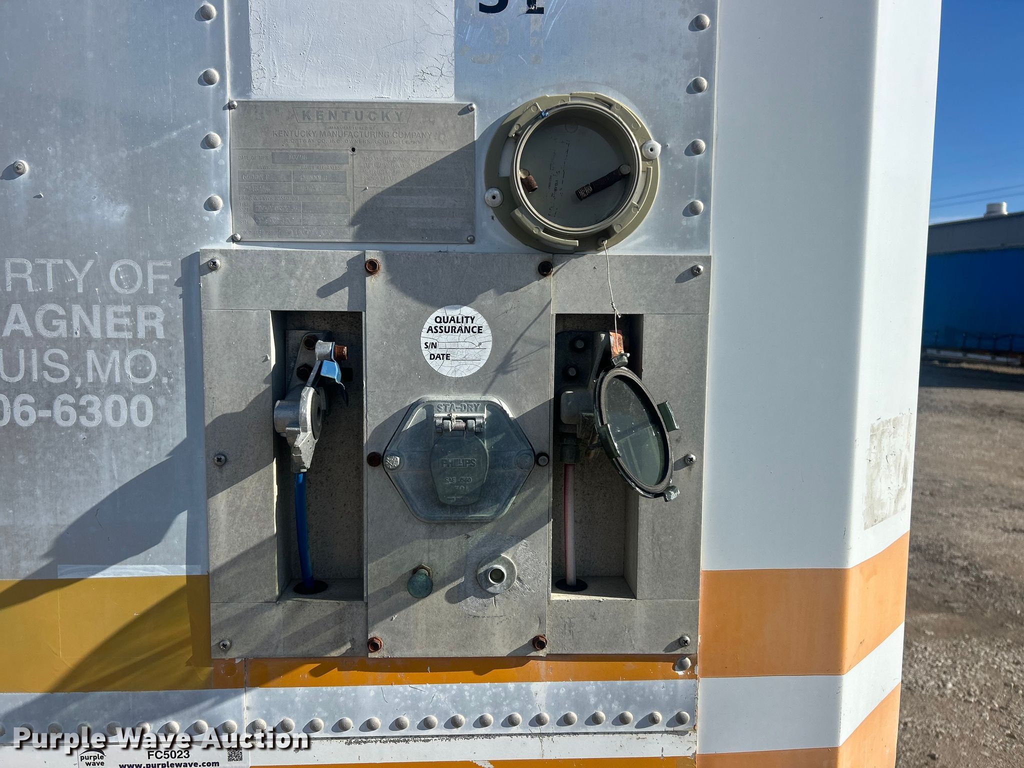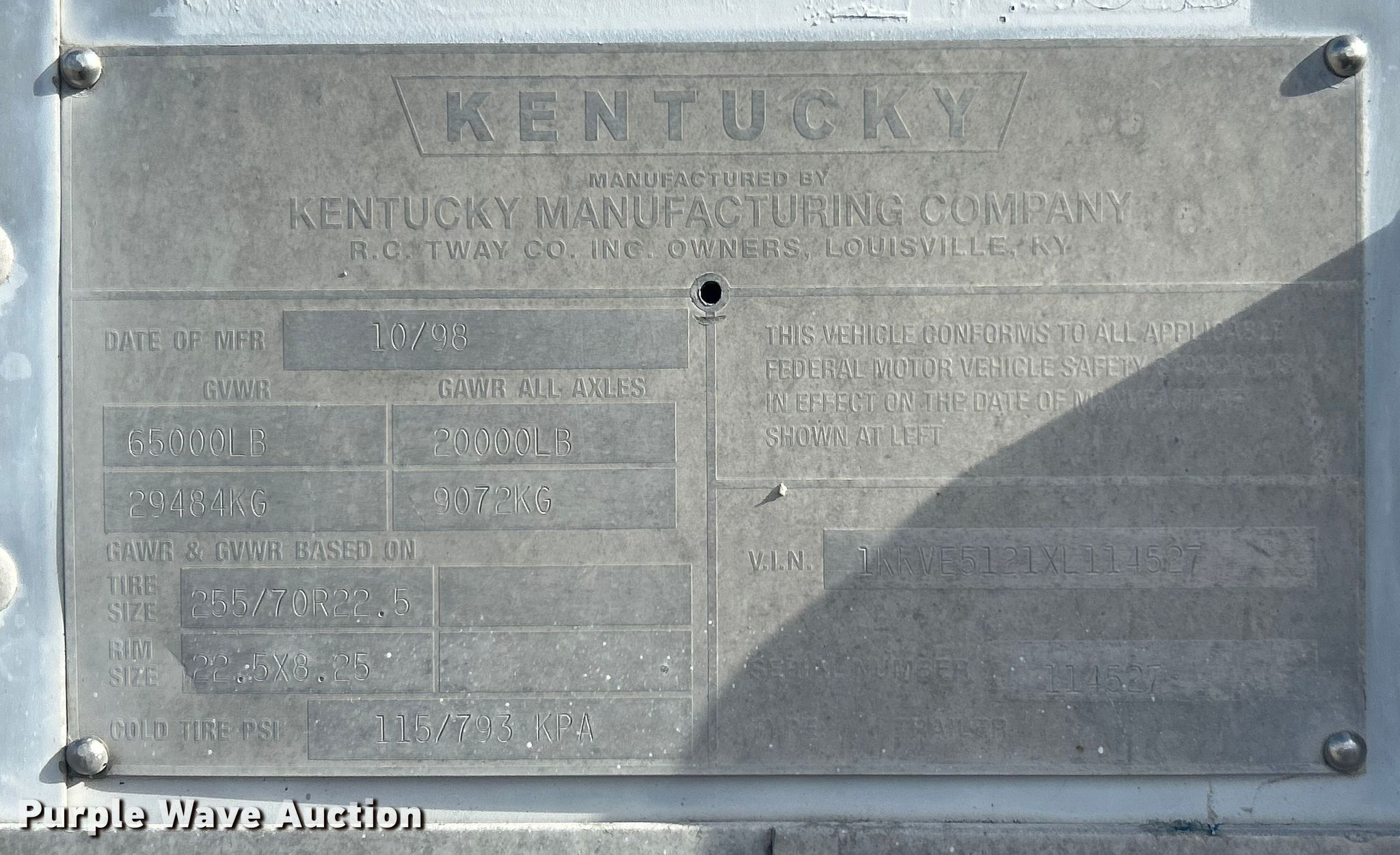 1999 Kentucky dry van trailer. VIN: 1KKVE5121XL114527. Dimensions Overall Length: 51', Width: 102". Features Deck type: Wood, Door widths 96", 52". Chassis Landing gear: Dual, Suspension: Air, Brakes: Air, Axles: Tandem, GVWR: 65,000 lbs, GAWR: 20,000 lbs. Tires Steel wheels, Size: 255/70R22.5. Missouri title. Title distribution may be delayed up to 14 days from verification of funds. Fry-Wagner. Bridgeton, MO 63044