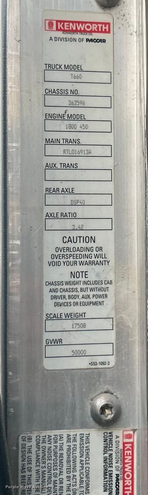 2013 Kenworth T660 semi truck. Miles: 927,337 on odometer, Hours: 23,932 on meter, VIN: 1XKAD49X0DR363596. Engine Cummins ISX15 450, Displacement: 15.0L, Cylinders: 6, Fuel type: Diesel, Engine brake. Transmission Eaton Fuller, Manual. Chassis Axles: Tandem, Differential lock: Inter-axle, Suspension: Air, Brakes: Air, GVWR: 50,000 lbs FAWR: 12,000 lbs, IAWR: 19,000 lbs, RAWR: 19,000 lbs. Interior AC, Heat, Heated mirrors, Power windows, Cruise control, Air ride cab, Sleeper Sleeper length: 60", Beds: Single, Rear climate control. Features Deck plate: Aluminum, Fifth wheel type: Air operated, Sliding, Fuel tank: Dual. Tires Size: 295/75R22.5. Notes Trailer air lines missing. Missouri title. Title distribution may be delayed up to 14 days from verification of funds. Bourbon, MO 65441