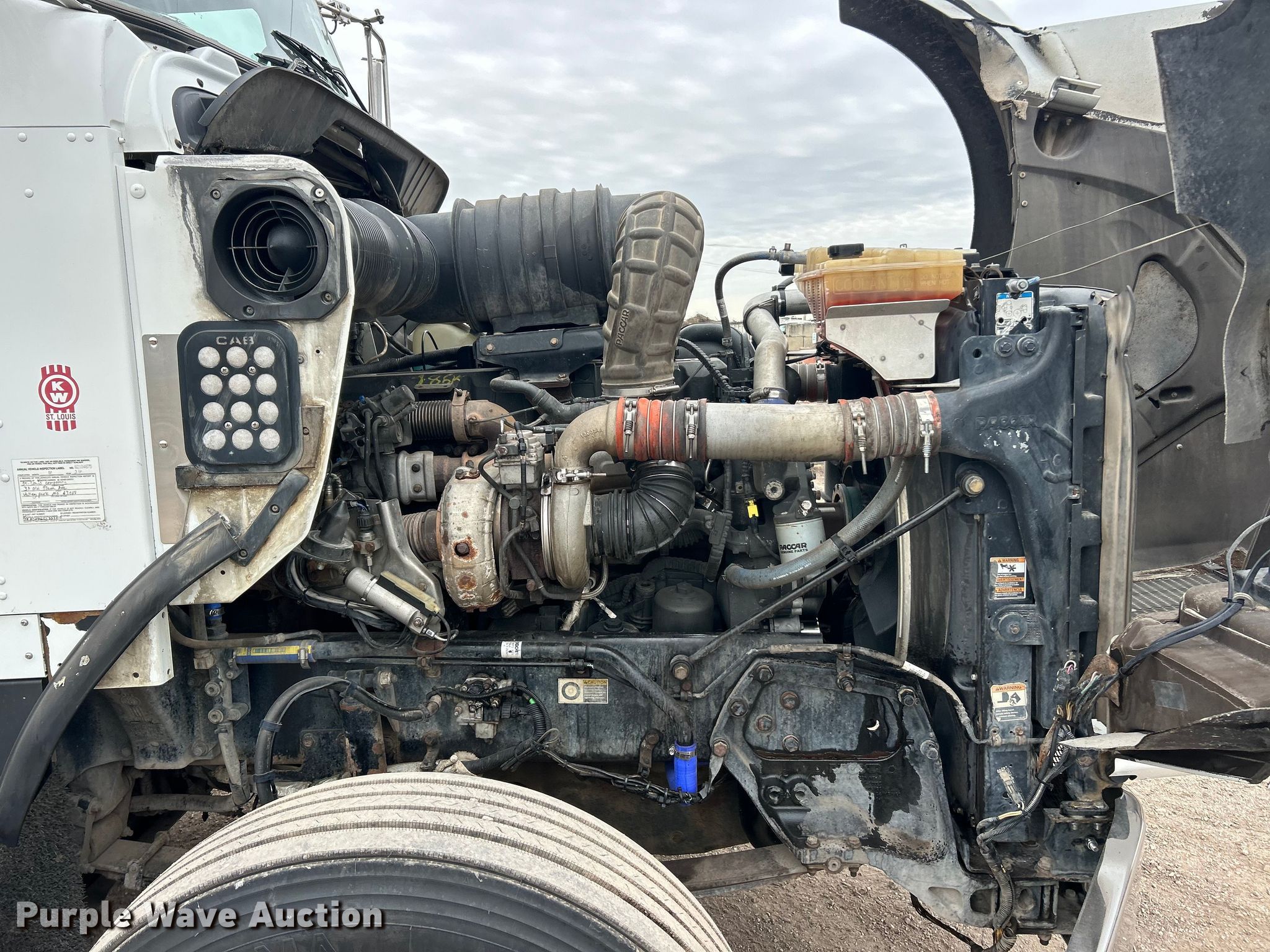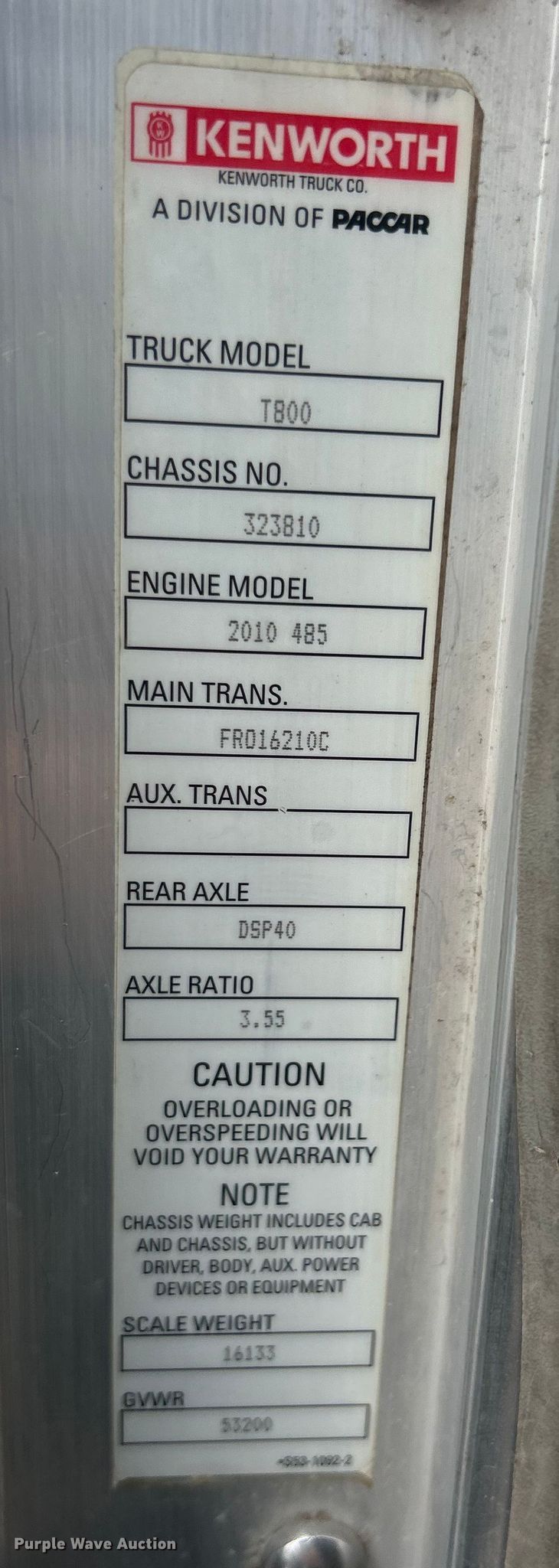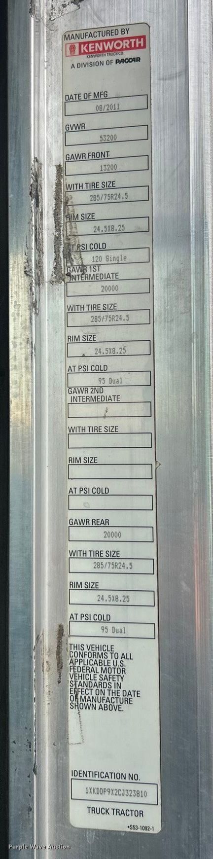 2012 Kenworth T800 semi truck. Miles: 393,013 on odometer, Hours: 11,396 on meter, VIN: 1XKDDP9X2CJ323810. Engine Paccar MX, Displacement: 12.9L, Cylinders: 6, Fuel type: Diesel, Engine brake. Transmission Eaton Fuller, Manual. Chassis Axles: Tandem, Differential lock: Inter-axle, Suspension: Air, Brakes: Air, PTO, Wet kit, GVWR: 53,200 lbs FAWR: 13,200 lbs, IAWR: 20,000 lbs, RAWR: 20,000 lbs. Interior AC, Heat, Heated mirrors, Cruise control. Features Deck plate: Aluminum, Fifth wheel type: Air operated, Sliding, Fuel tank: Single. Tires Size: 285/75R24.5. Notes Windshield chipped or cracked. Missouri title. Title distribution may be delayed up to 30 days from verification of funds. St. Louis Composting. Belleville, IL 62226