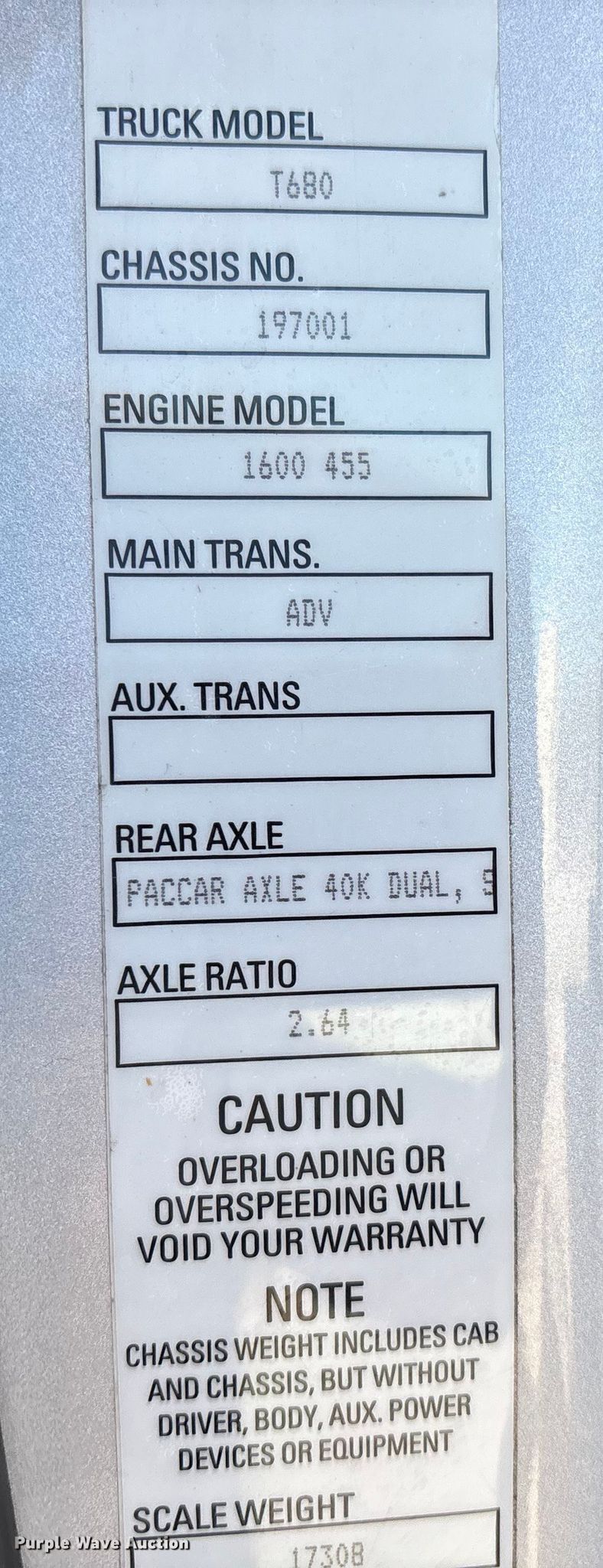 2018 Kenworth T680 semi truck. Miles: 670,830 on odometer, Hours: 9,892 on meter, VIN: 1XKYDP9X8JJ197001. Engine Paccar MX-13, Serial: Y229734, Displacement: 12.9L, Cylinders: 6, Fuel type: Diesel, HP: 405. Transmission Automated manual. Chassis Axles: Tandem, Differential lock: Inter-axle, Suspension: Air, Brakes: Air, Truck chassis: 13' 6", GVWR: 53,200 lbs. Interior AC, Heat, Heated mirrors, Power windows, Power locks, Cruise control, Air ride cab, Auxiliary controls, Sleeper Sleeper length: 60", Beds: Double bunk, Refrigerator, Microwave, Rear climate control. Features Deck plate: Aluminum, Fifth wheel type: Air operated, Sliding, Fuel tank: Dual. Tires Size: 295/75R22.5. Notes Collision damage , Possible rodent damage, Unit must be towed or hauled. Nebraska title. Title distribution may be delayed up to 14 days from verification of funds. Aurora, NE 68818