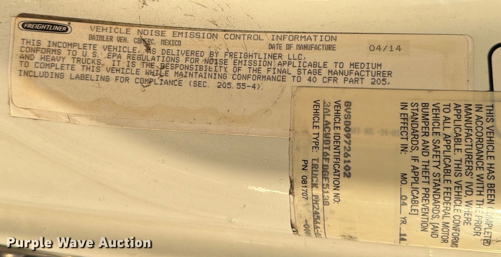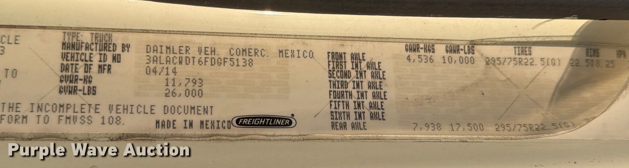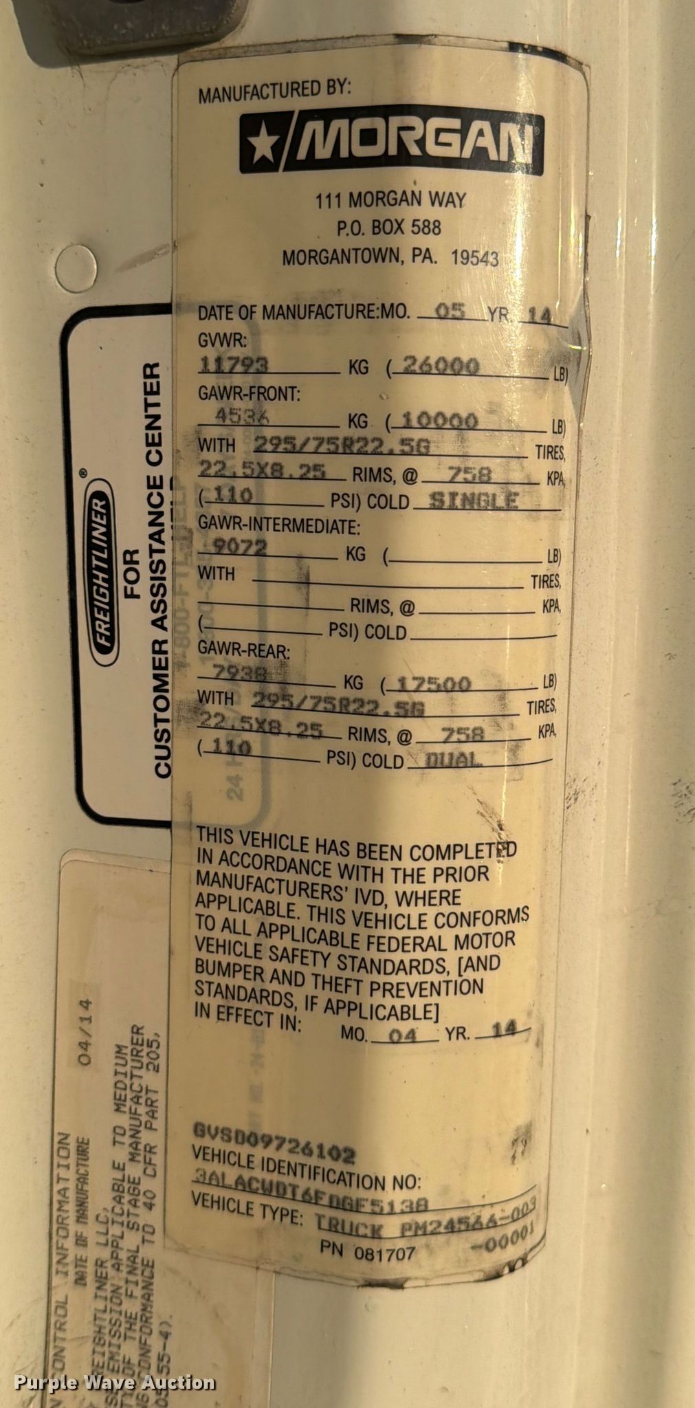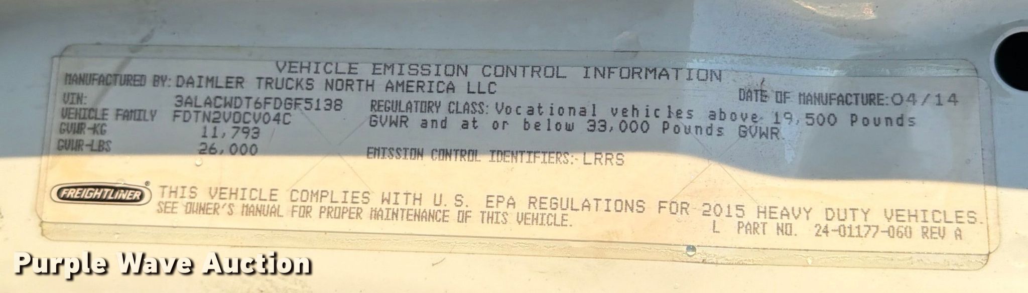 2015 Freightliner Business Class M2 box truck. Miles: 347,124 on odometer, Hours: 12,618 on meter, VIN: 3ALACWDT6FDGF5138, Unit #: 96608725. Engine Cummins ISB6.7 240, Serial: 58389391, Displacement: 6.7L, Cylinders: 6, Fuel type: Diesel, HP: 240. Transmission Automatic. Chassis Axles: Single, Suspension: Air, Brakes: Air, GVWR: 26,000 lbs. Interior AC, Heat, Heated mirrors, Cruise control. Features Bed Box bed, Morgan GVSD09726102, Length: 26', Width: 97", Height: 97", E-track rail system, Floor: Wood. Tires Size: 295/75R22.5. Notes Dash warning indicator: Check engine, Jump start required during on-site data collection. Repossessed item, stored at a secured facility. Please review REQUIRED REMOVAL INSTRUCTIONS. Titles will be distributed after confirmation of payment and removal. New Jersey title. Title distribution may be delayed up to 30 days from verification of funds. Lender Owned. 781 Jacob Harris Lane. Glassboro, NJ 08028