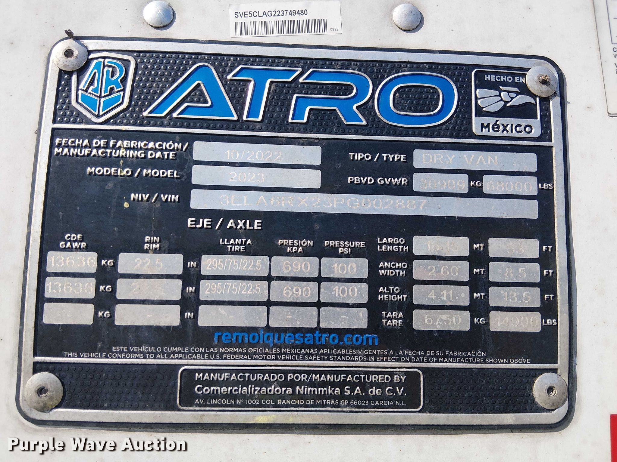 Purple Wave is selling a used Dry Van Trailer in California. This item is a 2023 Atro dry van trailer with the following: VIN: 3ELA6RX23PG002887, Unit #: 76797095