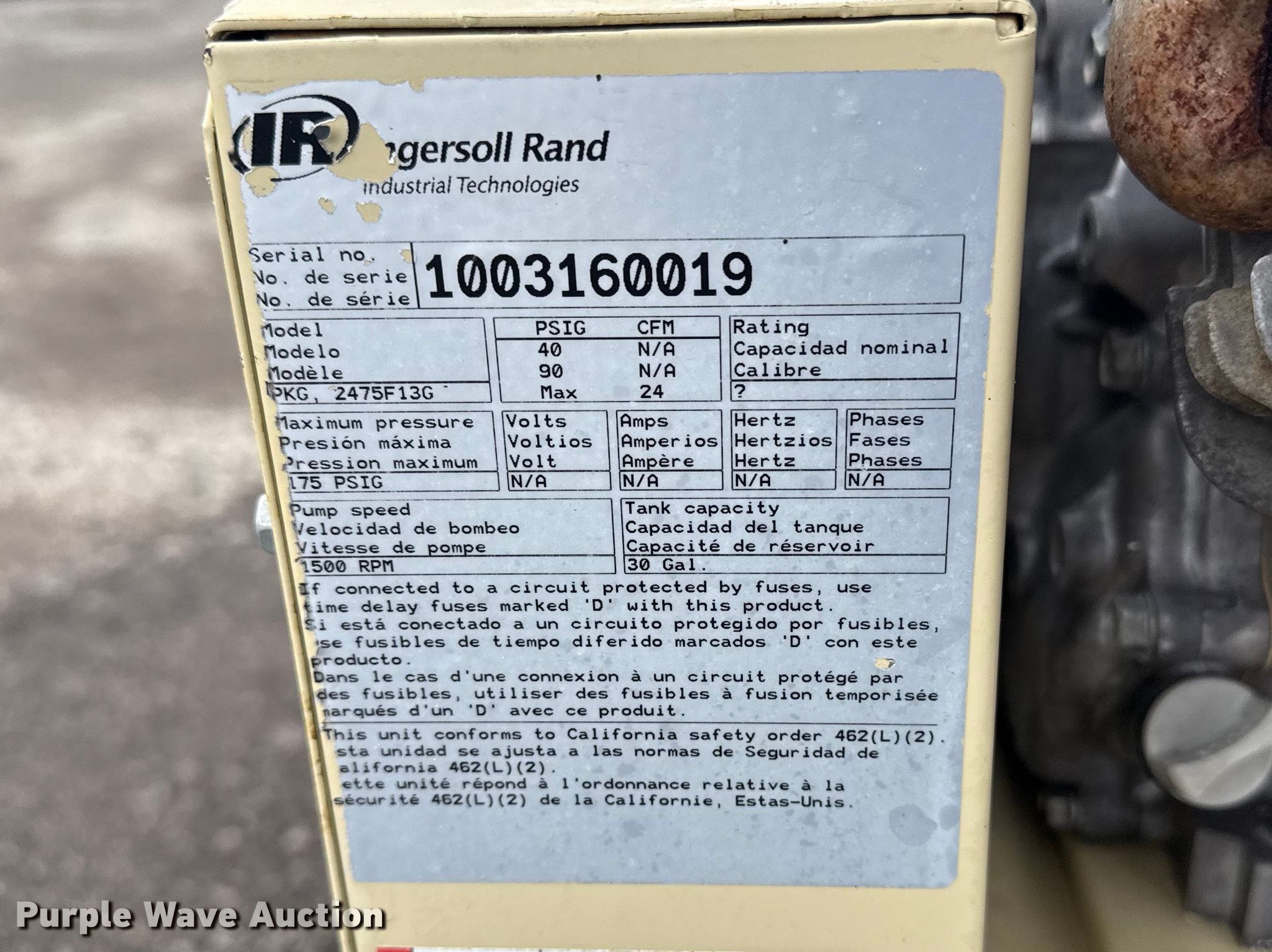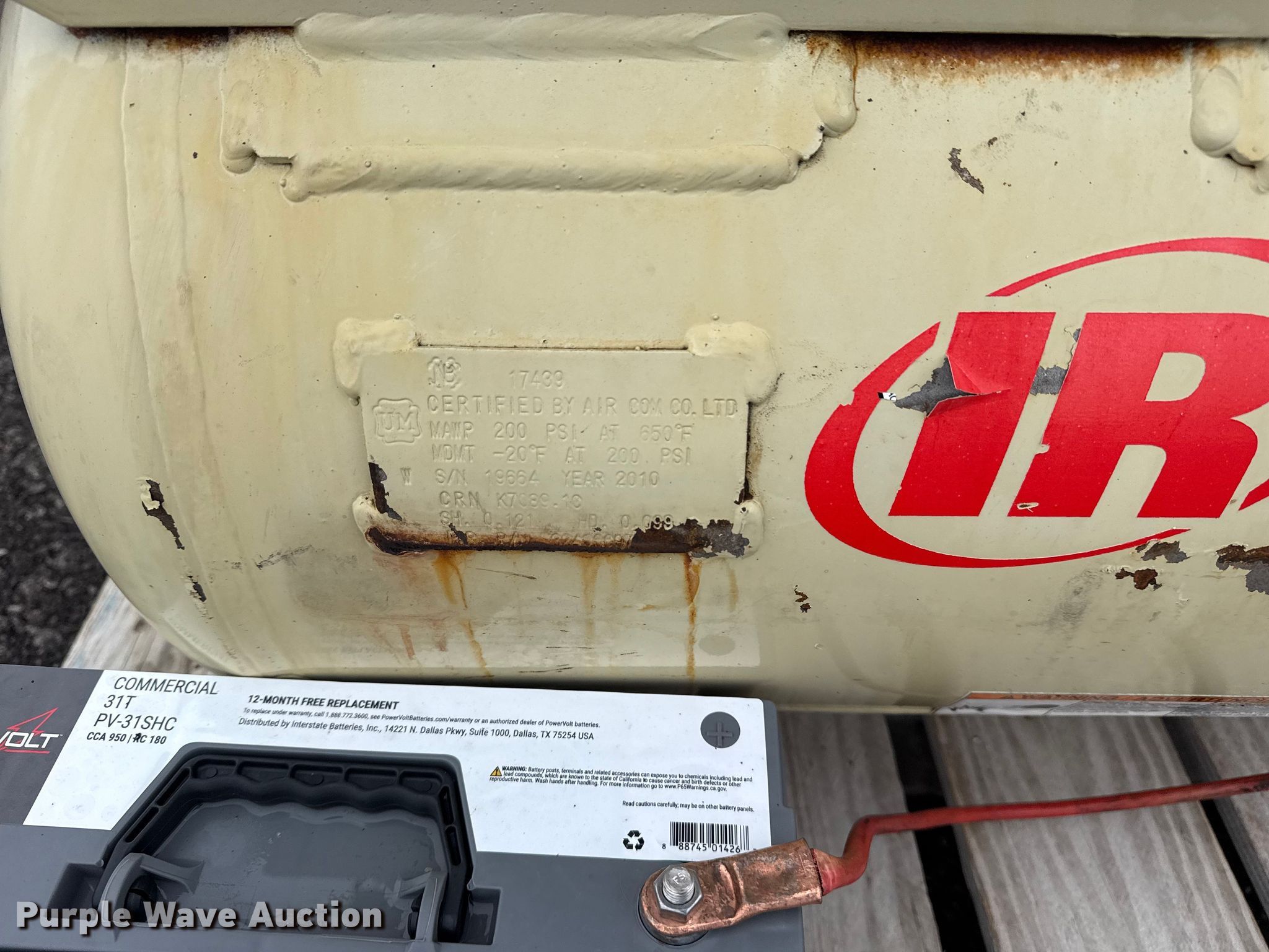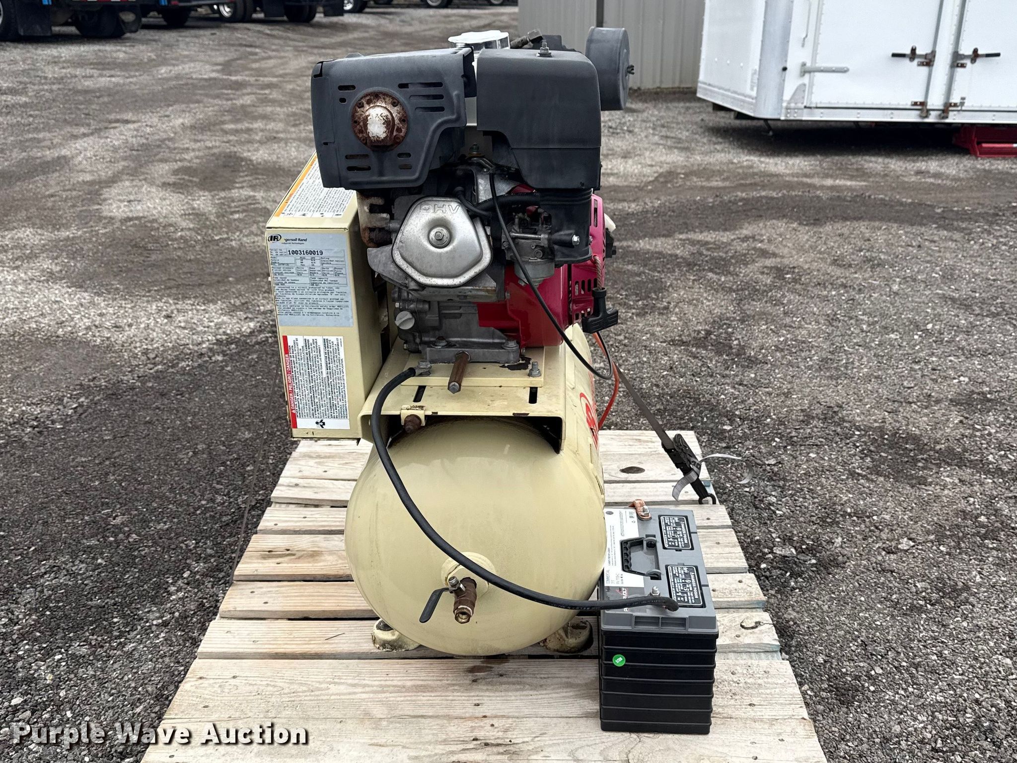 Purple Wave is selling a used Air Compressor in Oklahoma. This item is a Ingersoll Rand air compressor with the following: Serial: 1003160019