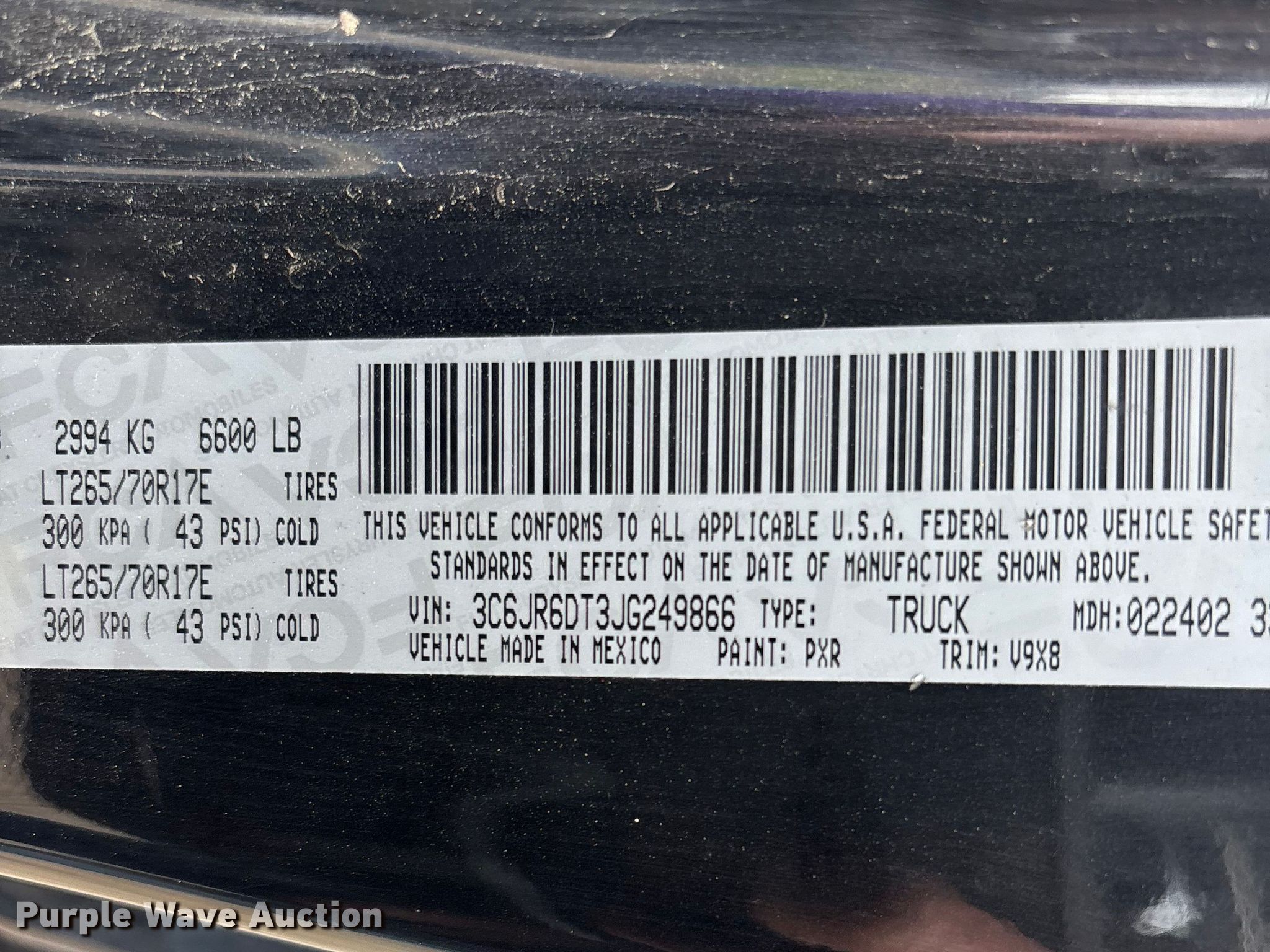 - VIN: 3C6JR6DT3JG249866