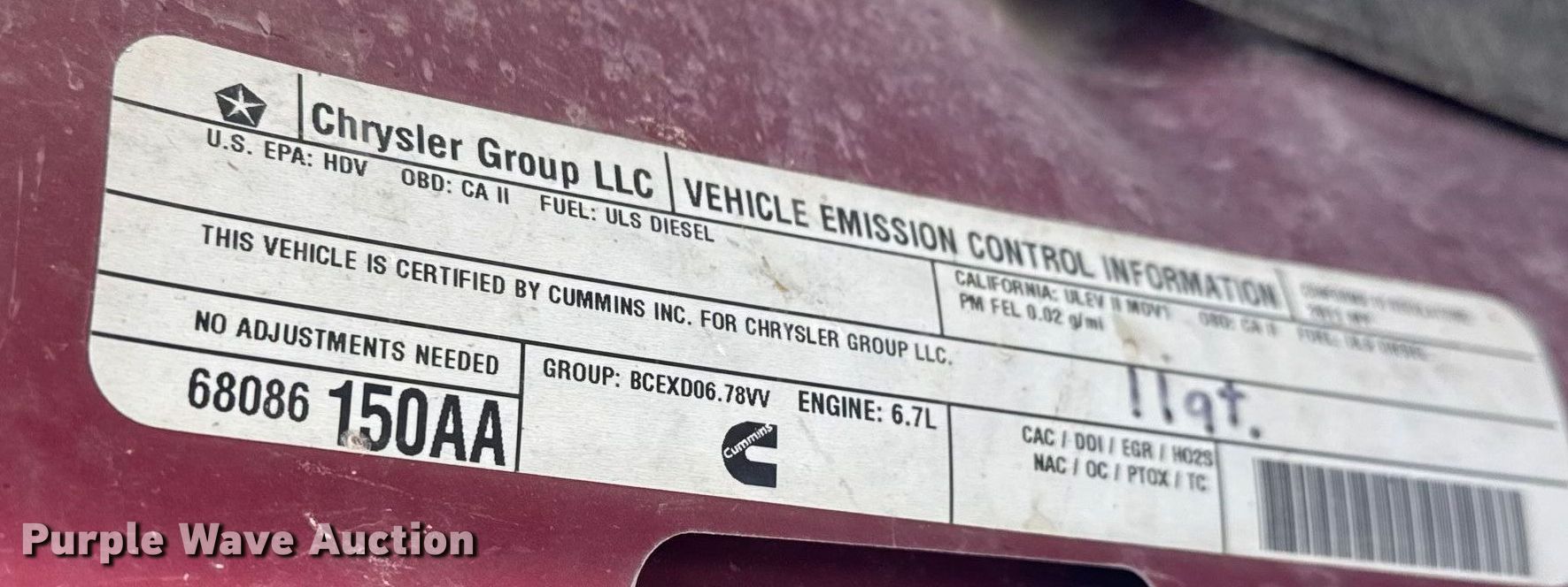 2011 Dodge Ram 2500 Crew Cab pickup truck. Miles: 284,446 on odometer, Hours: 6,516 on meter, VIN: 3D7UT2CL0BG585984. Engine Displacement: 6.7L, Cylinders: 6, Fuel type: Diesel. Transmission Automatic, Four wheel drive. Interior AC, Heat, Seat: Heated, Power driver, Power passenger, Heated mirrors, Power windows, Power locks, Cruise control, Backup camera, Brake controller, Powered sunroof. Features Hitch: Gooseneck. Tires Size: 265/60R17. Notes Dash warning indicator: TPMS, Windshield chipped or cracked, Hail damage, Emissions system modified, DEF deleted, EGR deleted, Unknown operating condition of backup camera, Transmission issues, slips , Unit must be towed or hauled. Colorado title. Title distribution may be delayed up to 30 days from verification of funds. Fairbank Equipment, Inc... Wichita, KS 67217