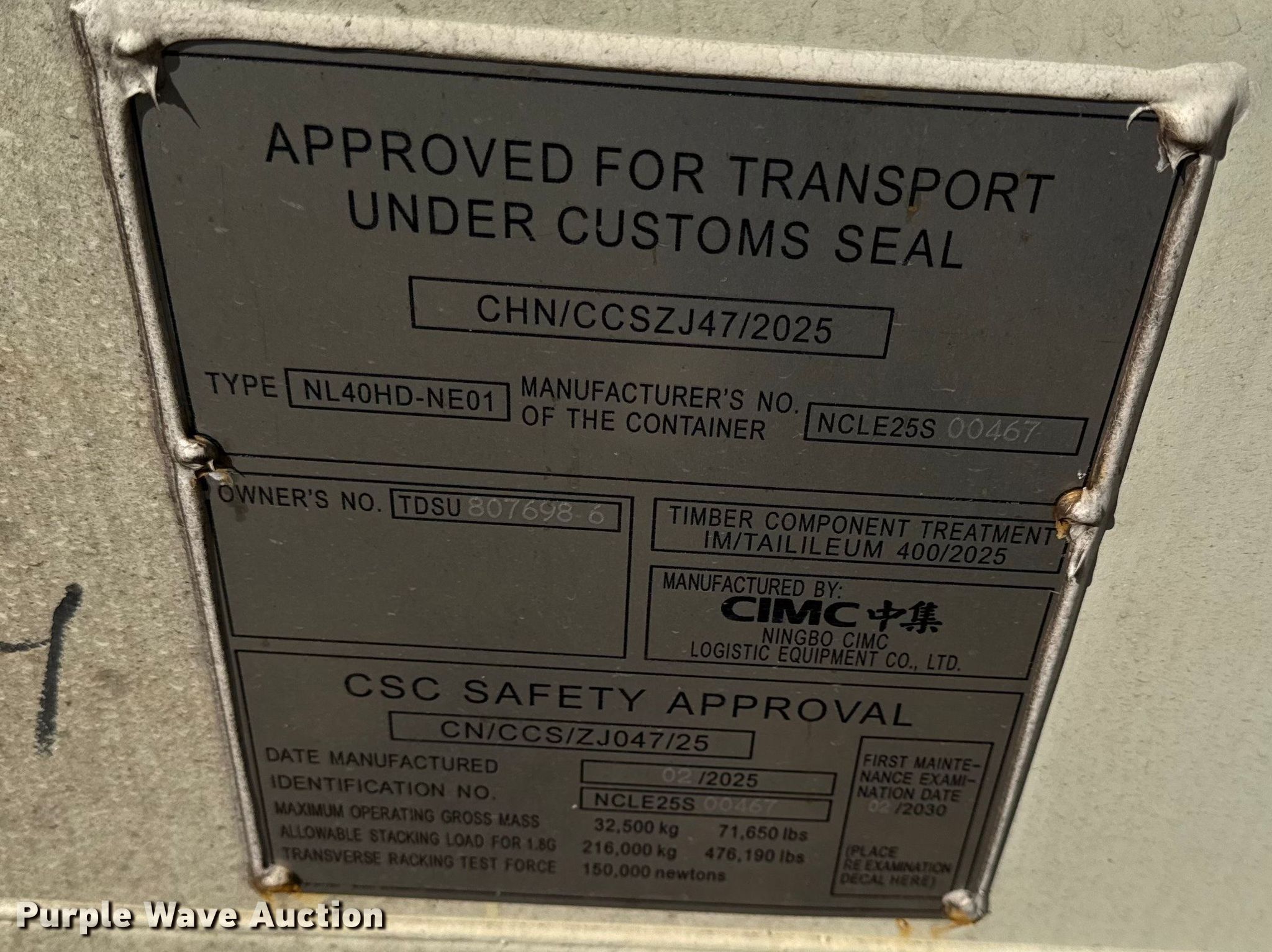 Purple Wave is selling a used Storage or Shipping Container in Kansas. This item is a 2025 shipping container with the following: Serial: NCLE25S00467, Length: 40'