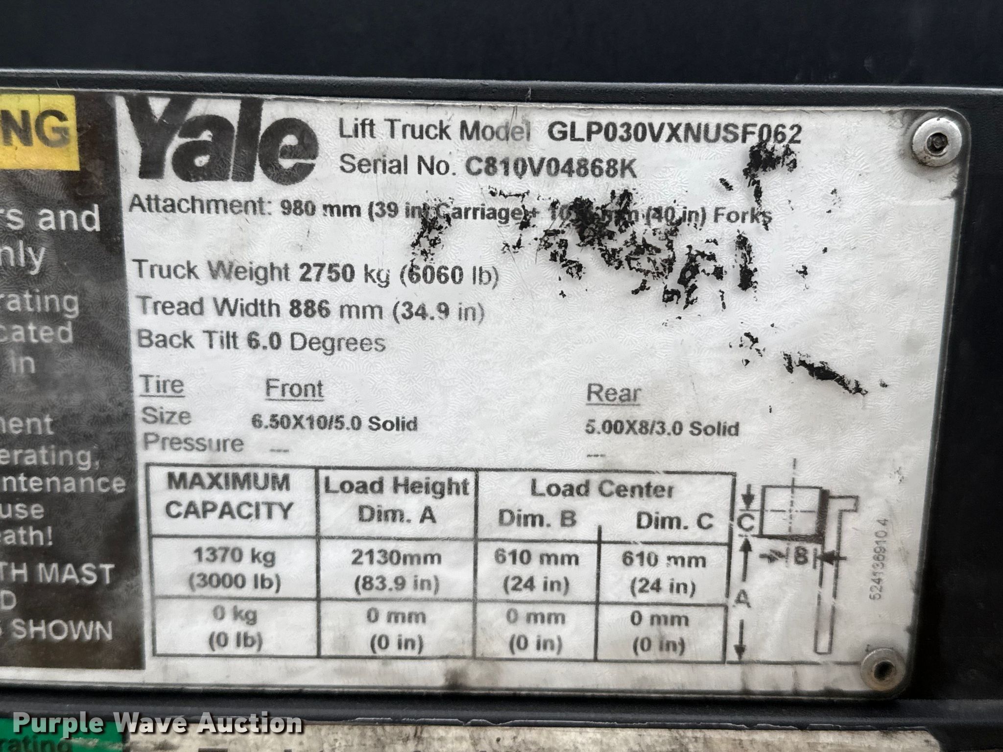 Purple Wave is selling a used Warehouse Forklift in Kansas. This item is a Yale GLP030VXNUSF062 forklift with the following: Hours: Unknown, Serial: C810V04868K