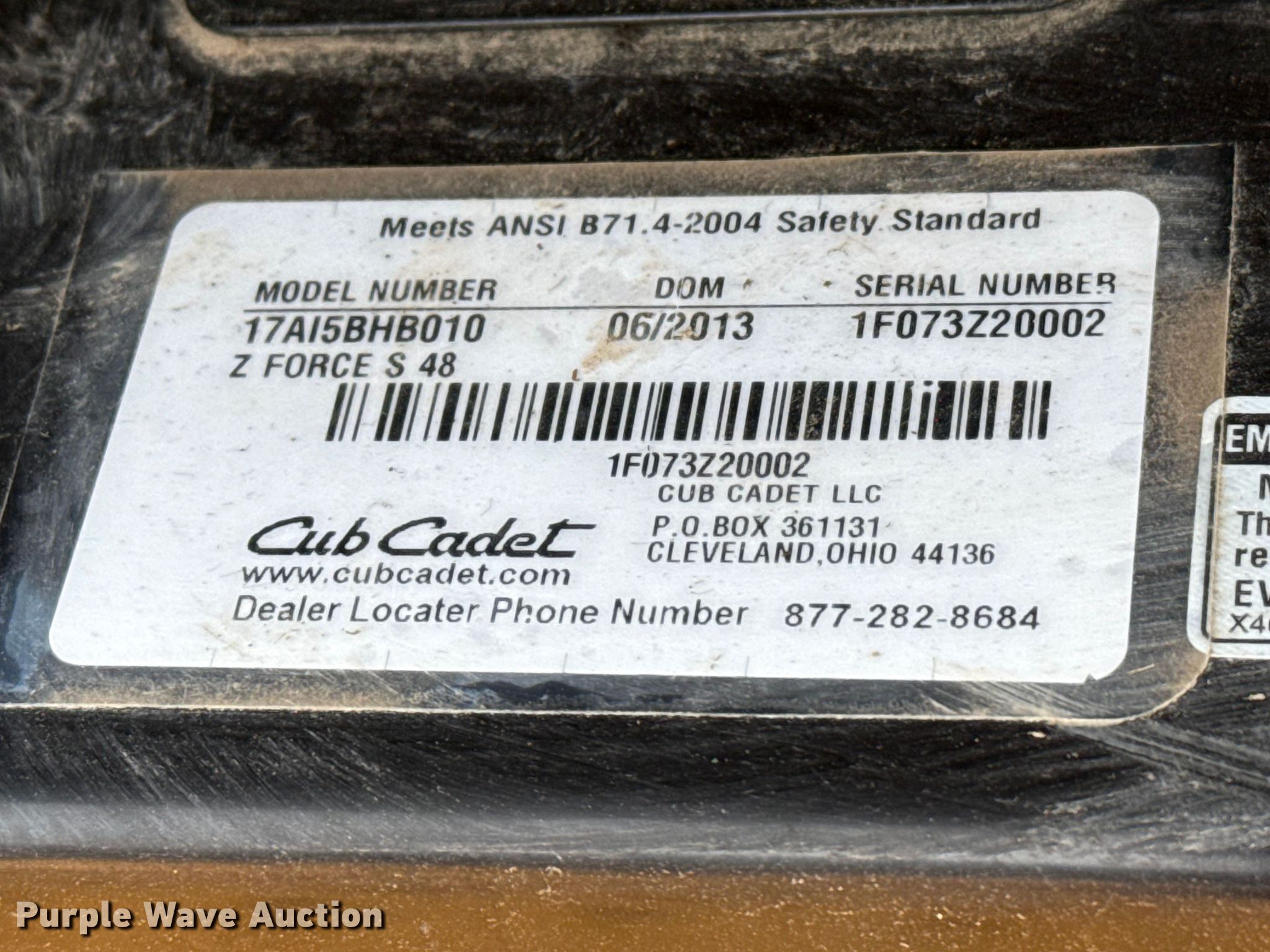Purple Wave is selling a used Lawn Mower in Kansas. This item is a 2013 Cub Cadet A Force S ZTR lawn mower with the following: Hours: 425 on meter, Cutting width: 48", Serial: 1F073Z20002