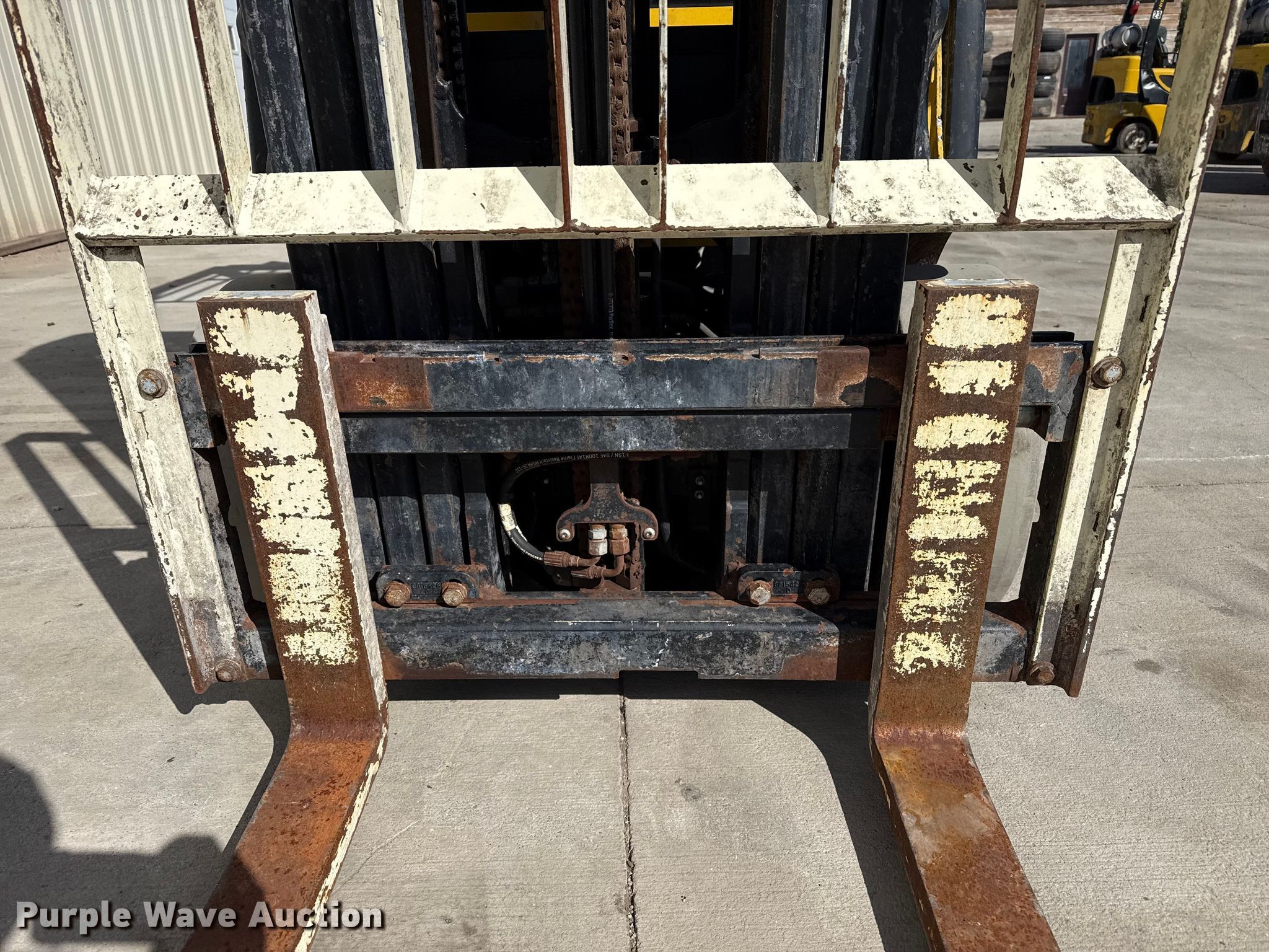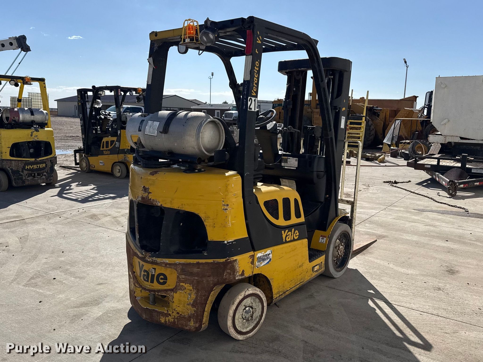 Yale GLC050VXNESE083 forklift. Hours: 10,484 on meter, Serial: C910V12648U. Engine Cylinders: 4, Fuel type: LPG LP bottle: Not included. Transmission Powershift. Operators station Canopy. Features Maximum lift capacity: 4,800 lbs, Maximum lift height: 189", Collapsed mast height: 82", Mast stages: 3, Side shift, Mast tilt, Fork length: 42". Tires Front: 21x7x15, Rear: 16x5x10&1/2, Solid. Peters Farms. Sublette, KS 67877