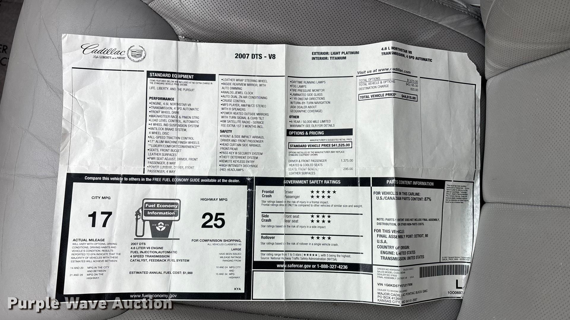 Purple Wave is selling a used Passenger Vehicle in Missouri. This item is a 2007 Cadillac DTS with the following: Miles: 97,013 on odometer, VIN: 1G6KD57Y07U217656