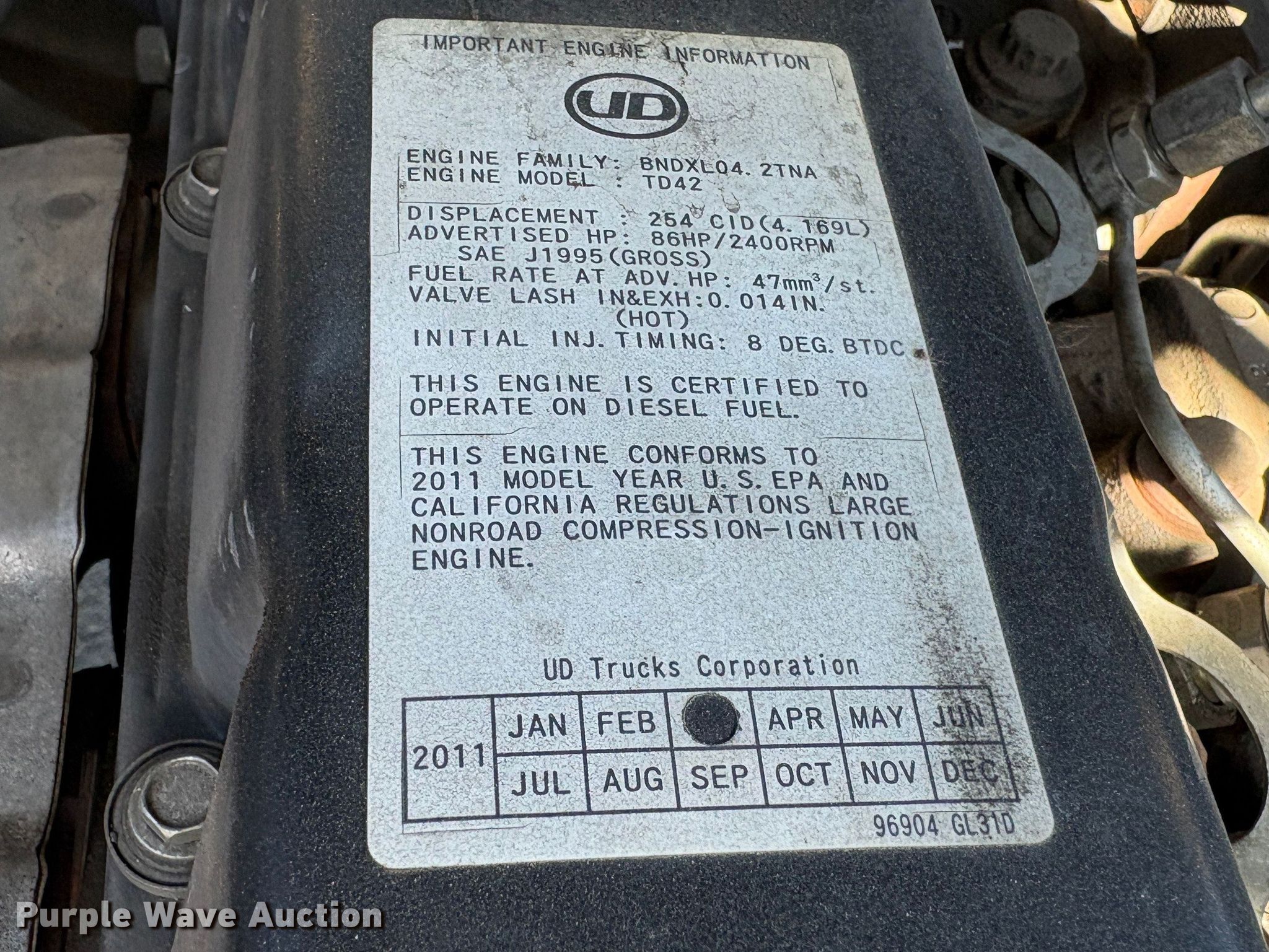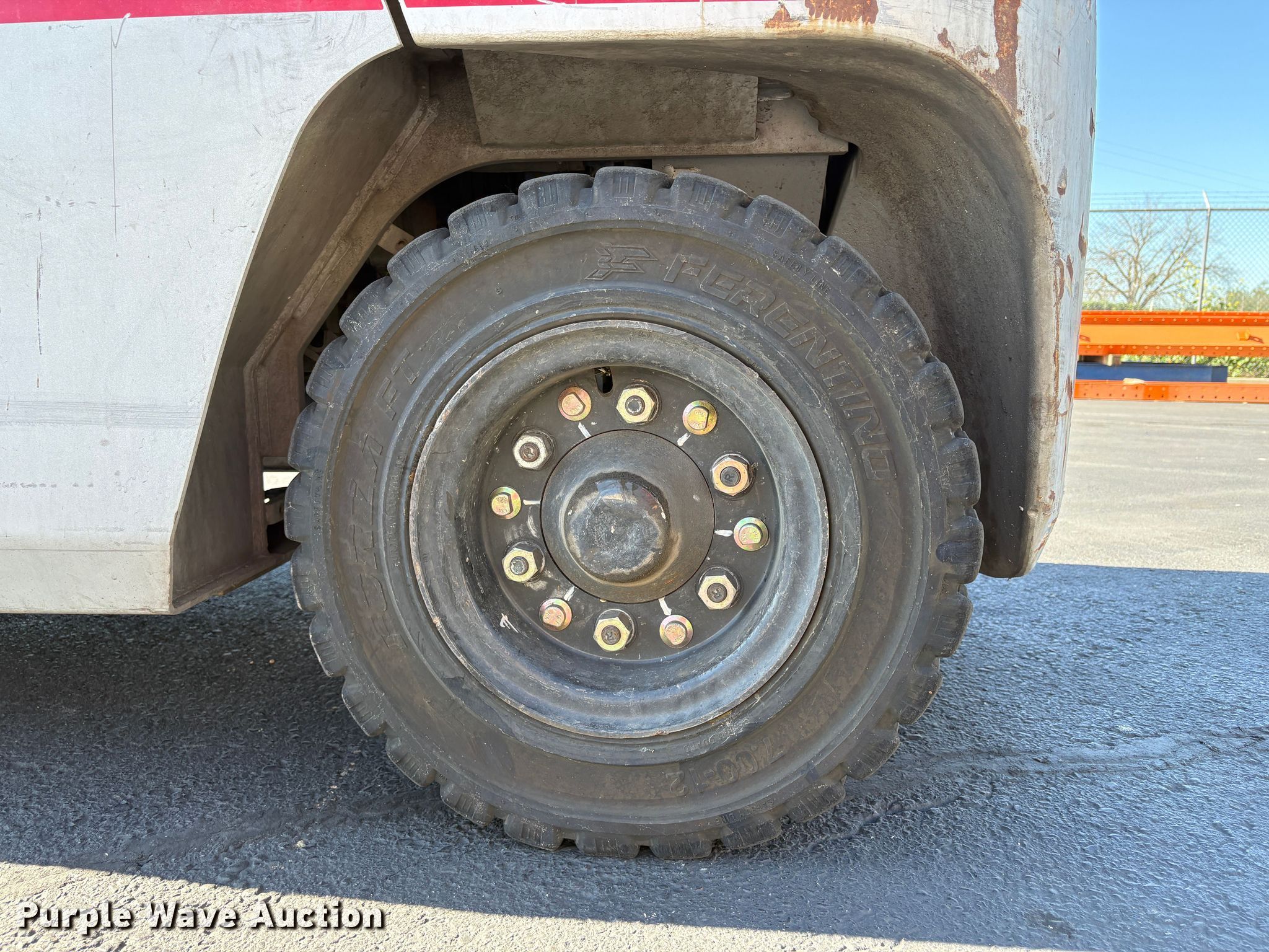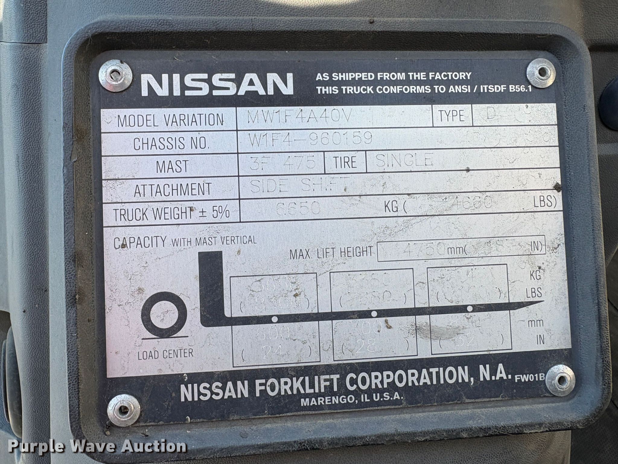 2011 Nissan PFD90Y forklift. Hours: 1,786 on meter, Serial: W1F4-960159, Unit #: SFS3074. Engine UD TD42, Displacement: 4.169L, Cylinders: 6, Fuel type: Diesel. Transmission Automatic. Operators station OROPS. Features Maximum lift capacity: 8,300 lbs, Maximum lift height: 187", Mast stages: 3, Side shift, Mast tilt, Fork length: 96". Tires Front: 300-15, Rear: 7.00-12, Solid. Notes Warning indicator: Master warning. Ferguson. Stockton, CA 95203