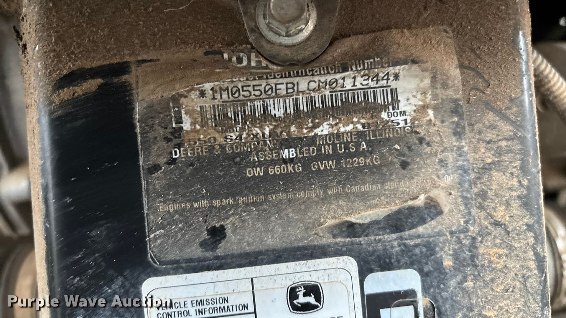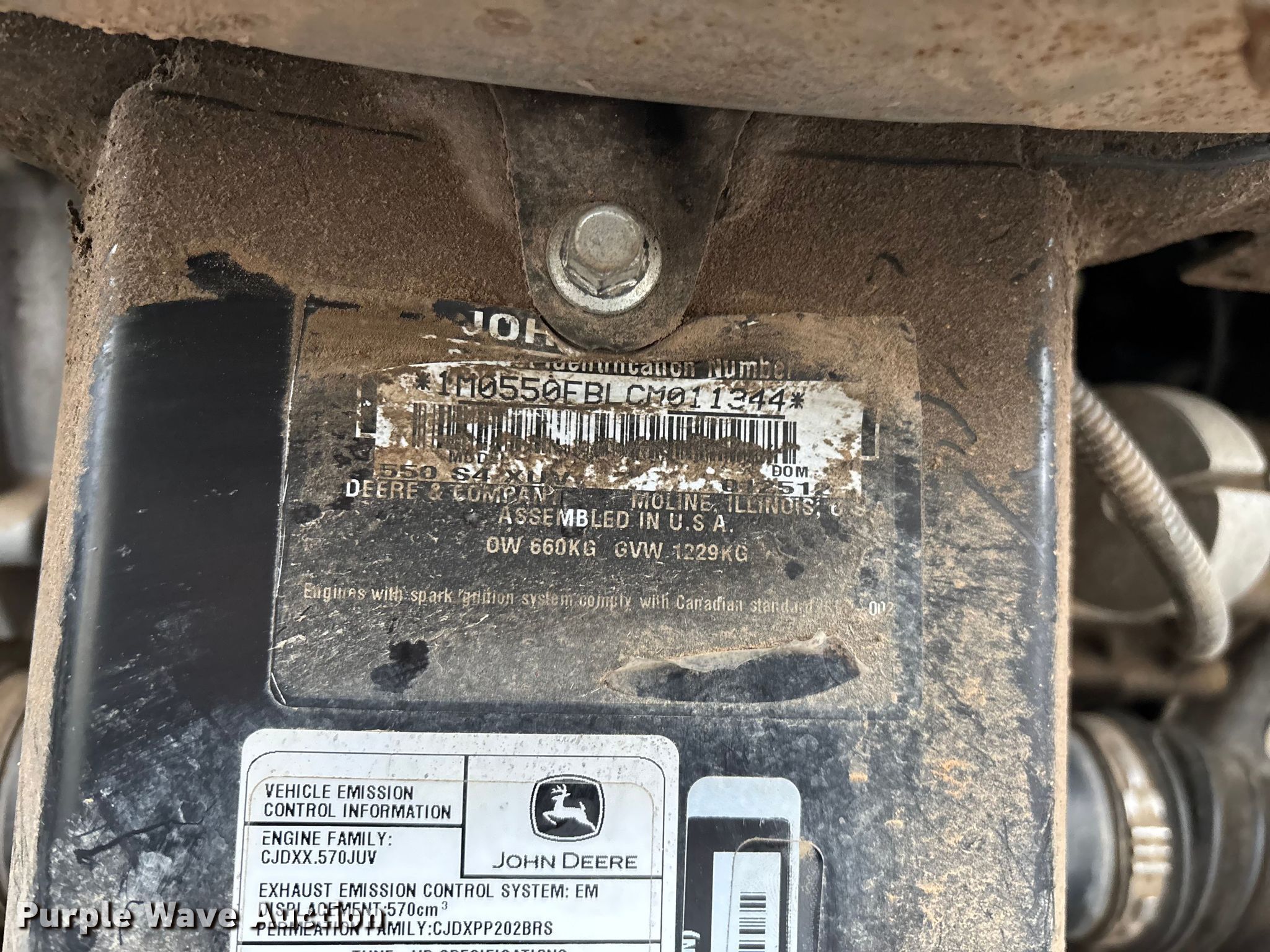 2012 John Deere XUV550 S4 utility vehicle. Hours: 464 on meter, VIN: 1M0550FBLCM011344. Engine Cylinders: 2, Fuel type: Gas, Electric start. Transmission Automatic. Chassis Four wheel drive/ All wheel drive. Operators station OROPS, Canopy. Features Grille guard, Receiver hitch, Dump bed 36" L x 50" W, Dump bed type: Manual. Tires Front: 26x8.00R12, Rear: 26x10.00R12. Transfer of ownership documentation will be a bill of sale. Carthage, MO 64836