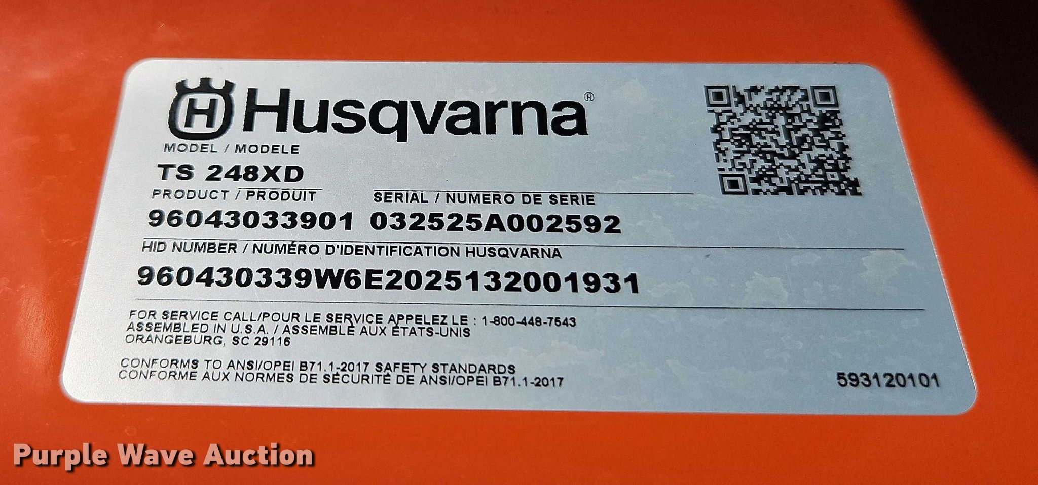 Purple Wave is selling a used Lawn Mower in Missouri. This item is a Husqvarna TS 248XD lawn mower with the following: Hours: 1 on meter, Cutting width: 48", Serial: 032525A002592