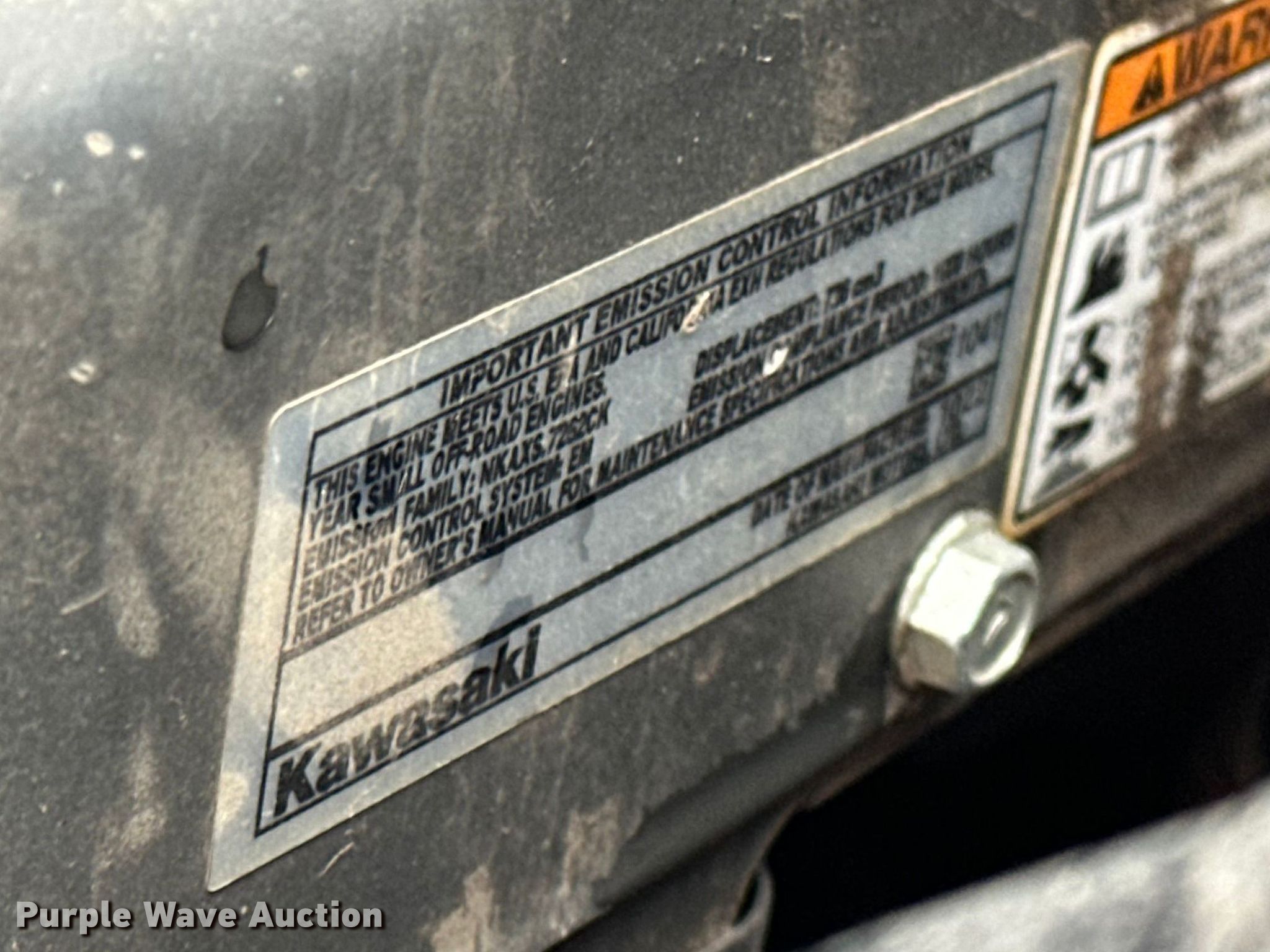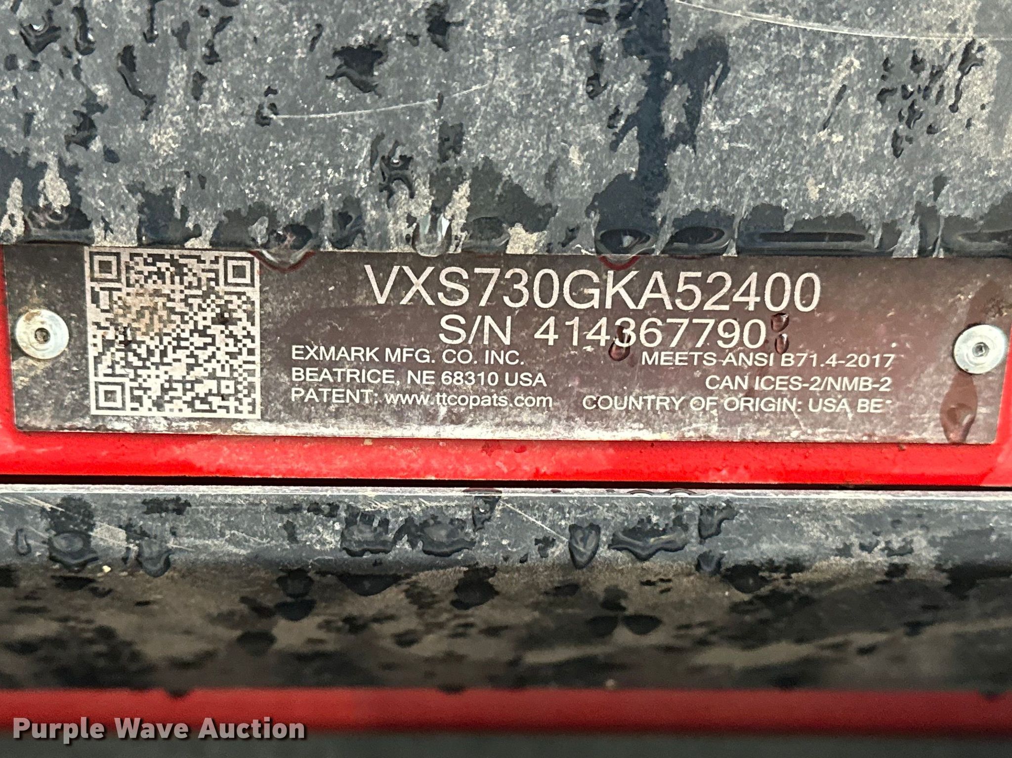 Exmark Vertex ZTR lawn mower. Hours: 2,248 on meter, Cutting width: 52", Serial: 414367790, Unit #: 322. Engine Kawasaki FX730V, Displacement: 726cc, Cylinders: 2, Fuel type: Gas. Transmission Hydrostatic. Tires Front: 13x5.00-6, Rear: 20x10.50-8. Notes Possible engine issues, will not stay running. Signature Landscape. Edwardsville, KS 66111