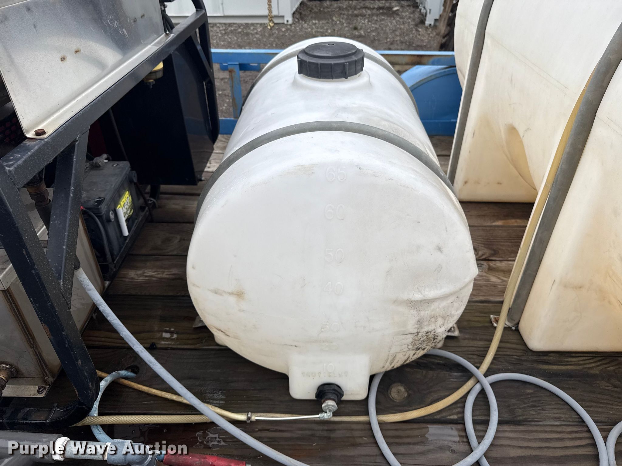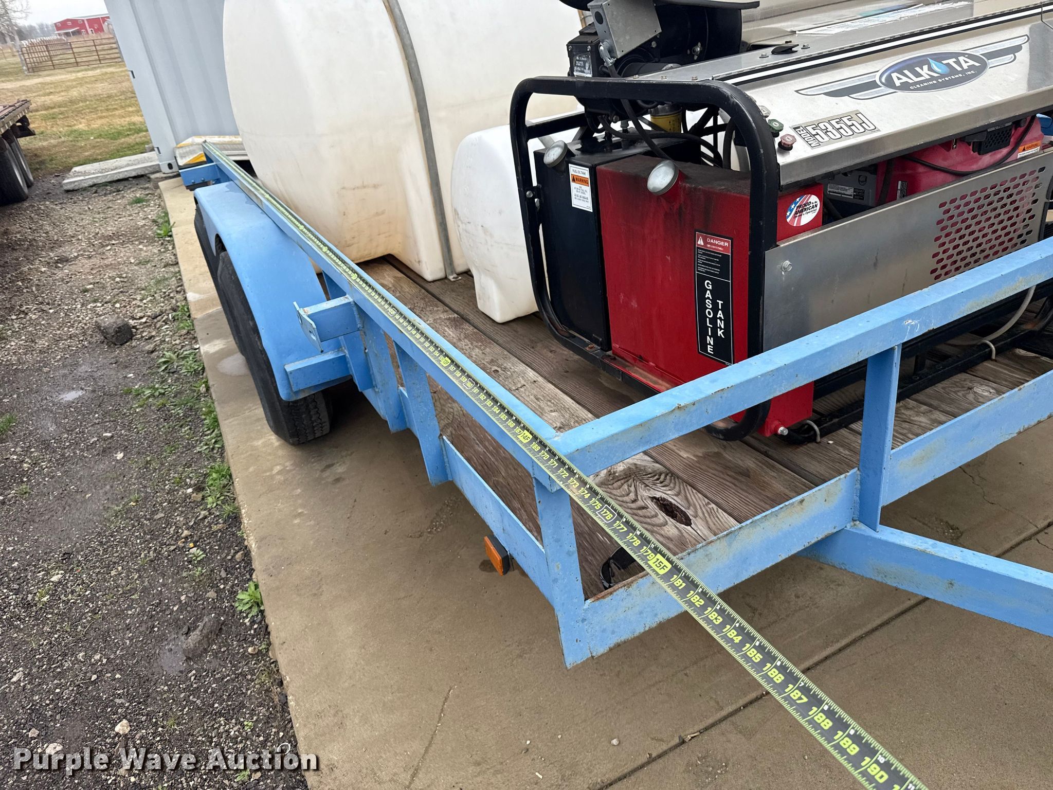 Utility trailer with Alkota pressure washer. Serial: 249341. Dimensions Overall Length: 17', Width: 96", Height: 15". Features Alkota 5355J pressure washer Honda V-Twin engine Cylinders: 2, Fuel type: Gas, HP: 20, Wayne electric burner, (2) poly tanks Capacity: 65 gallons, Capacity: 525 gallons, Hose reel, Wand, Shop built utility trailer Suspension: Spring, Ball hitch: 2". Tires Front: 7.50-16LT. Notes Possible electrical issues, trailer plug-in may need rewired. Transfer of ownership documentation will be a bill of sale. Kiefer, OK 74041