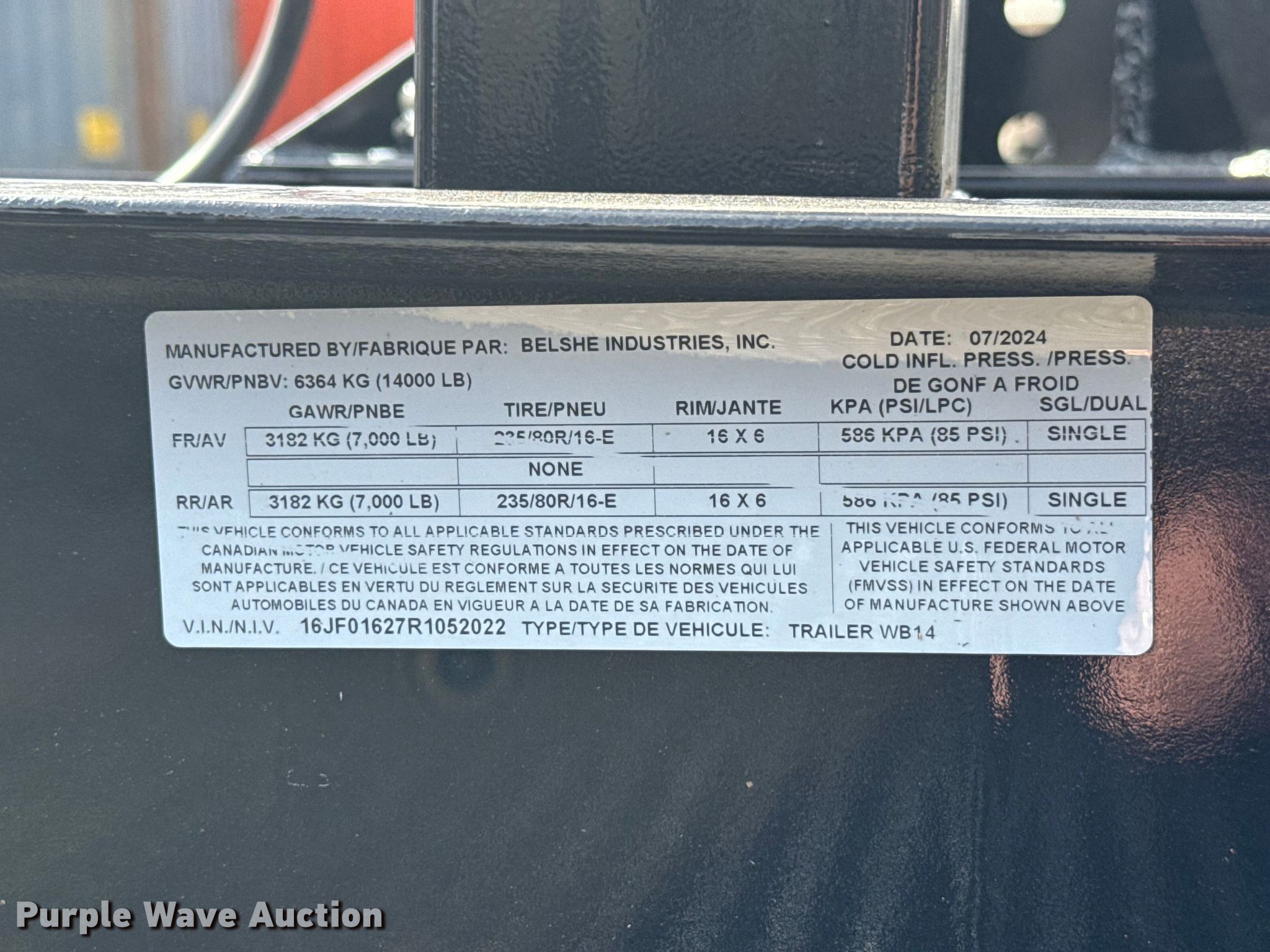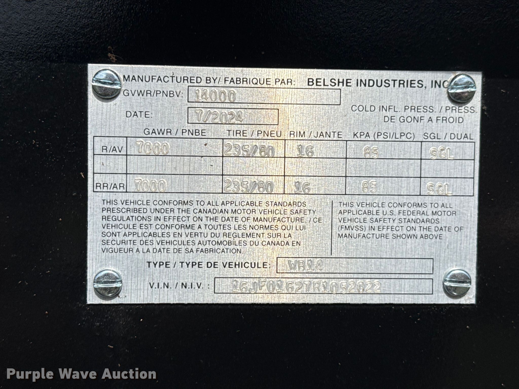 2024 Belshe WB14 equipment trailer. VIN: 16JF01627R1052022. Dimensions Overall Length: 25', Width: 101", Deck Length: 16', Width: 80", Ramps: Manual Length: 71". Features Deck type: Wood. Chassis Hitch: Pintle, Landing gear: Single, Suspension: Spring, Brakes: Electric, Axles: Tandem, GVWR: 14,000 lbs, GAWR: 7,000 lbs. Tires Steel wheels, Size: ST235/80R16. This is worksite support equipment and will not come with a title. Transfer of ownership documentation will be a bill of sale. Belshe Trailers. Tecumseh, OK 74873