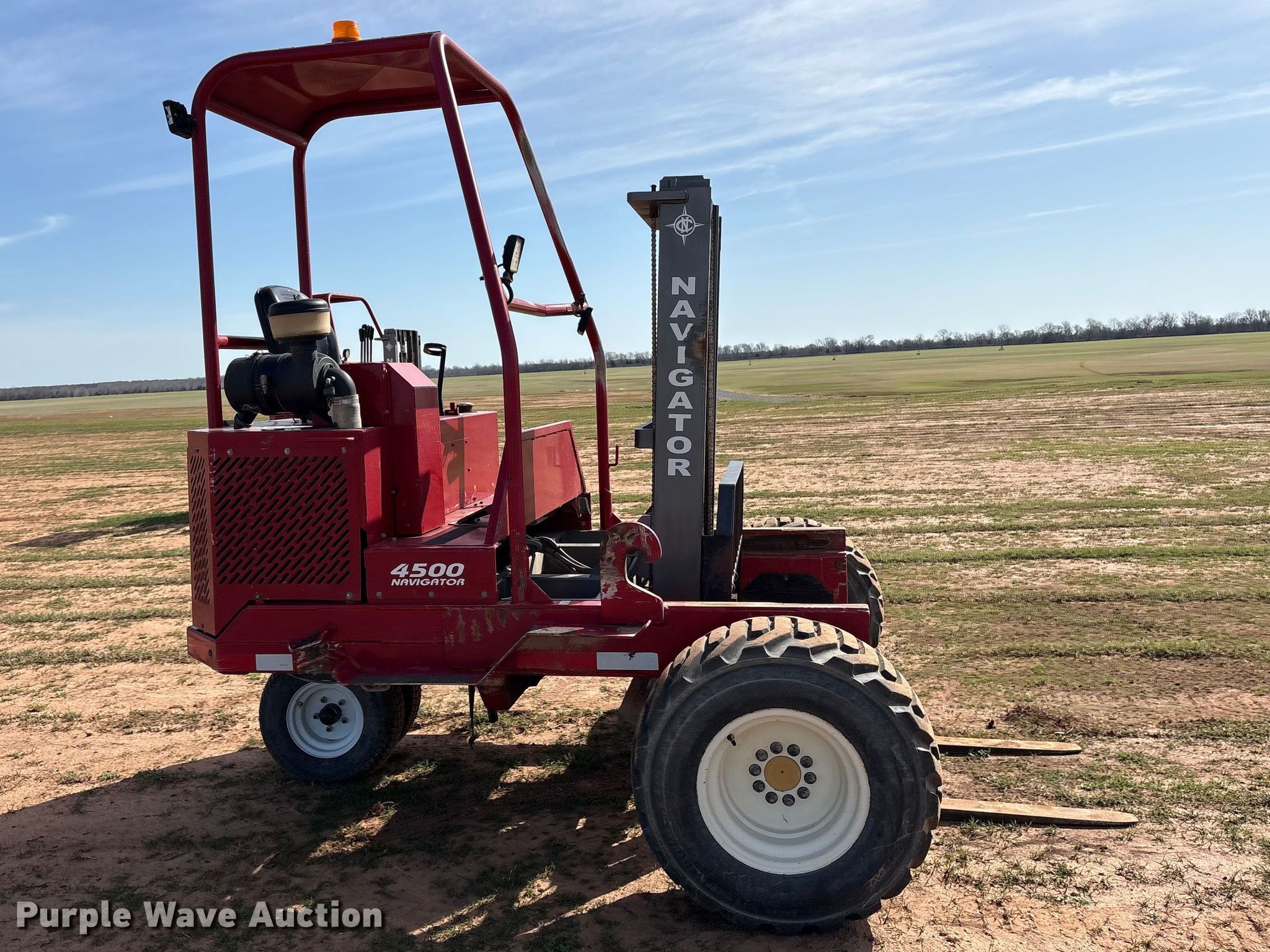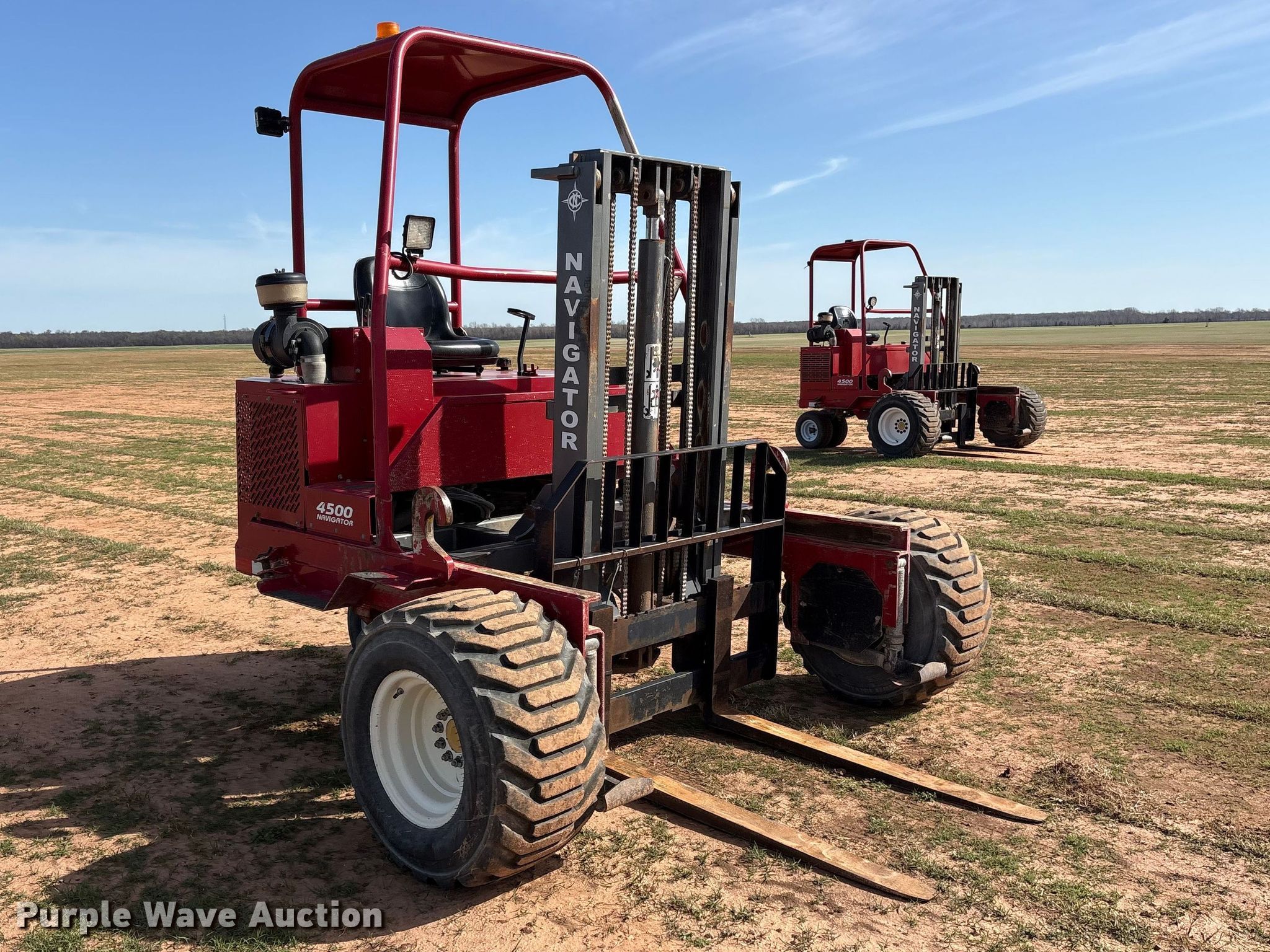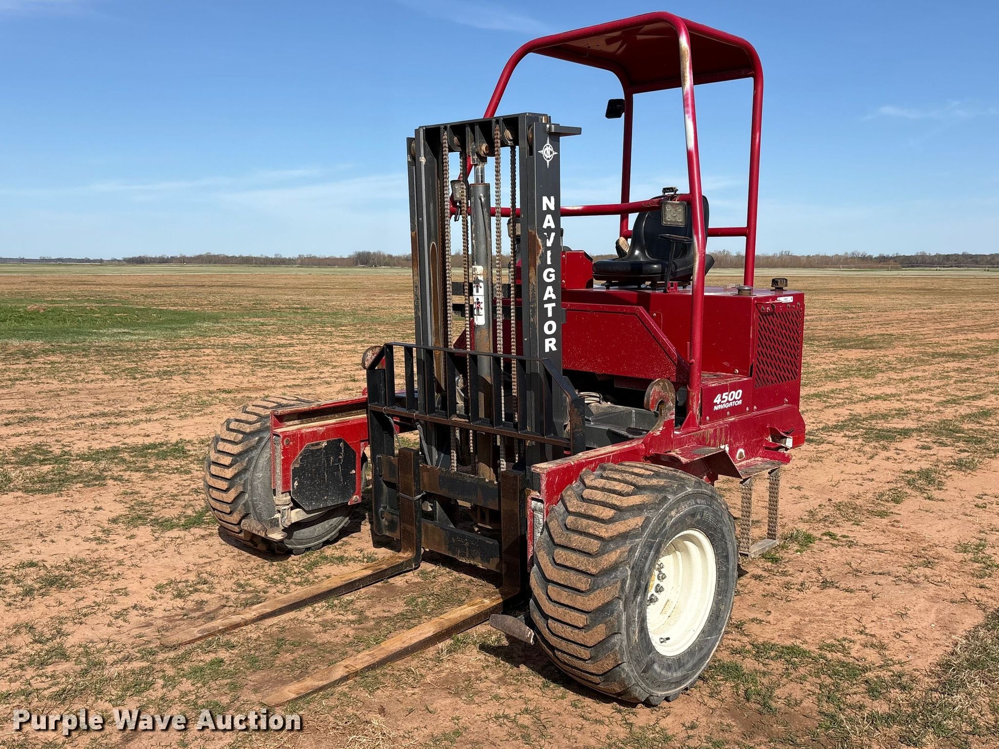 2021 Navigator RT-4500 forklift. Hours: 1,206 on meter, Serial: 1020323405358. Engine Kohler, Cylinders: 3, Fuel type: Diesel. Transmission Hydrostatic. Operators station OROPS, Canopy. Features Maximum lift capacity: 4,500 lbs, Maximum lift height: 96", Collapsed mast height: 81", Mast stages: 2, Mast tilt, Reach / retract, Fork length: 48". Tires Front: 31x15.50-15, Rear: 205/65-10. JKT Farms. Bennington, OK 74723