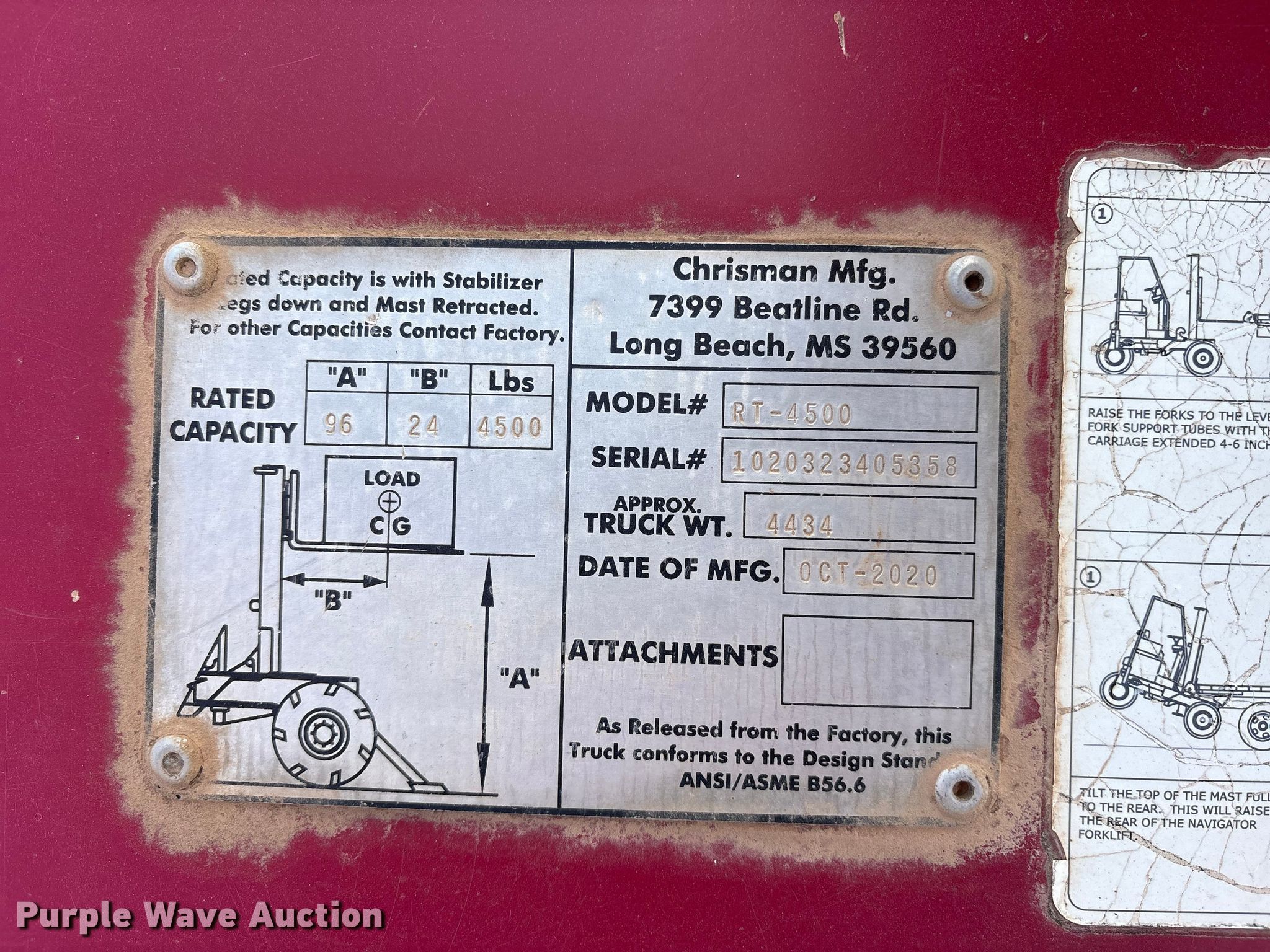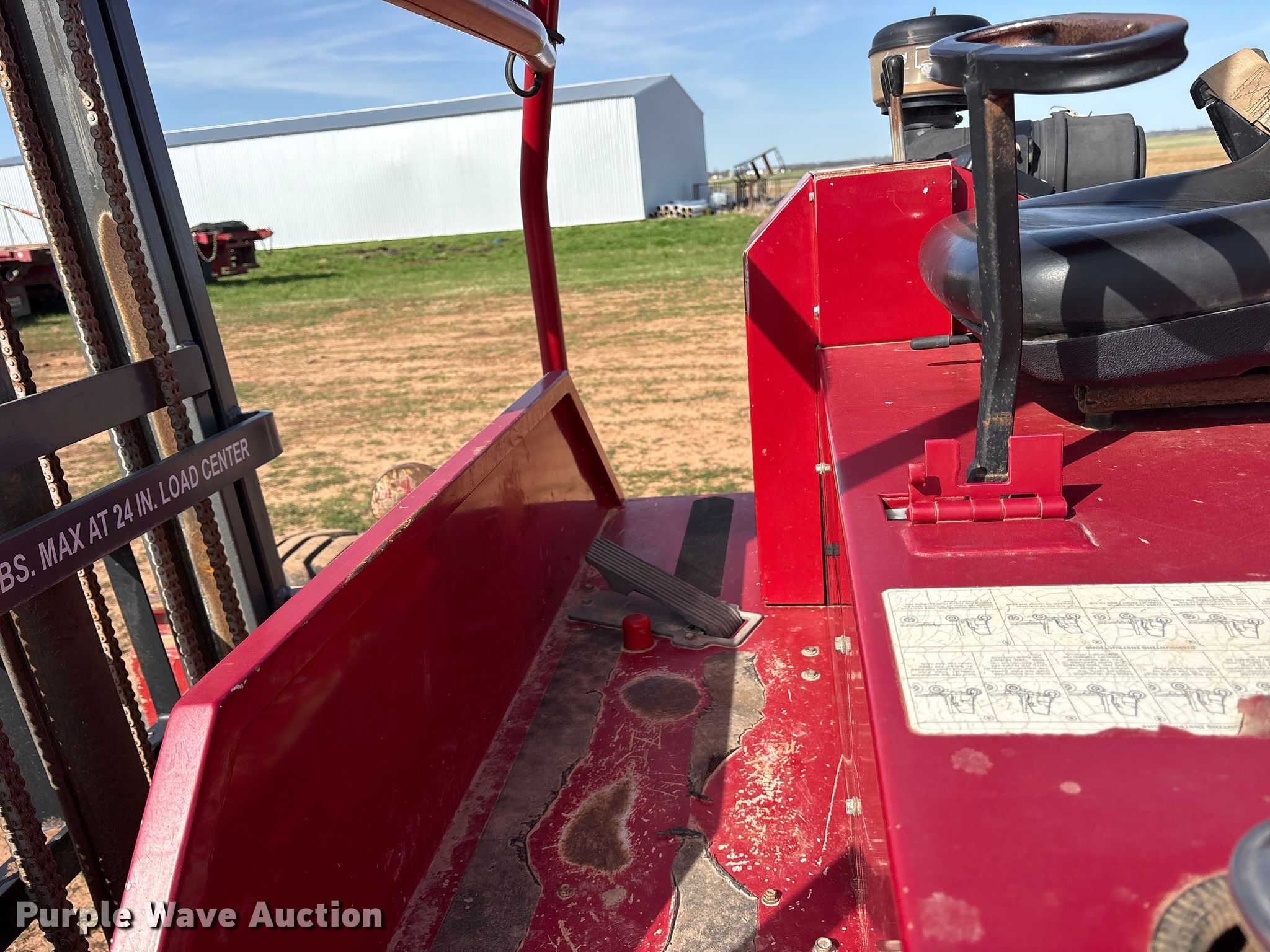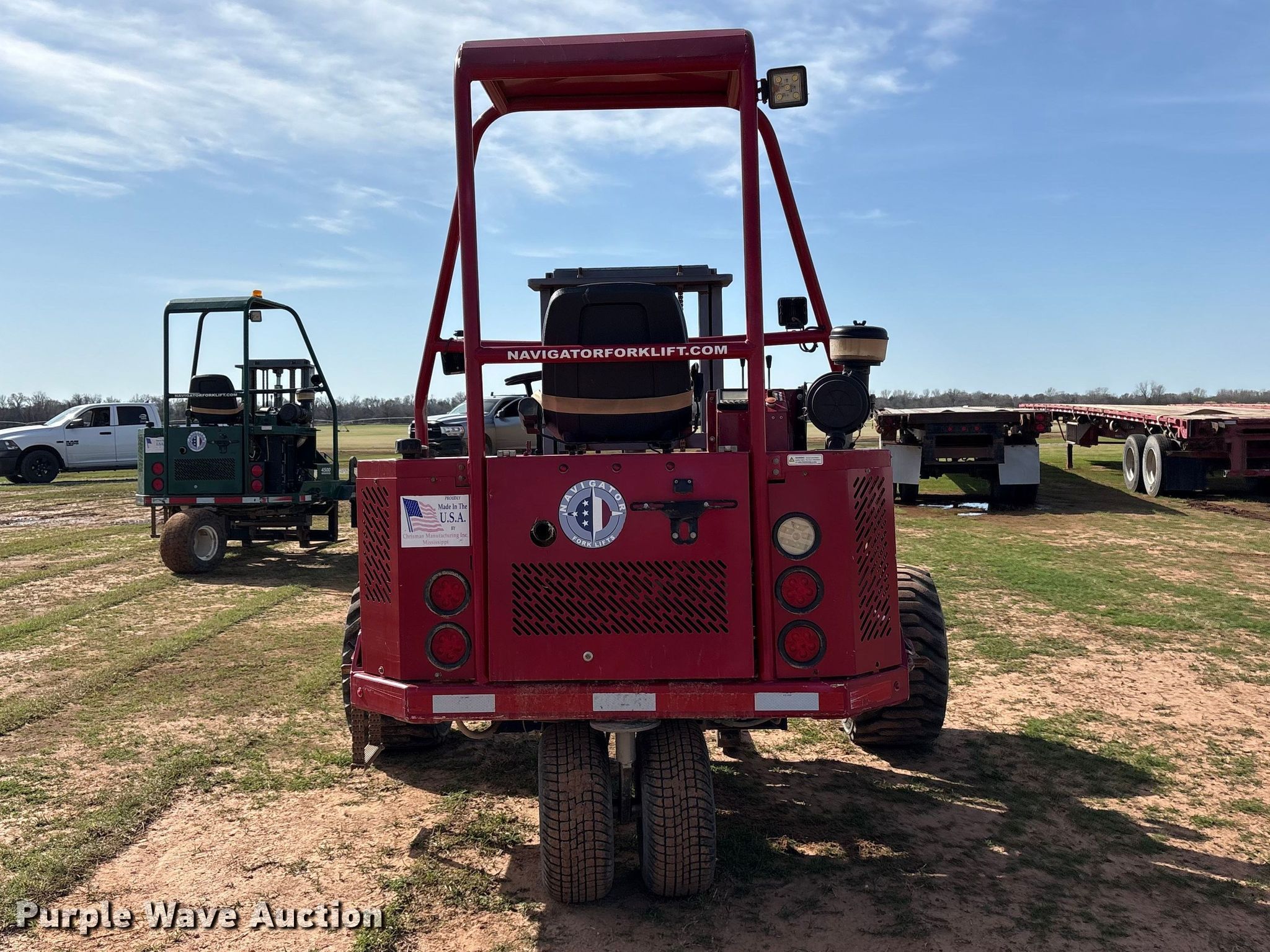 2021 Navigator RT-4500 forklift. Hours: 1,206 on meter, Serial: 1020323405358. Engine Kohler, Cylinders: 3, Fuel type: Diesel. Transmission Hydrostatic. Operators station OROPS, Canopy. Features Maximum lift capacity: 4,500 lbs, Maximum lift height: 96", Collapsed mast height: 81", Mast stages: 2, Mast tilt, Reach / retract, Fork length: 48". Tires Front: 31x15.50-15, Rear: 205/65-10. JKT Farms. Bennington, OK 74723