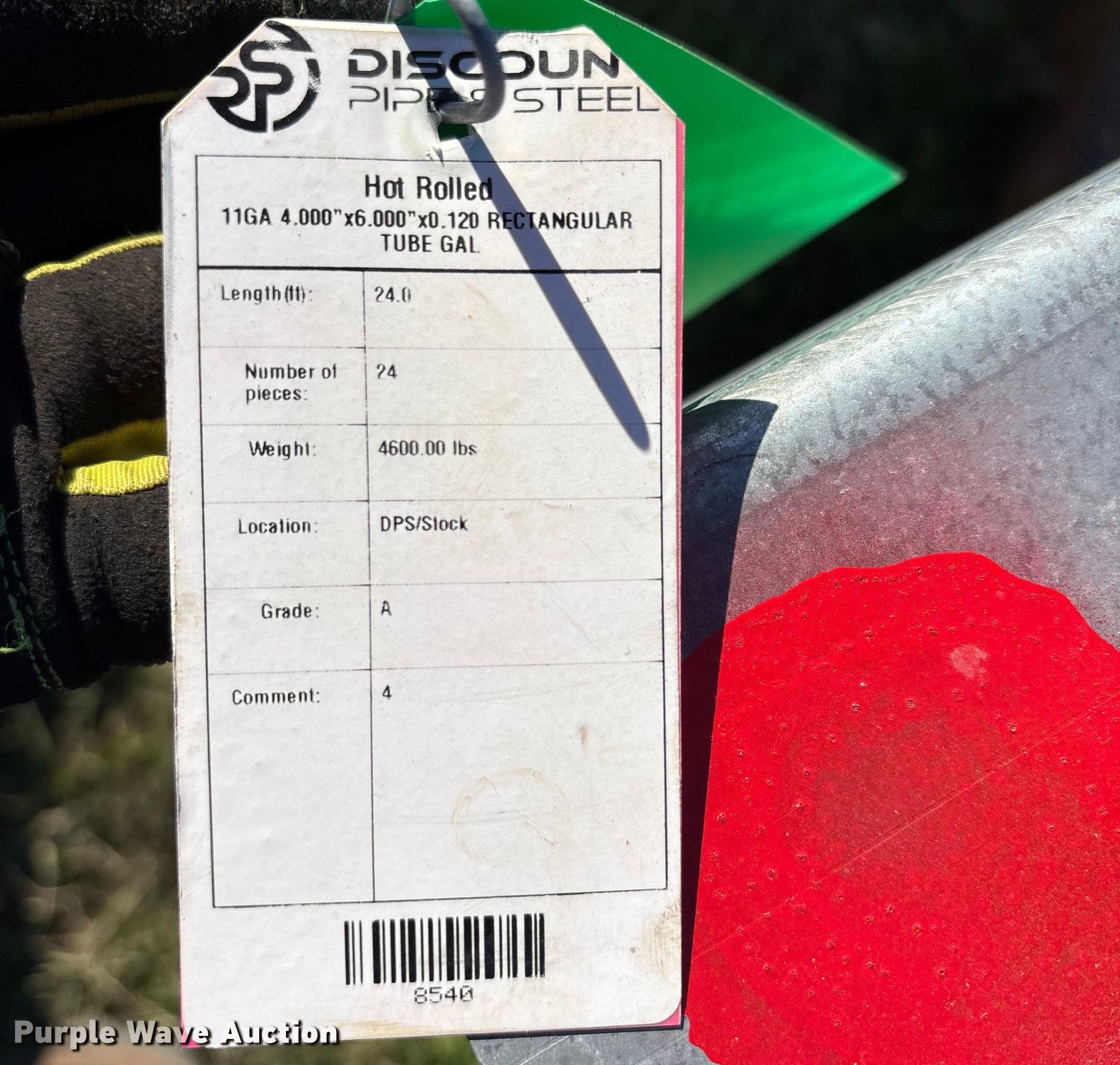 (24) 11 gauge galvanized tubing. Unit #: 8540. Features 4" x 6", Length: 26' 8", Total linear feet: 636, Weight: 4,600 lbs, Hot rolled. Discount Pipe & Steel. Pickton, TX 75471