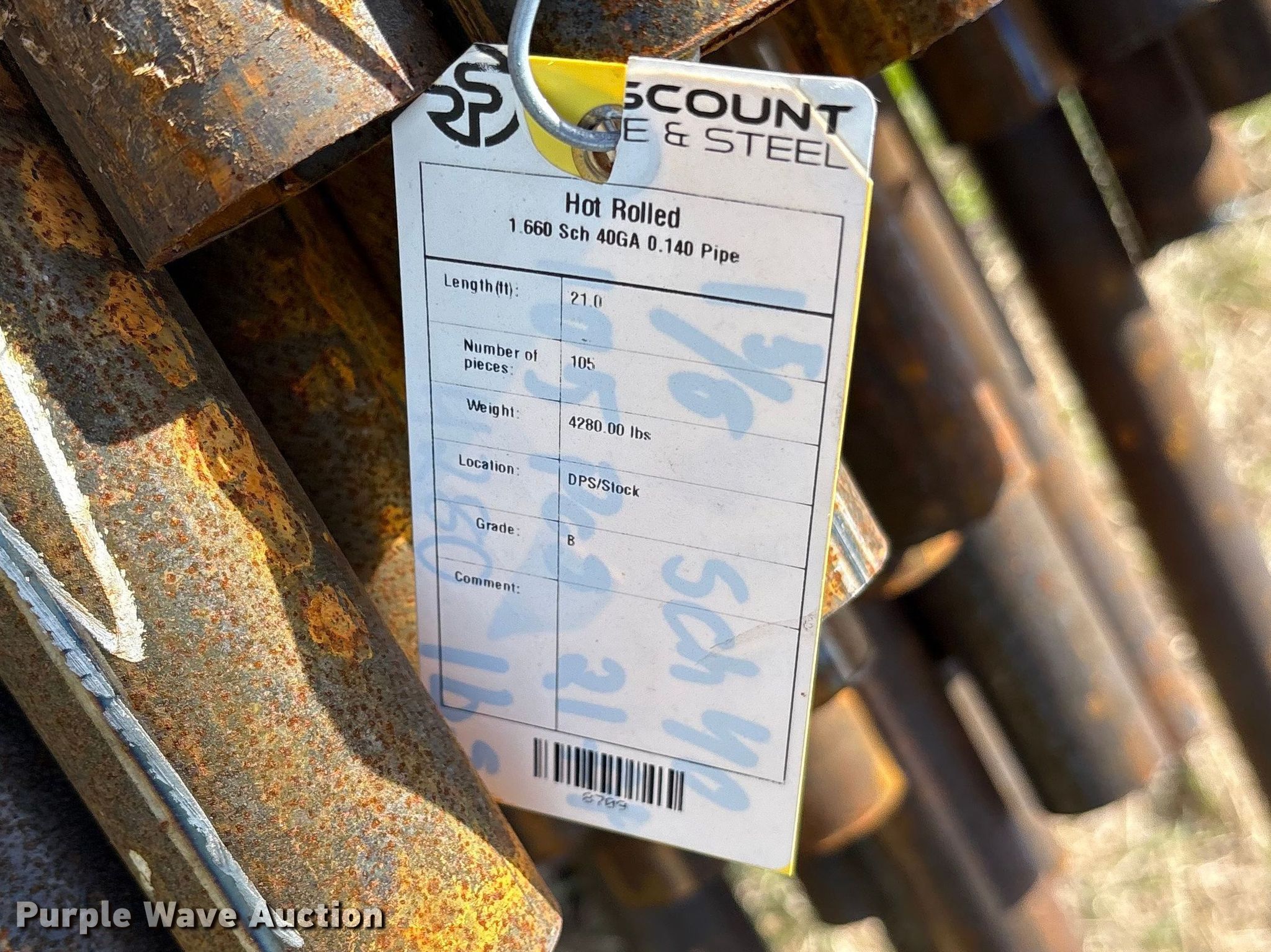 (105) joints of 1.66" diameter x 21' L pipe. Unit #: 8709. Features Schedule: 40, Weight: 4,280 lbs, Hot rolled. Discount Pipe & Steel. Pickton, TX 75471