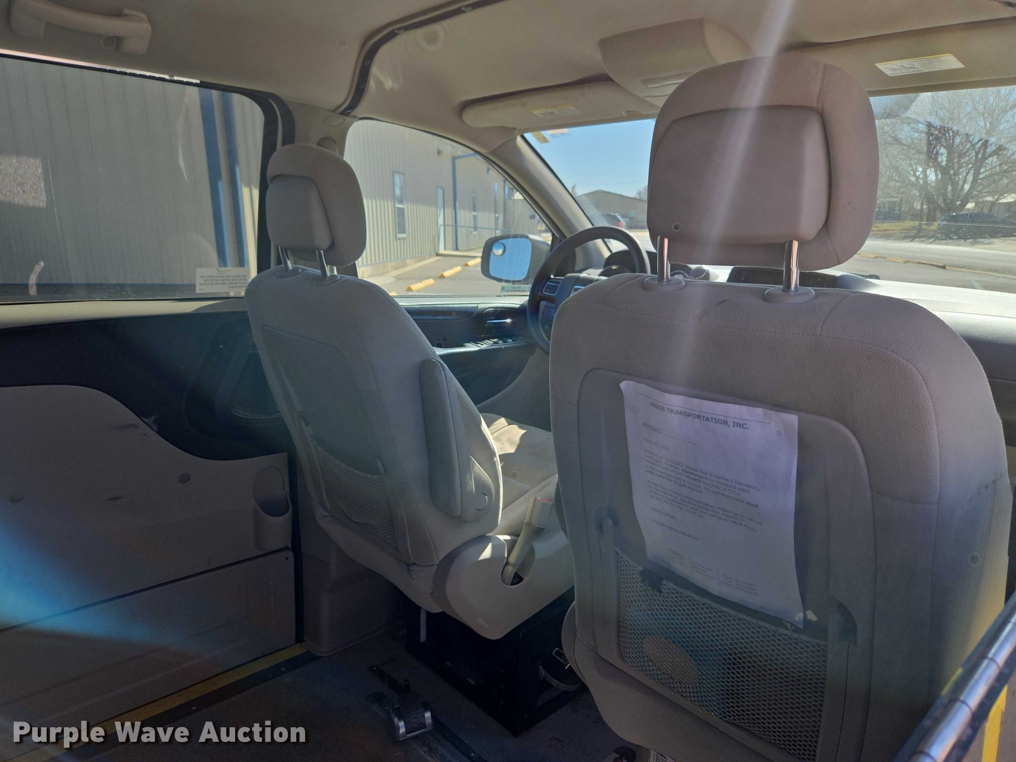 2017 Dodge Grand Caravan handicap accessible van. Miles: 339,791 on odometer, VIN: 2C7WDGBG1HR742235. Engine Displacement: 3.6L, Cylinders: 6, Fuel type: Gas. Transmission Automatic. Interior AC, Heat, Heated mirrors, Power windows, Power locks, Cruise control, Backup camera, Wheelchair lift. Tires Size: 225/65R17. Notes Dash warning indicator: TPMS, Airbag, Jump start required during on-site data collection. Oklahoma title. Title distribution may be delayed up to 30 days from verification of funds. MAGB Transportation, Inc.. Fairview, OK 73737