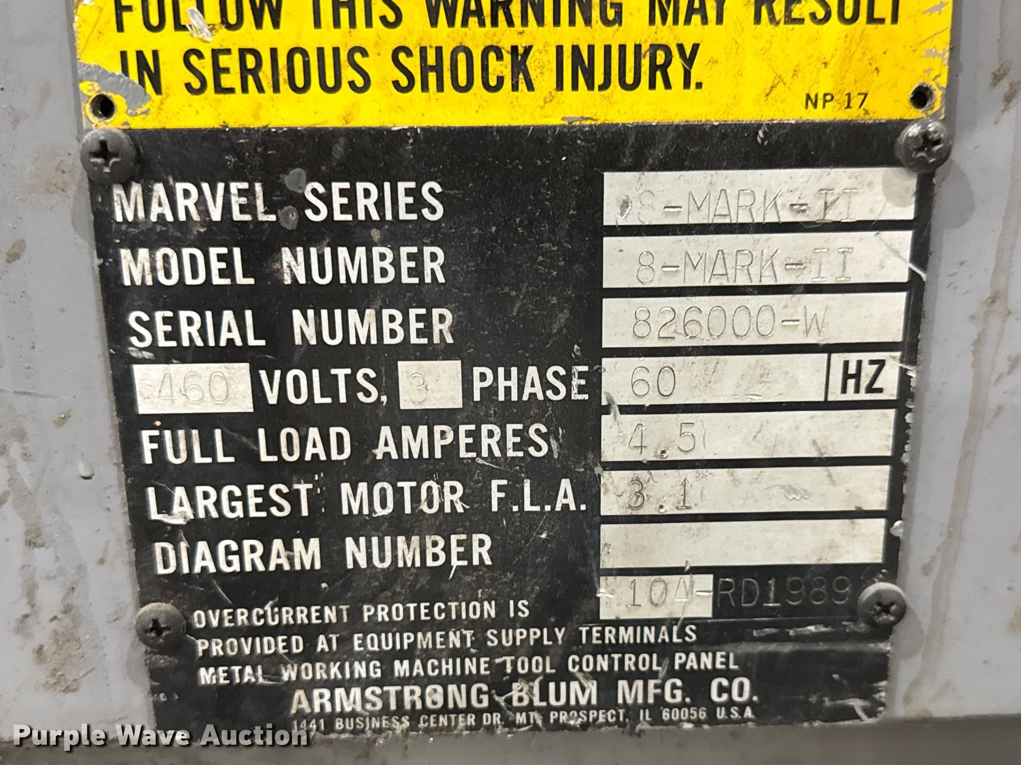 Purple Wave is selling a used Tools in Kansas. This item is a Armstrong Blum Marvel 8 Mark II vertical bandsaw with the following: Serial: 826000-W