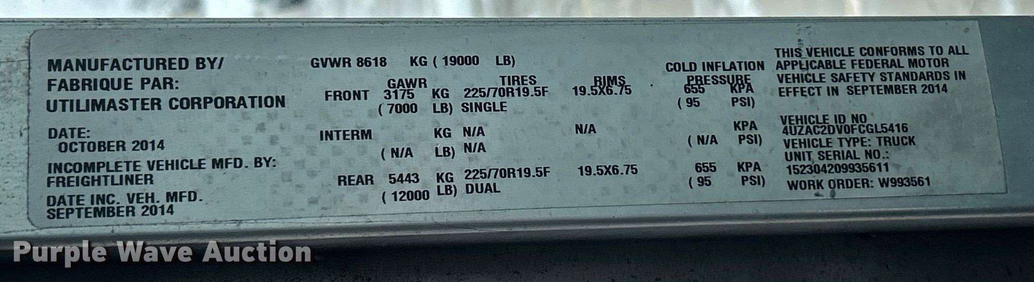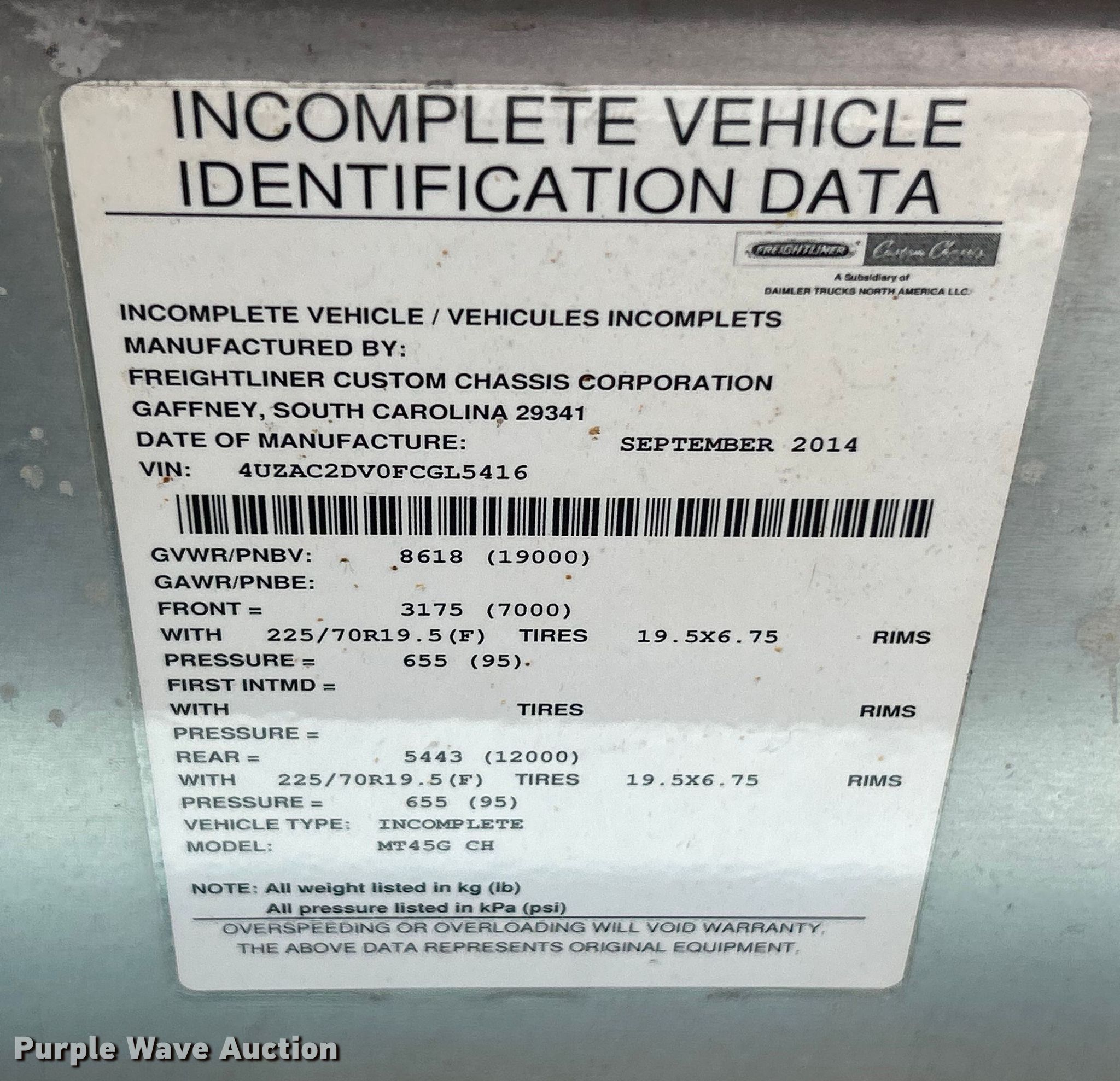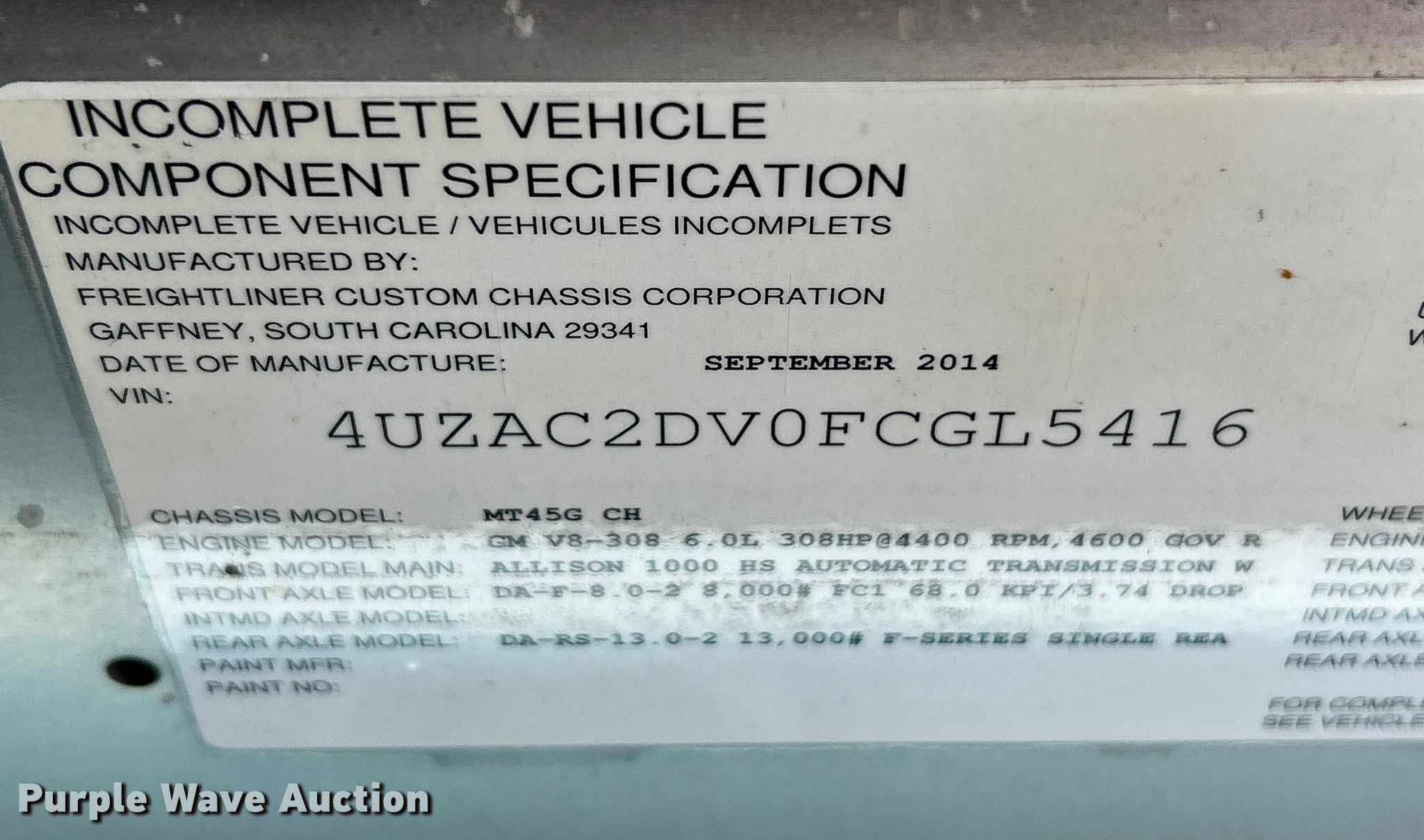 2015 Freightliner MT45 delivery truck. Miles: Unknown, VIN: 4UZAC2DV0FCGL5416. Engine GM, Displacement: 6.0L, Cylinders: 8, Fuel type: CNG. Transmission Automatic. Chassis Axles: Single, Suspension: Spring, Brakes: Hydraulic, GVWR: 19,000 lbs. Interior AC, Heat. Features Bed Length: 20', Width: 85", Height: 79", Floor: Aluminum, End gate lift, Tommy Gate. Tires Size: 225/70R19.5. Notes Lift gate issues, will not retract, Possible wiring issues, Possible crank module issues, Non-operational unit Unit must be towed or hauled. Missouri title. Mileage has not been verified. Odometer discrepancy will be marked on the title. Title distribution may be delayed up to 30 days from verification of funds. Clean The Uniform Co. Troy, IL 62294