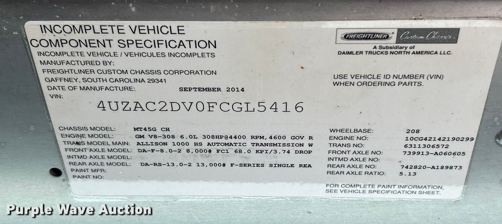 Purple Wave is selling a used Delivery Truck or Van in Illinois. This item is a 2015 Freightliner MT45 delivery truck with the following: Miles: Unknown, VIN: 4UZAC2DV0FCGL5416