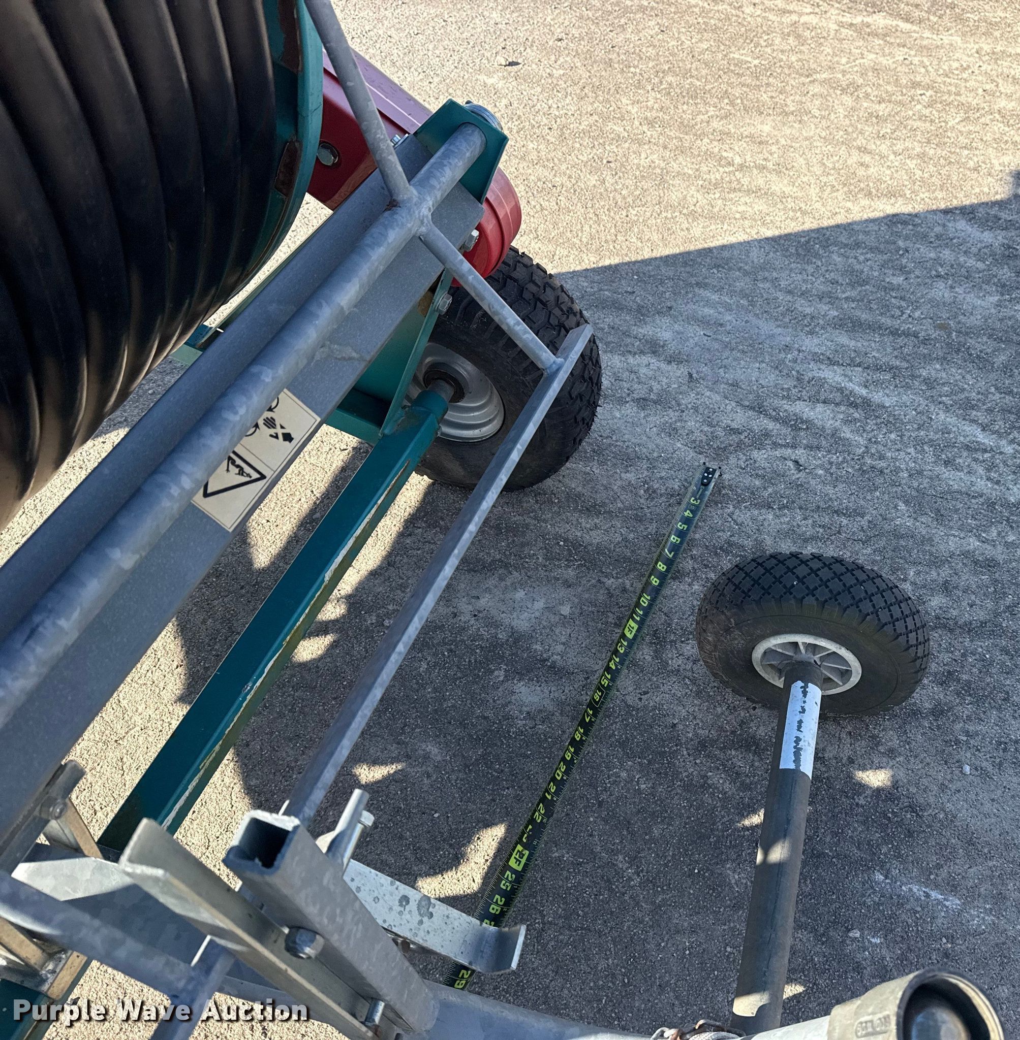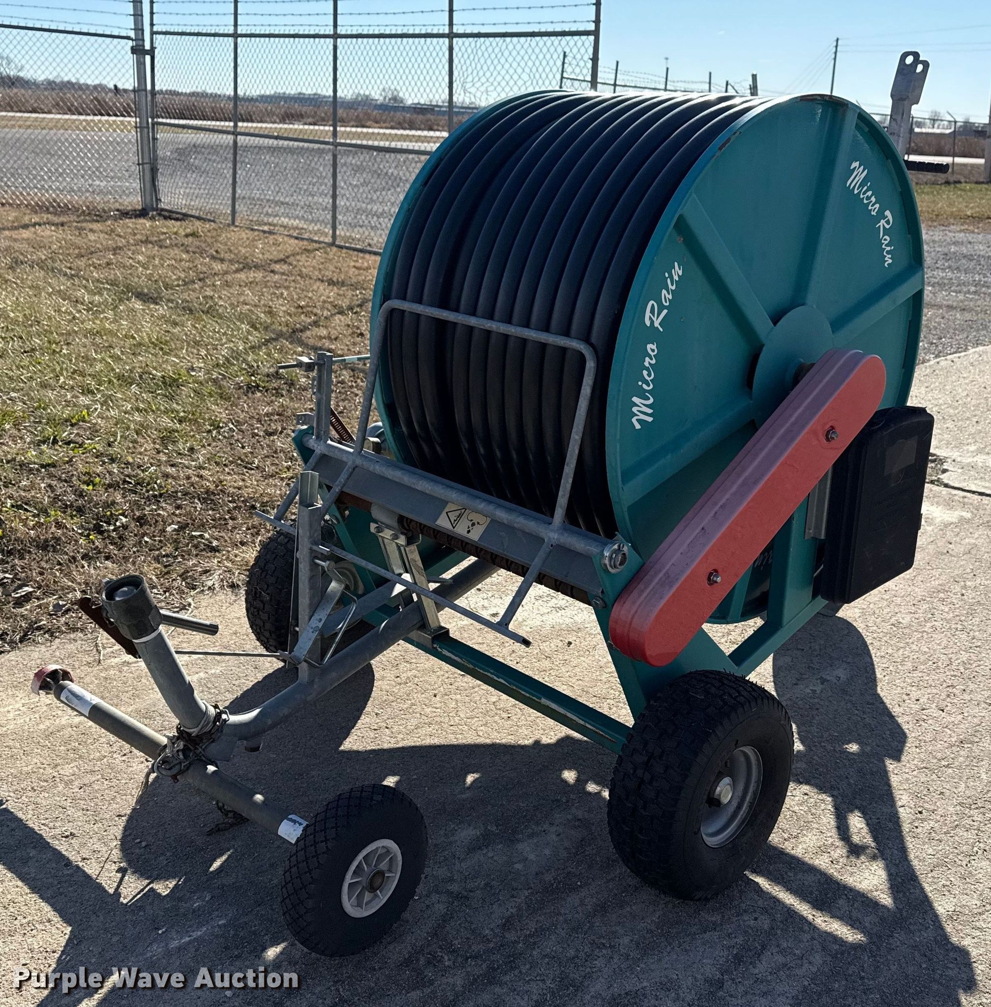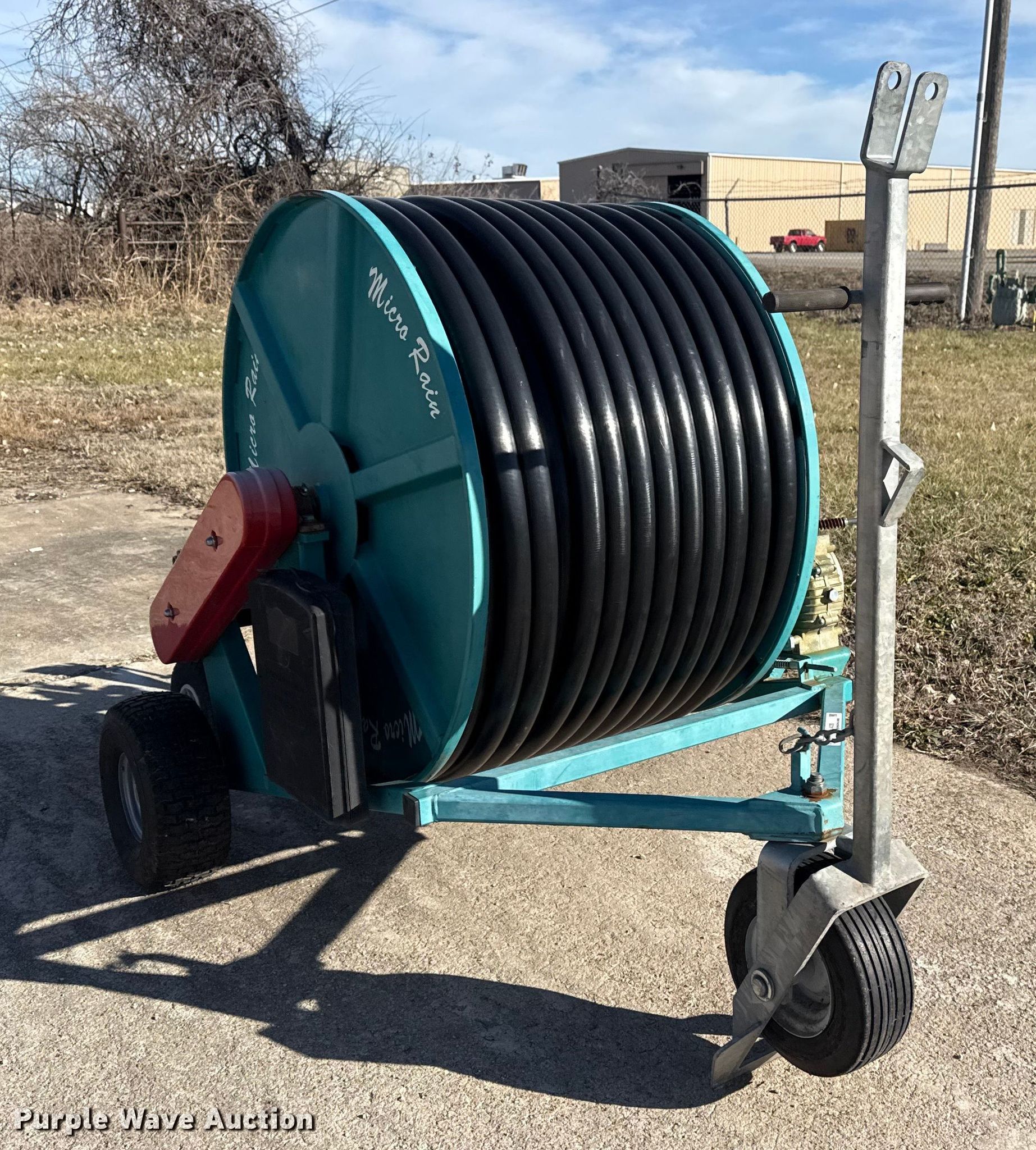 Purple Wave is selling a used Hose Reel in Oklahoma. This item is a Micro Rain hose reel with the following: Reel width: 25 1/2", Outlet valve: 2 1/2", Hitch: Pin, Hose diameter: 1 3/4"