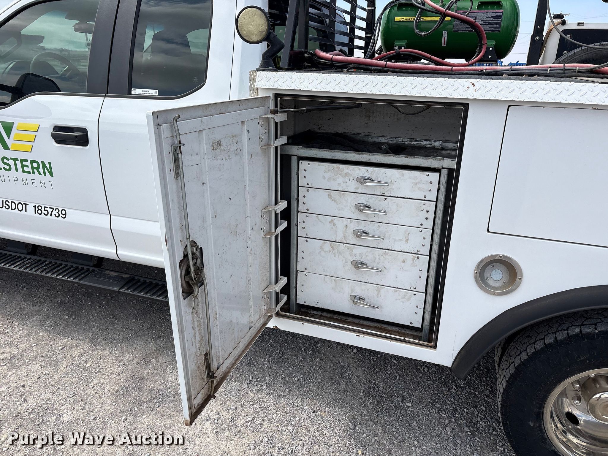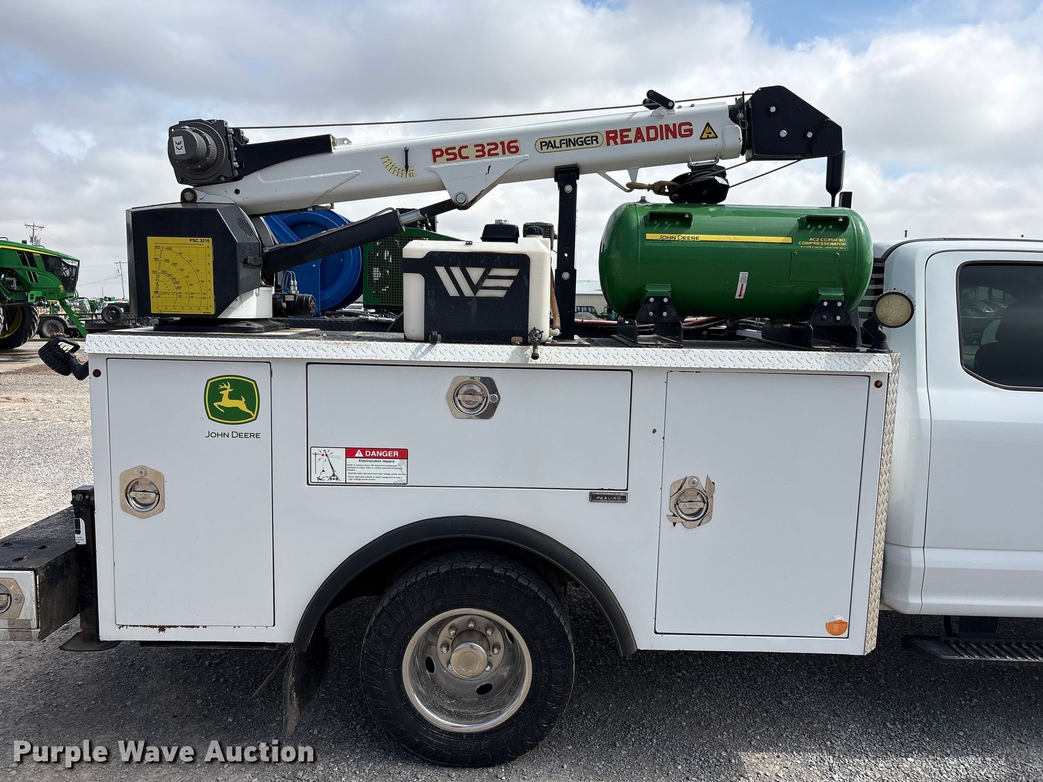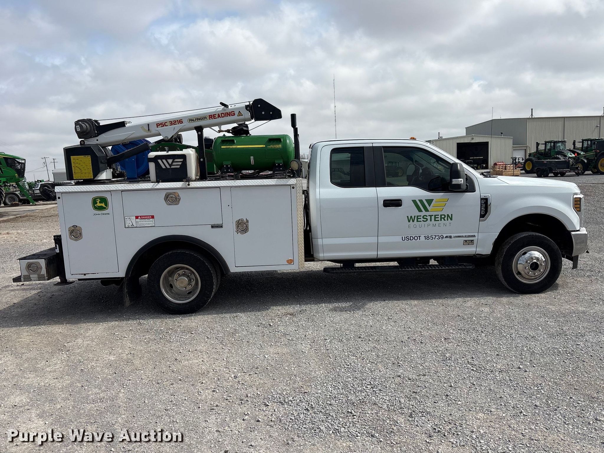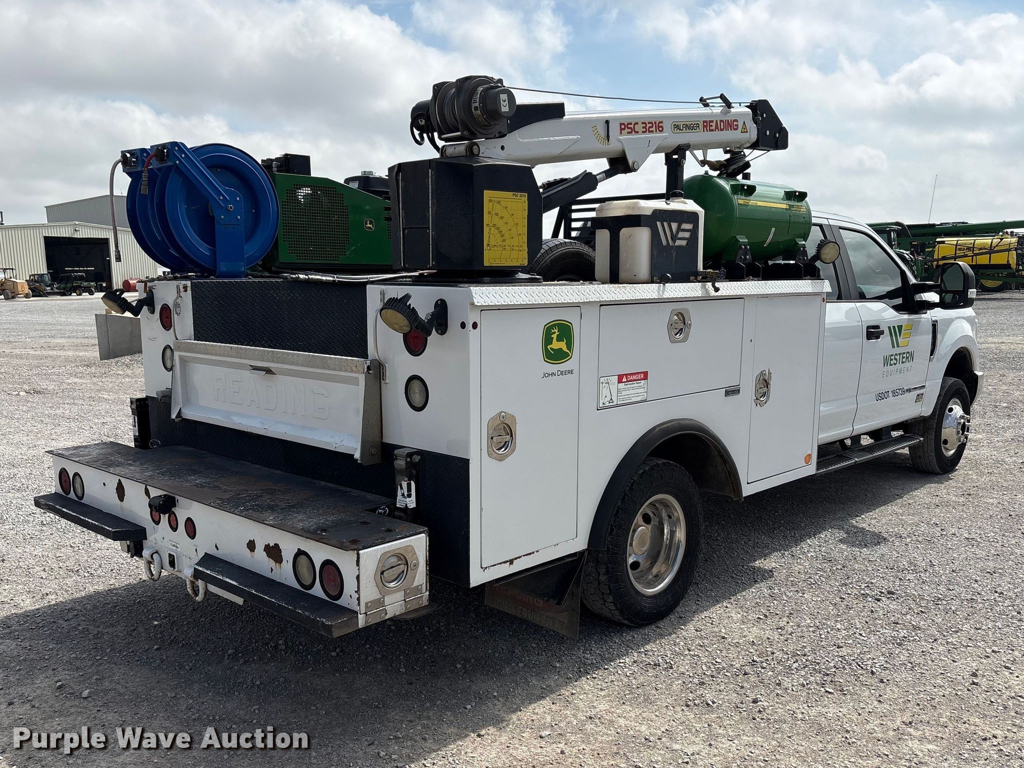 2018 Ford F350 Super Duty XL Ext. Cab utility bed pickup truck. Miles: 193,379 on odometer, VIN: 1FD8X3HT5JEC94512. Engine Ford, Displacement: 6.7L, Cylinders: 8, Fuel type: Diesel. Transmission Automatic. Chassis Four wheel drive, Axles: Single, Brakes: Hydraulic. Interior AC, Heat, Heated mirrors, Power windows, Power locks, Cruise control, Backup camera, Auxiliary controls, Brake controller. Features Bed Utility bed, Reading MM14212A, Serial: 180130035, Length: 11' 8", Width: 8' 1", Torch bottle rack Tanks not included, Generator John Deere AC2-CG35H-30, Fuel type: Gas, 240V outlets: 1, 120V outlets: 2, Watts: 3,500, Air compressor Compresserator AC2-CG35H-30, Honda GX390, Crane Reading PSC 3216, Maximum boom length: 15' Maximum lift capacity: 4,000 lbs.. Tires Size: 245/75R17. Notes Dash warning indicator: TPMS, Emissions system modified, DPF deleted, DEF deleted, Non-operational crane, backup camera. Oklahoma title. Title distribution may be delayed up to 14 days from verification of funds. Western Lease LLC. Amarillo, TX 79119