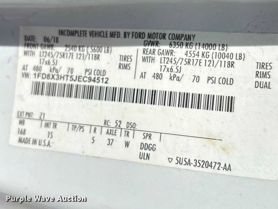 - VIN: 1FD8X3HT5JEC94512