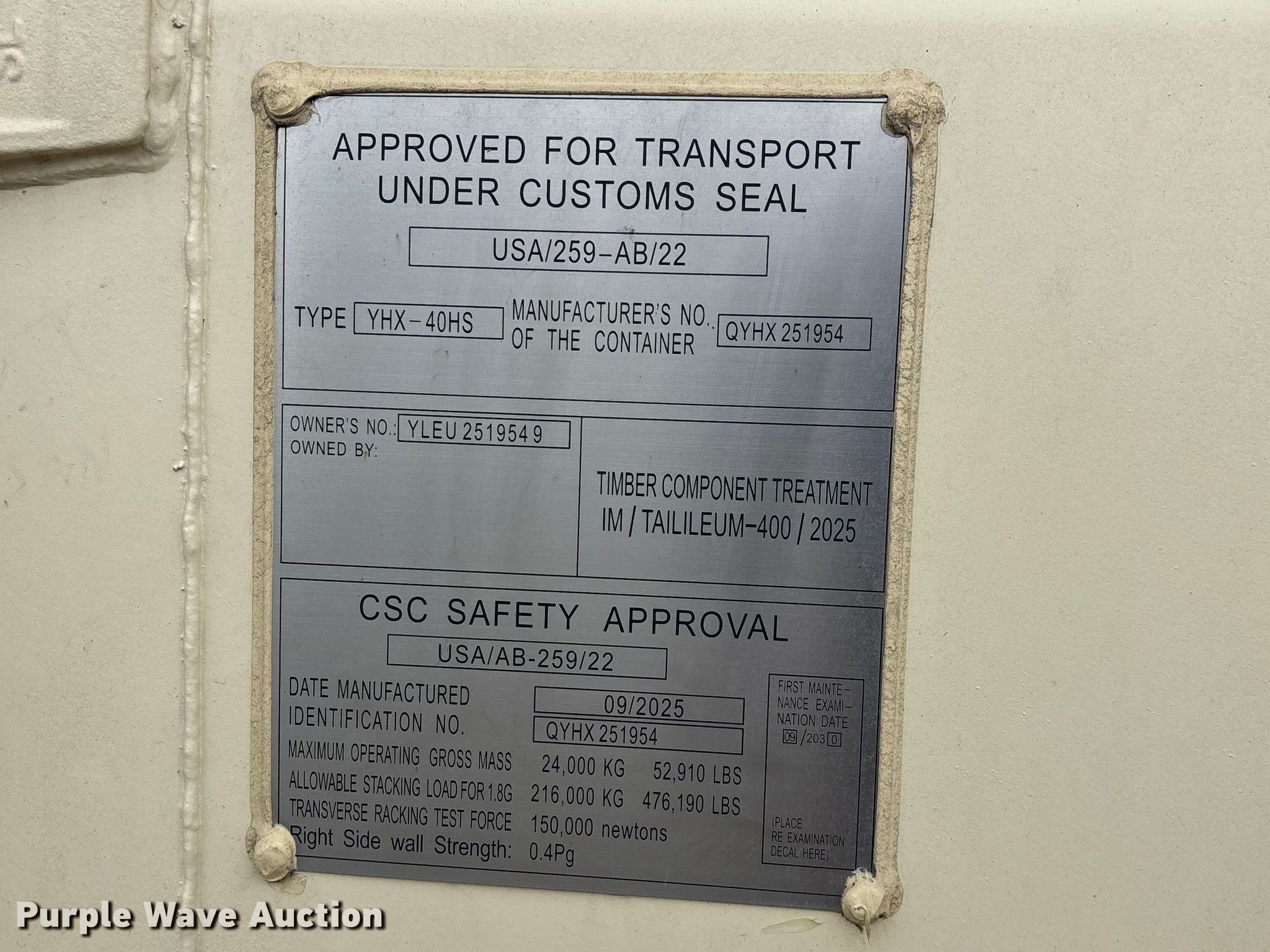 Purple Wave is selling a used Storage or Shipping Container in Oklahoma. This item is a Shipping container with the following: Serial: QYHX251954, Unit #: YLEU 2251954