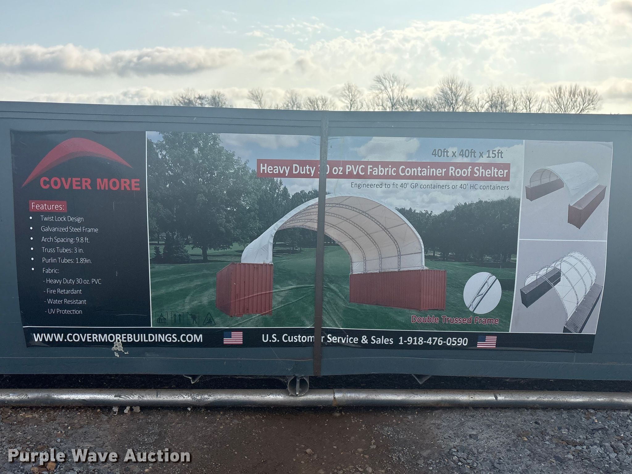 Purple Wave is selling a used Building Materials in Oklahoma. This item is a Cover More C4040S container shelter with the following: 40' x 40' x 15'