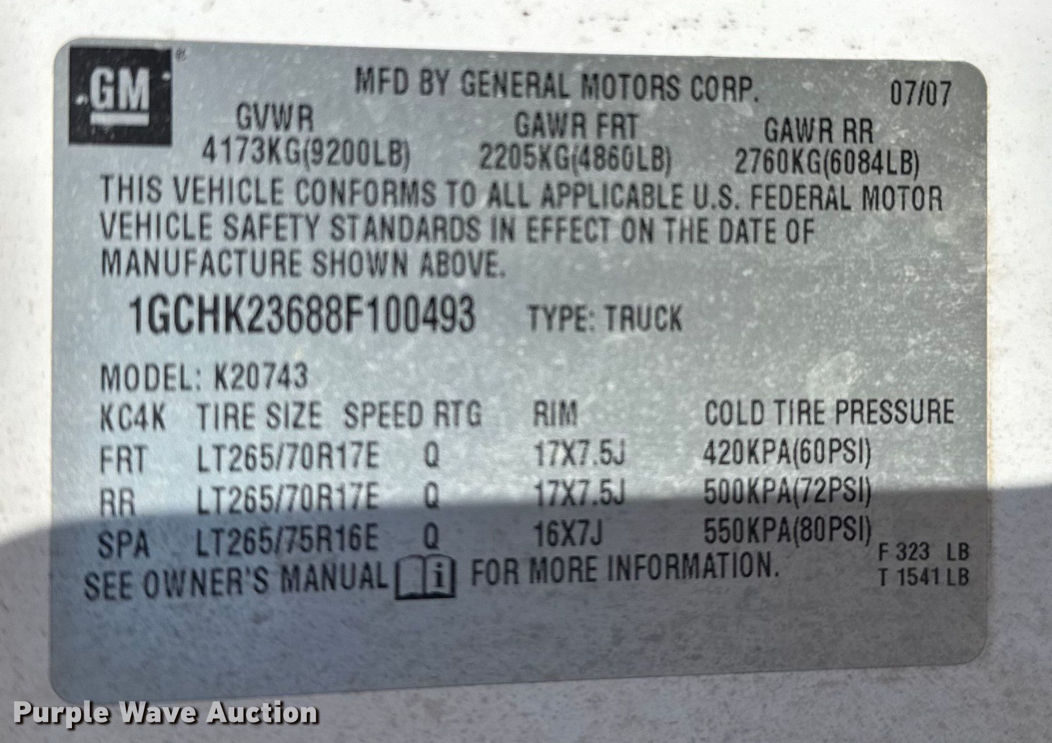 2008 Chevrolet Silverado 2500HD Crew Cab pickup truck. Miles: 408,389 on odometer, VIN: 1GCHK23688F100493. Engine Displacement: 6.6L, Cylinders: 8, Fuel type: Diesel. Transmission Automatic, Four wheel drive. Interior AC, Heat, Seat: Heated, Power driver, Power passenger, Heated mirrors, Power windows, Power locks, Cruise control. Features Hitch: Gooseneck. Tires Size: 265/70R17. Notes Dash warning indicator: Check engine, TPMS, Hail damage. Kansas title. Title has a lien that will be released following the close of the auction. Title distribution may be delayed up to 30 days from verification of funds. Healy, KS 67850
