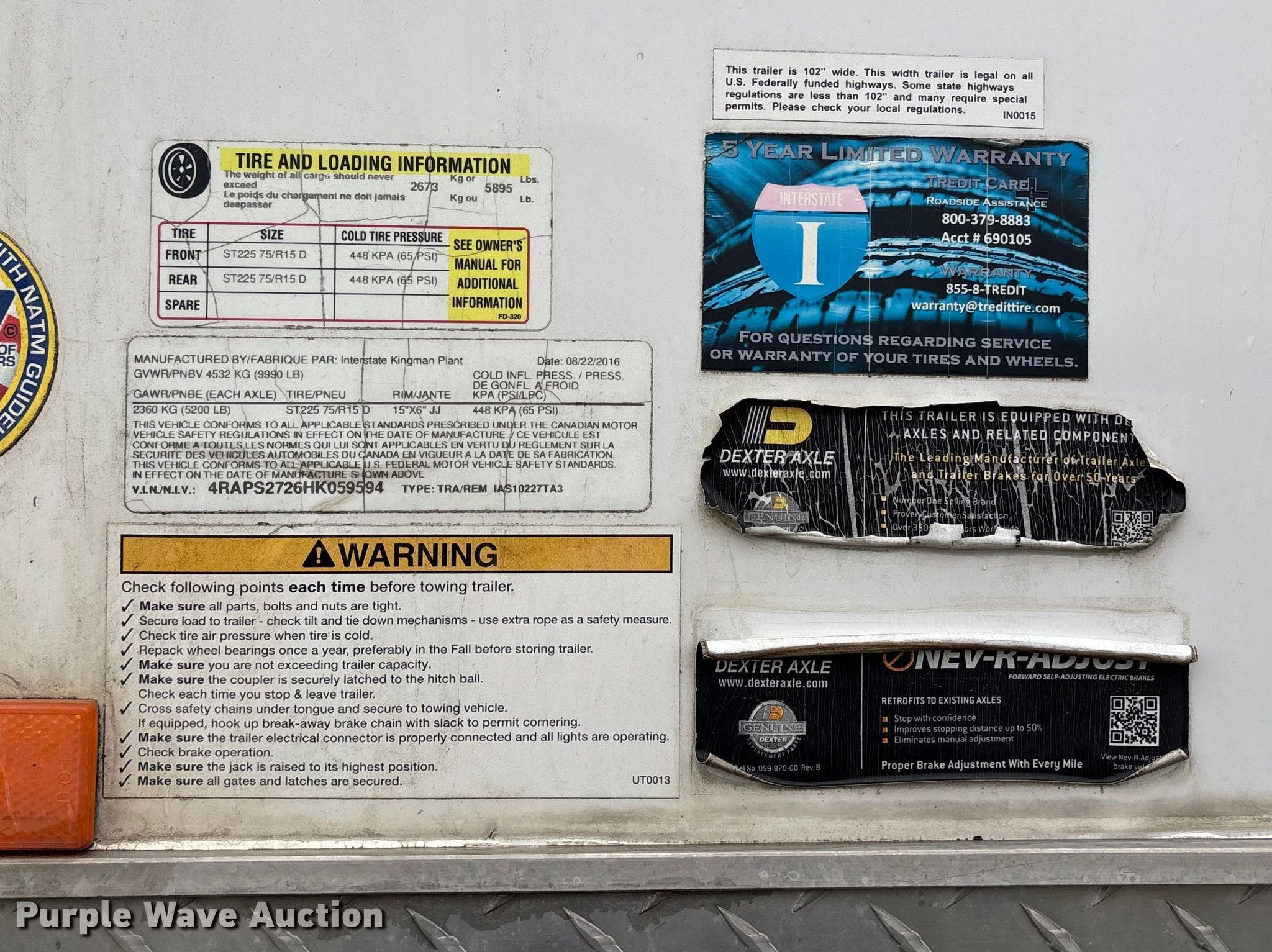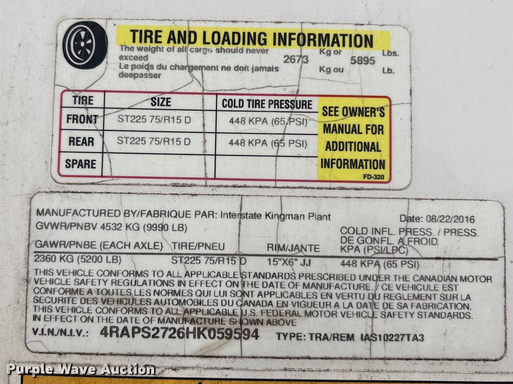 2017 Interstate Kingman Pro Series enclosed snowmobile trailer. VIN: 4RAPS2726HK059594. Dimensions Overall Length: 29', Width: 98", Deck Length: 319", Width: 92", Ramps: Manual Length: 87". Features Deck type: Wood. Chassis Ball hitch: 2 5/16", Suspension: Torsion, Brakes: Electric, Axles: Tandem, GVWR: 9,990 lbs, GAWR: 5,200 lbs. Tires Aluminum wheels, Size: 225/75R15. Missouri title. Title distribution may be delayed up to 14 days from verification of funds. M & M UTILITIES L L C. Chillicothe, MO 64601