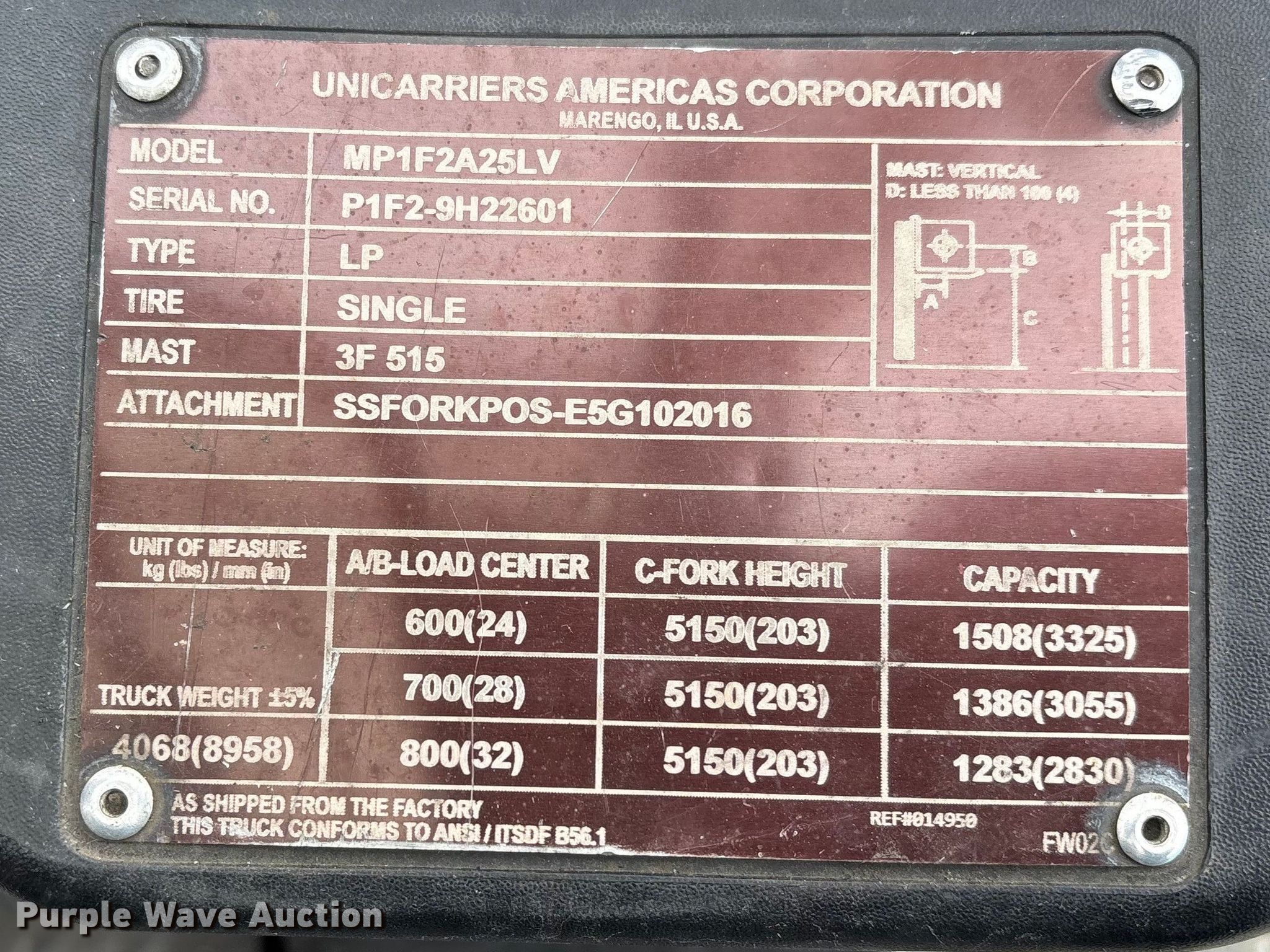 Purple Wave is selling a used Cushion Tire or Pneumatic Forklift in Washington. This item is a 2017 UniCarriers PF50 forklift with the following: Hours: 8,616 on meter, Miles or hours may vary, unit still in use, Serial: P1F2-9H22601, Unit #: SFS3014